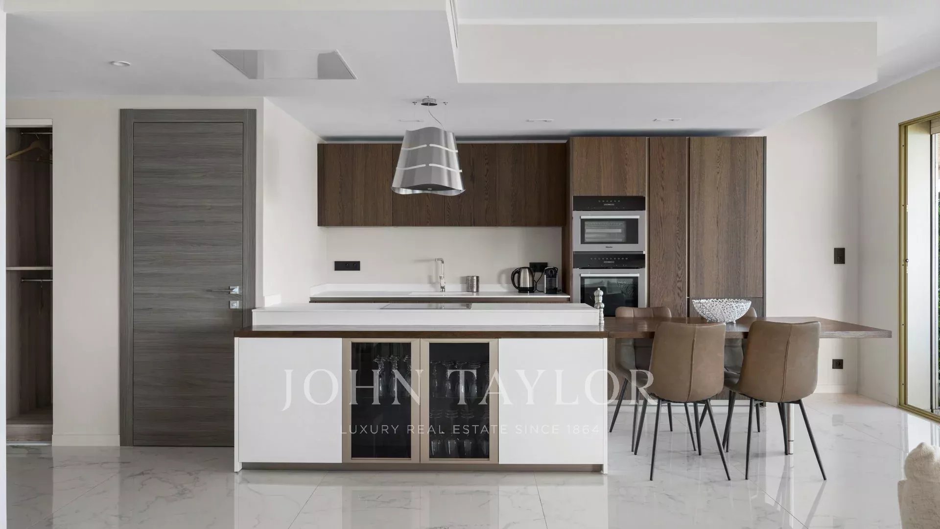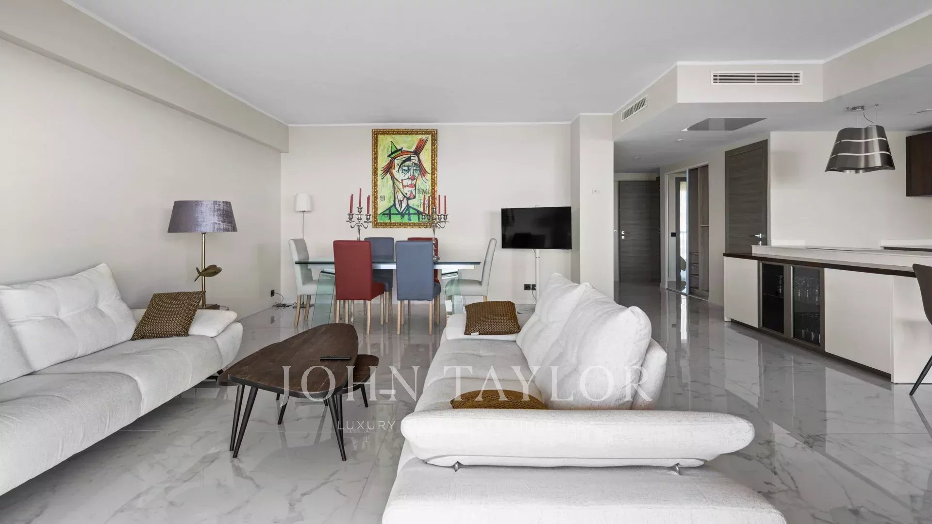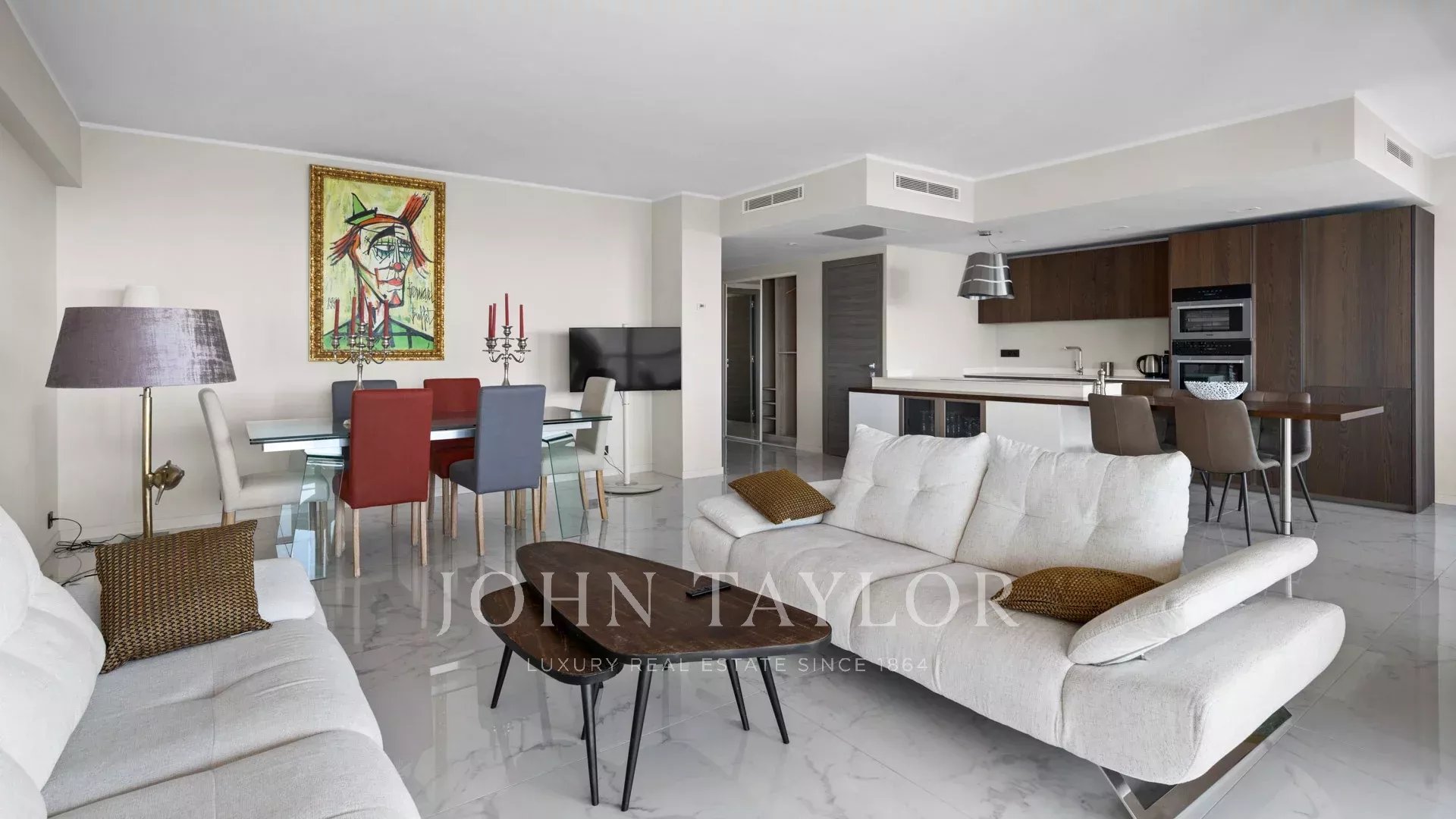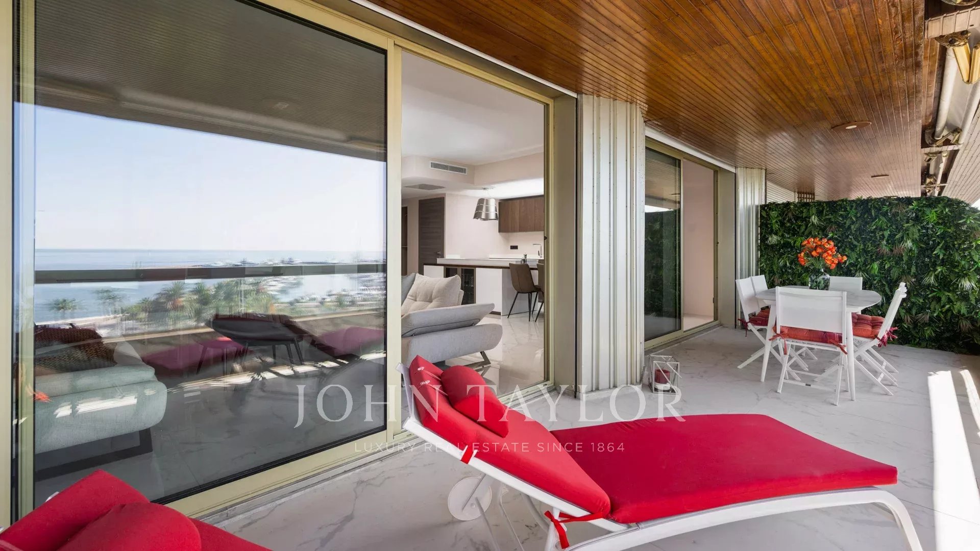 Pièce de réception avec salon, salle à manger et cuisine aménagée s'ouvrant sur la terrasse.