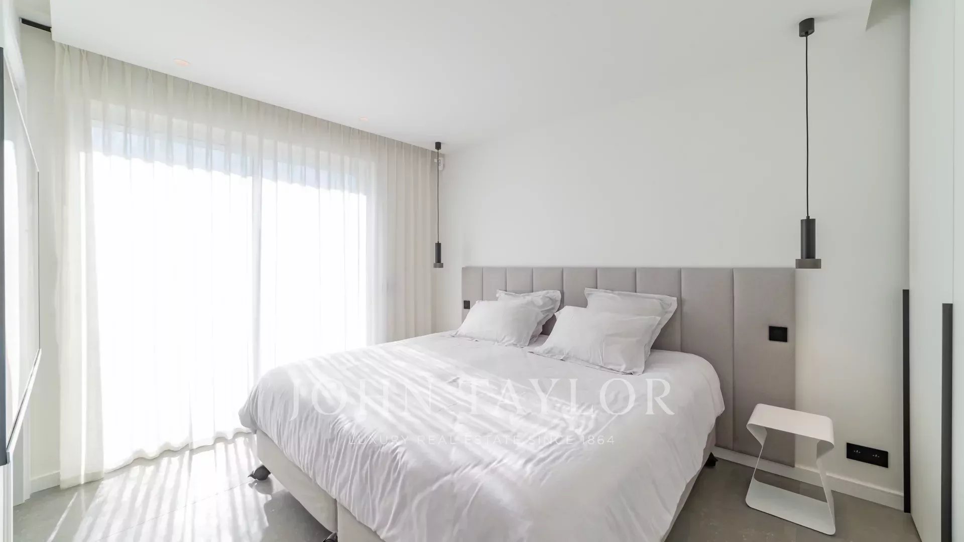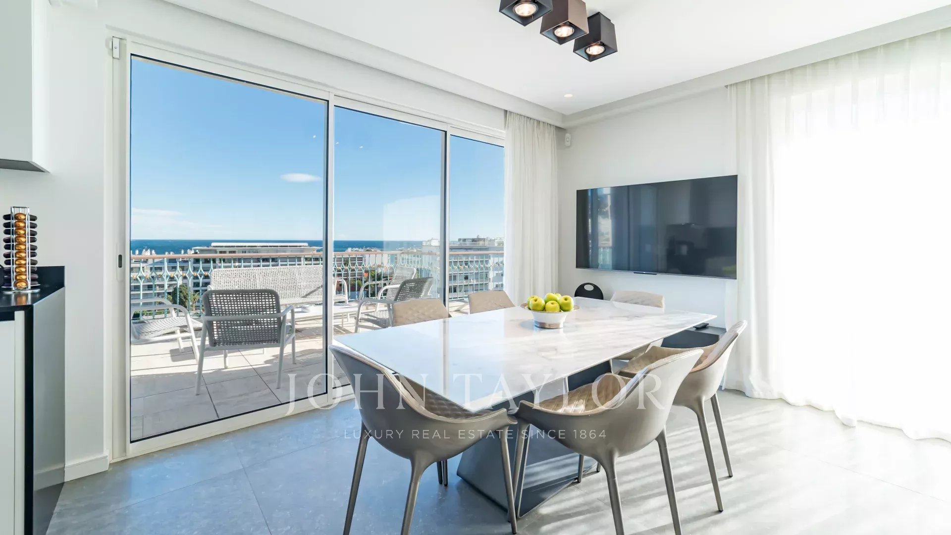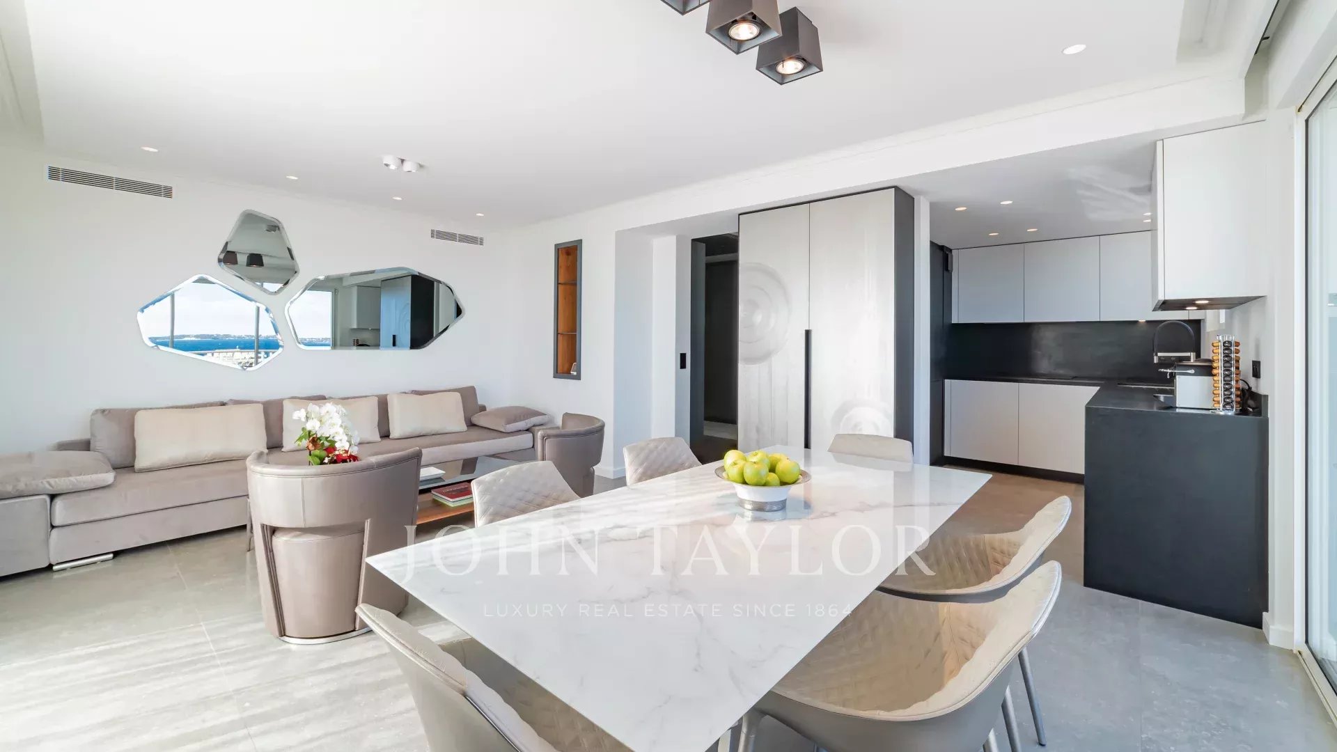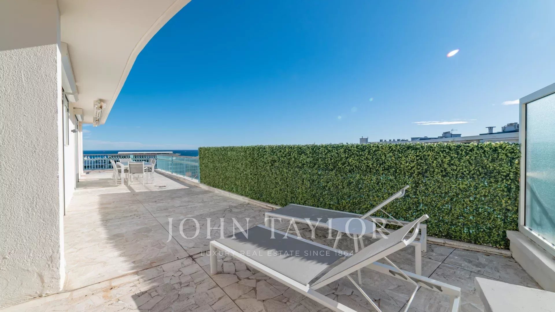 Entièrement rénové, l'appartement séduit par sa décoration, ses prestations haut de gamme et sa belle et grande terrasse d'environ 220 m2 aménagée de salons, transats et table à manger.