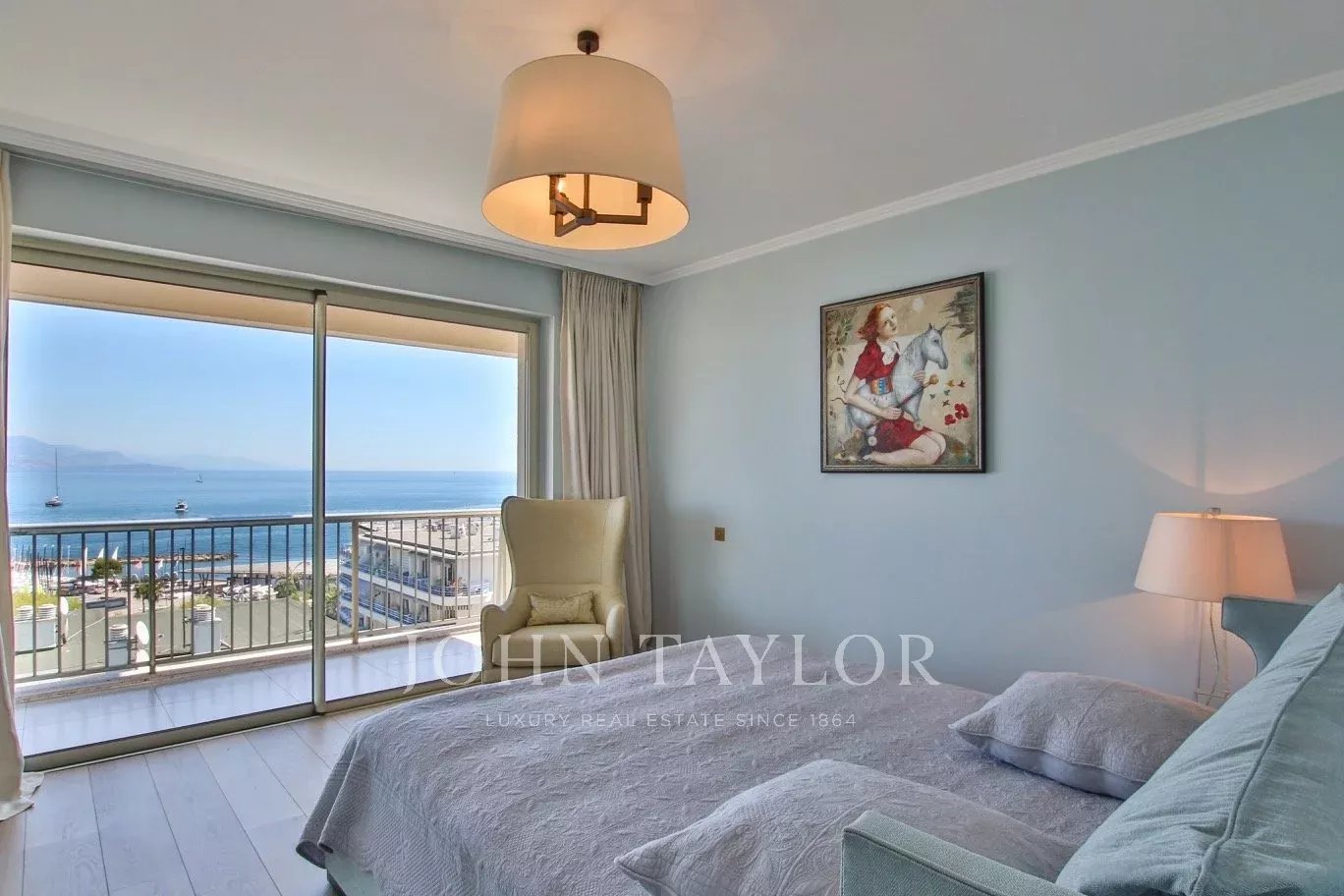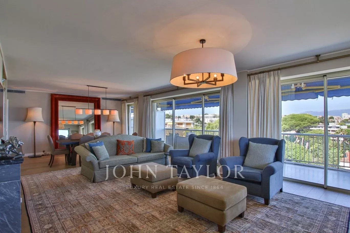Hall d'entrée, un double séjour avec la vue Mer, le vieil Antibes et le montagnes, un bureau, trois chambres avec salles de bains et WC et une cuisine équipée.