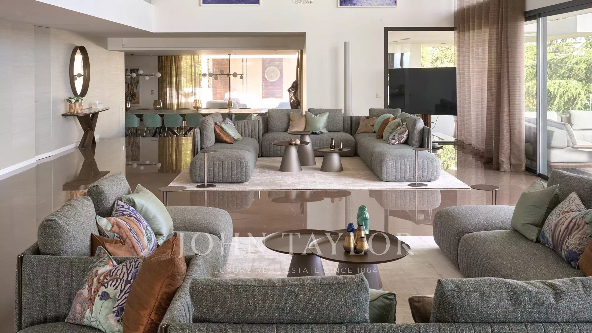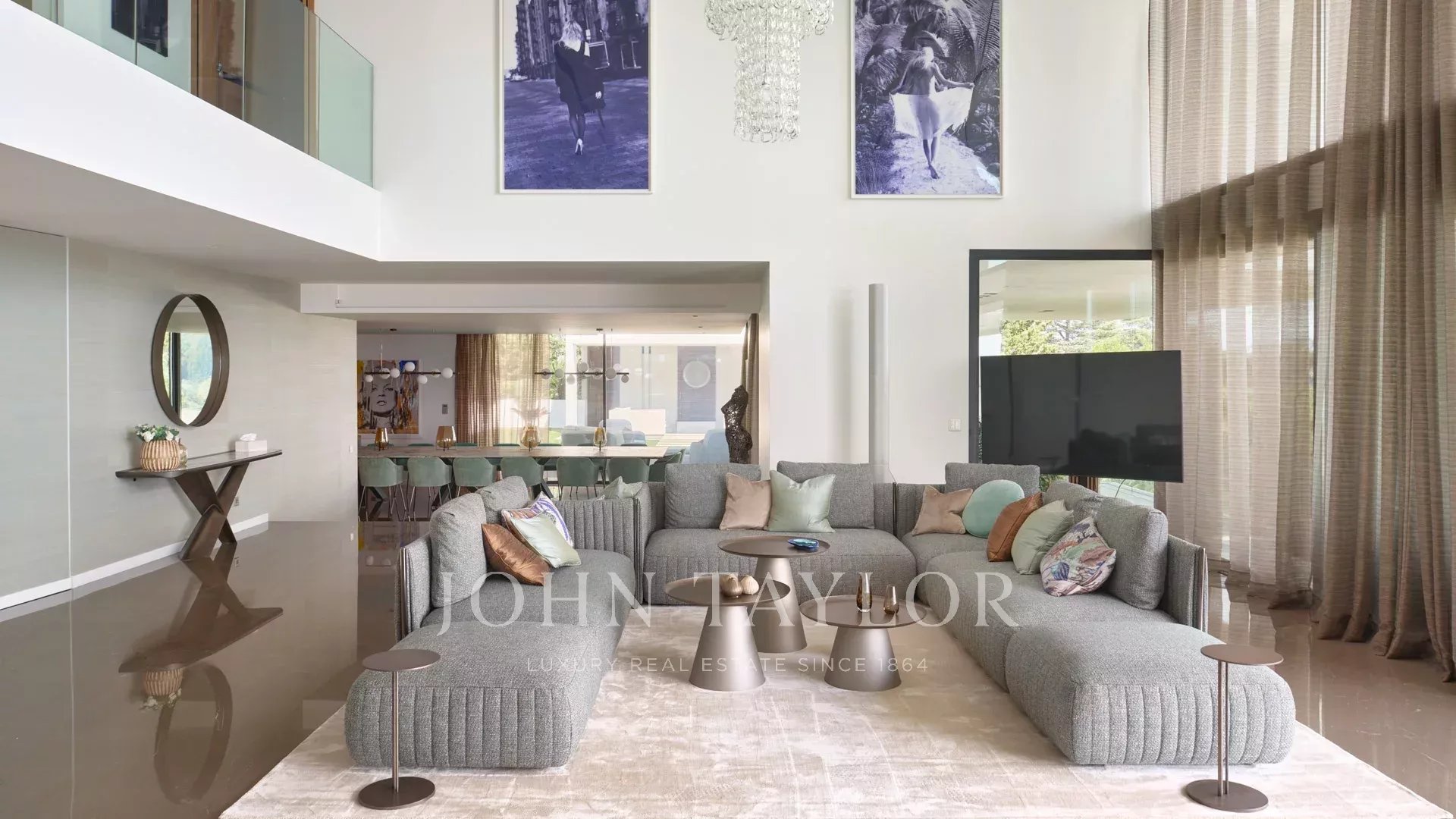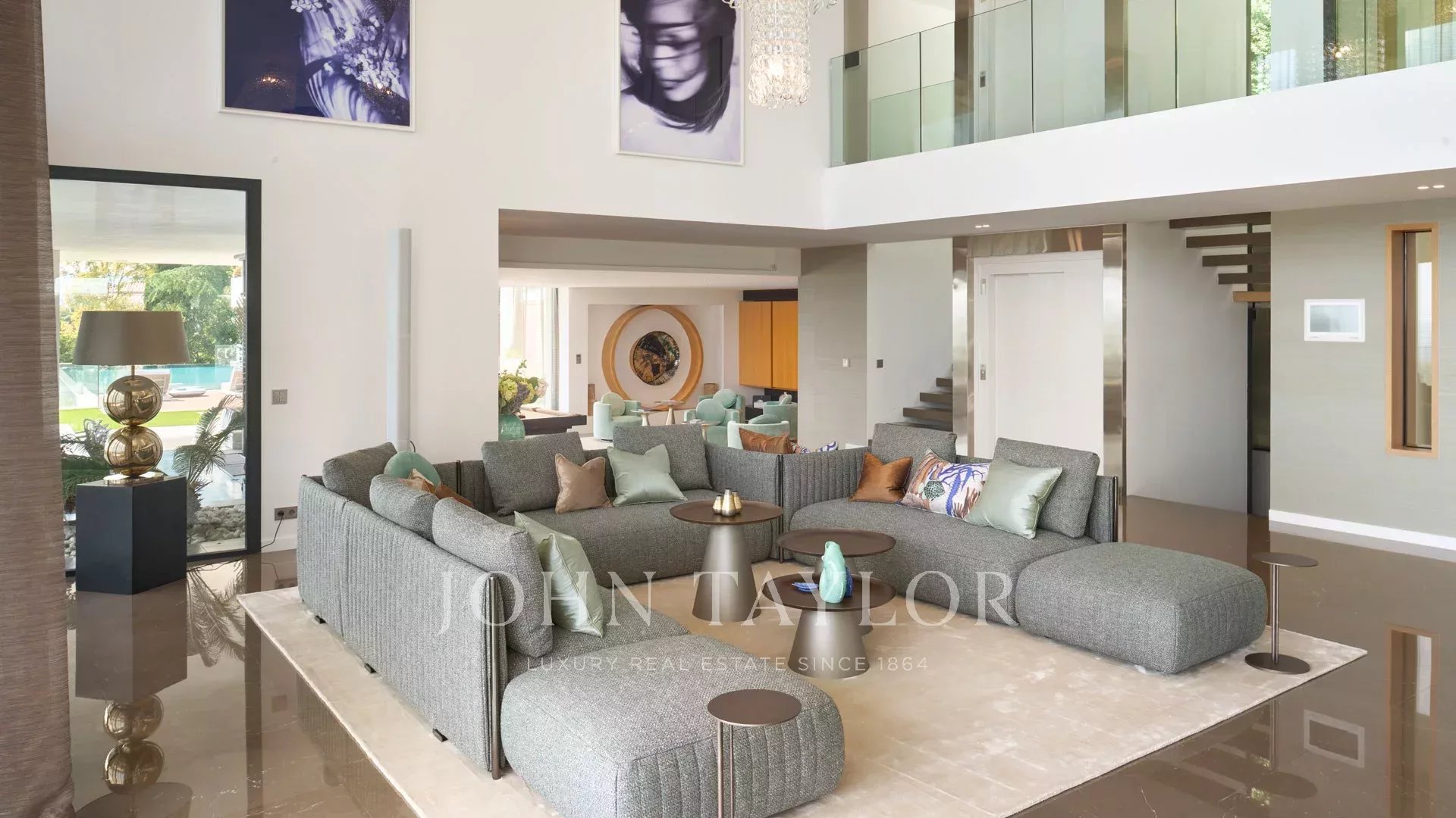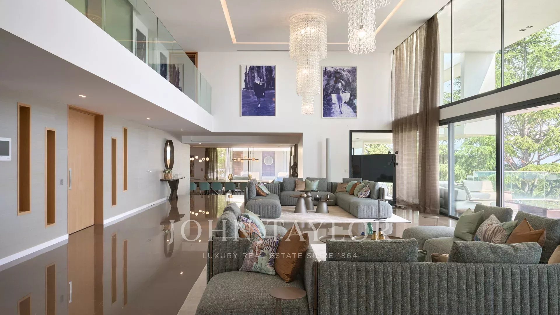 Entrée donnant sur une vaste salle de réception d'environ 250m² comprenant salon, salle à manger avec cuisine américaine et s’ouvrant sur de belles terrasses