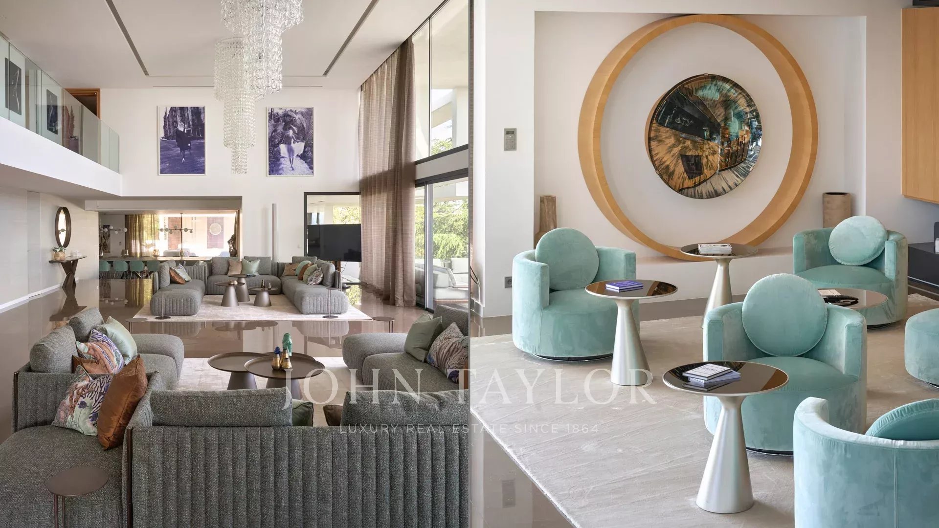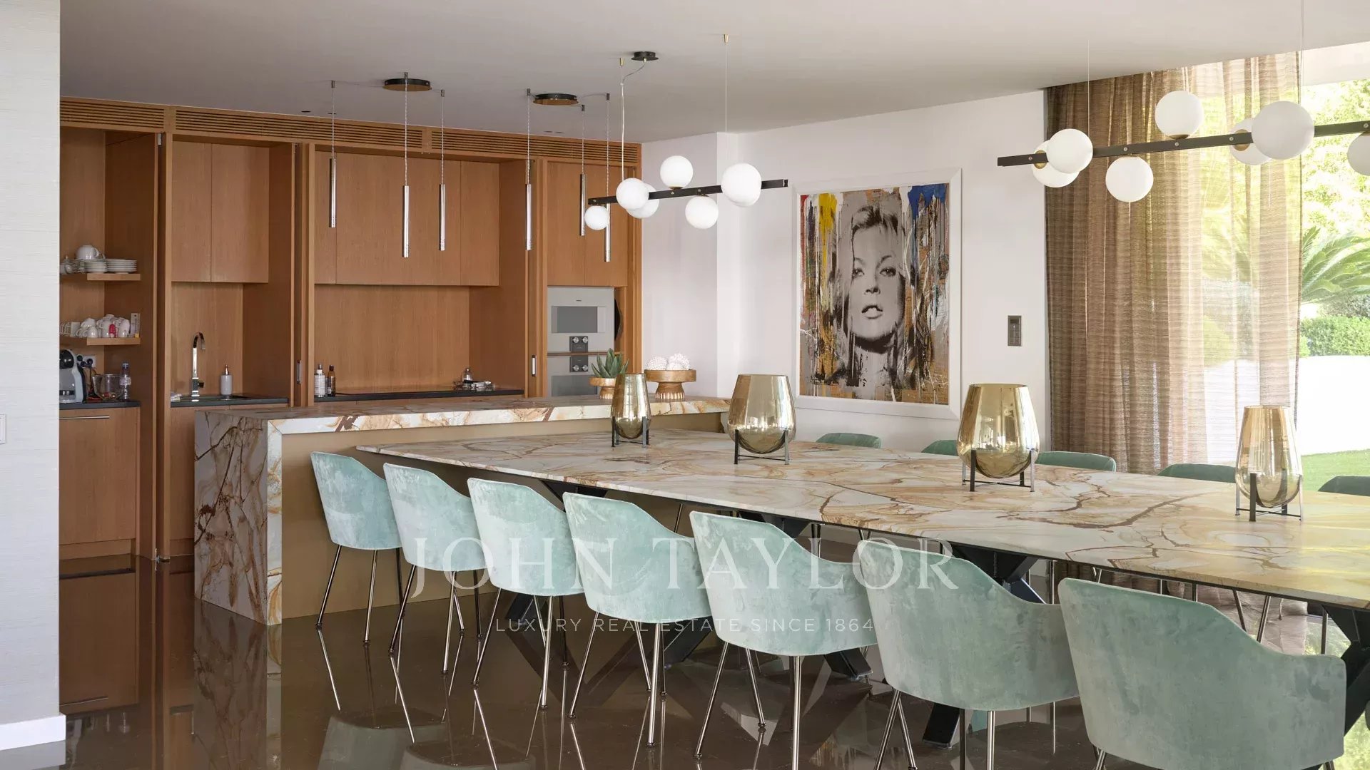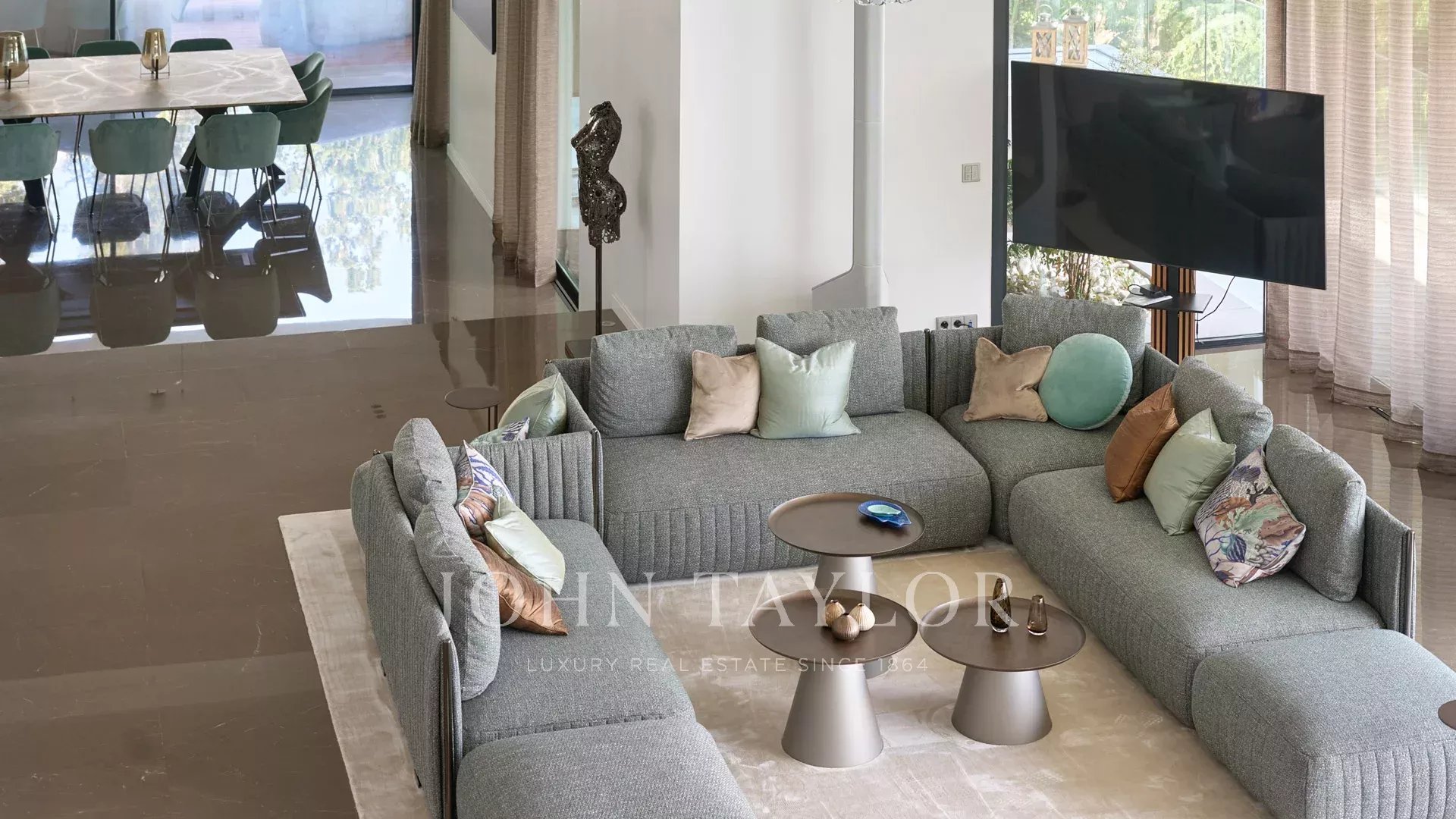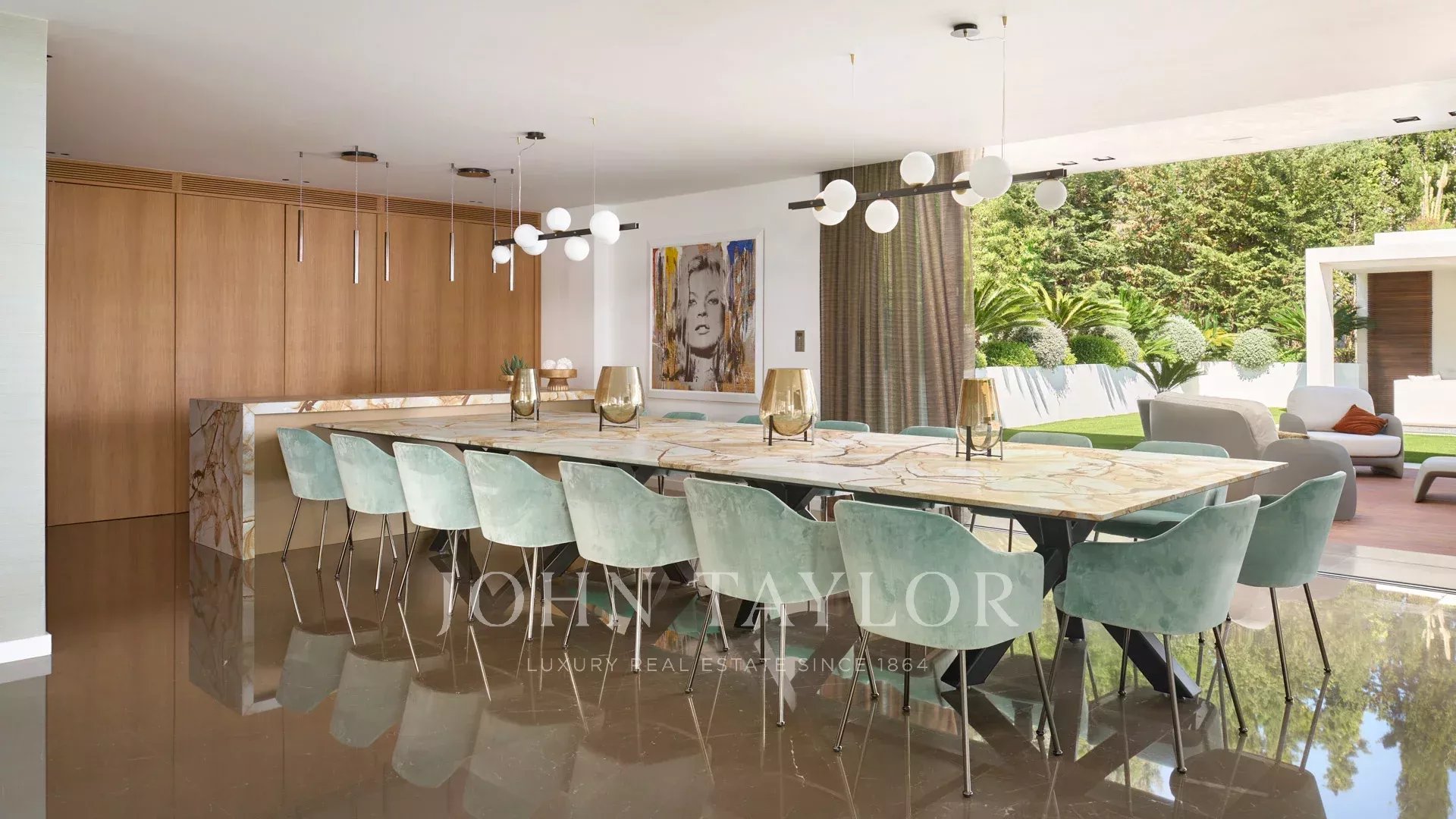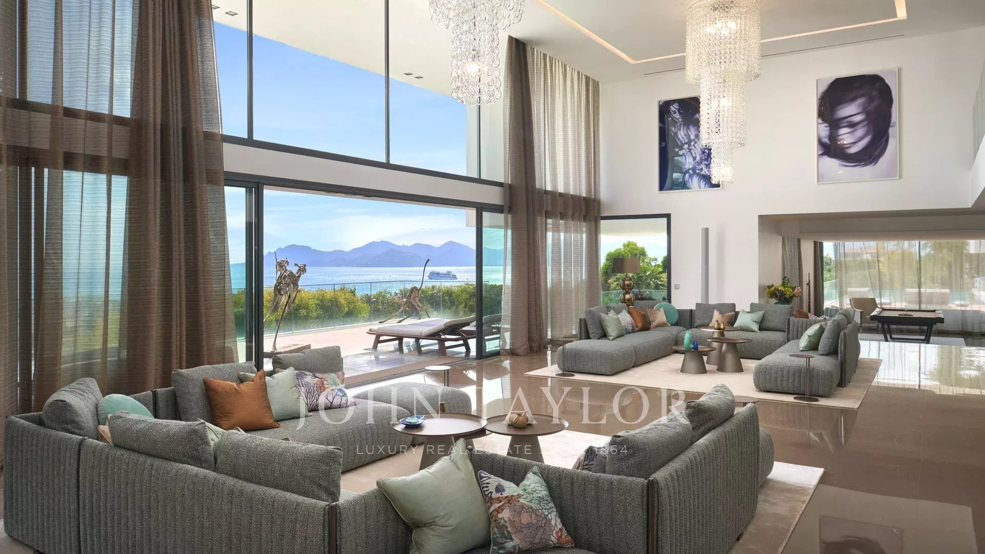 Entrée donnant sur une vaste salle de réception d'environ 250m² comprenant salon, salle à manger avec cuisine américaine et s’ouvrant sur de belles terrasses