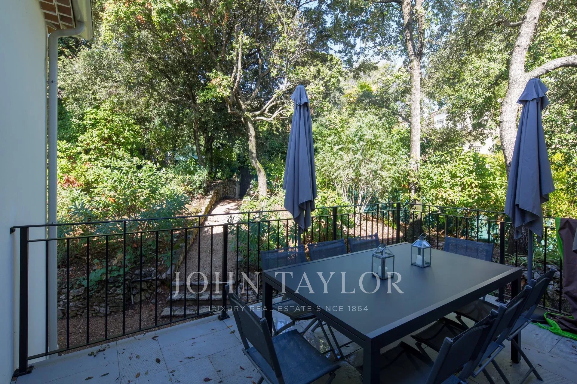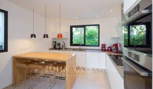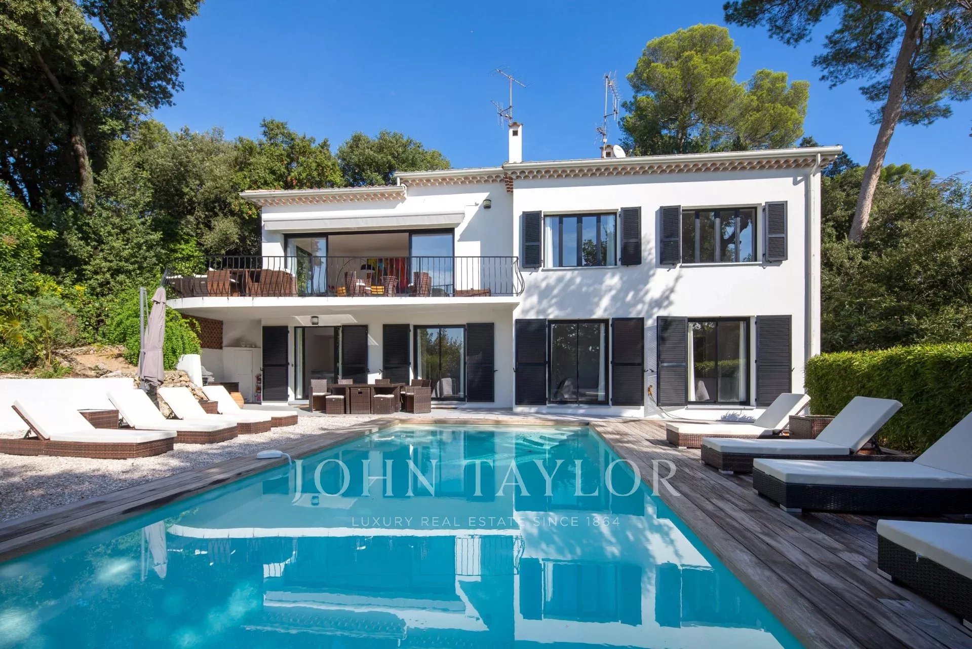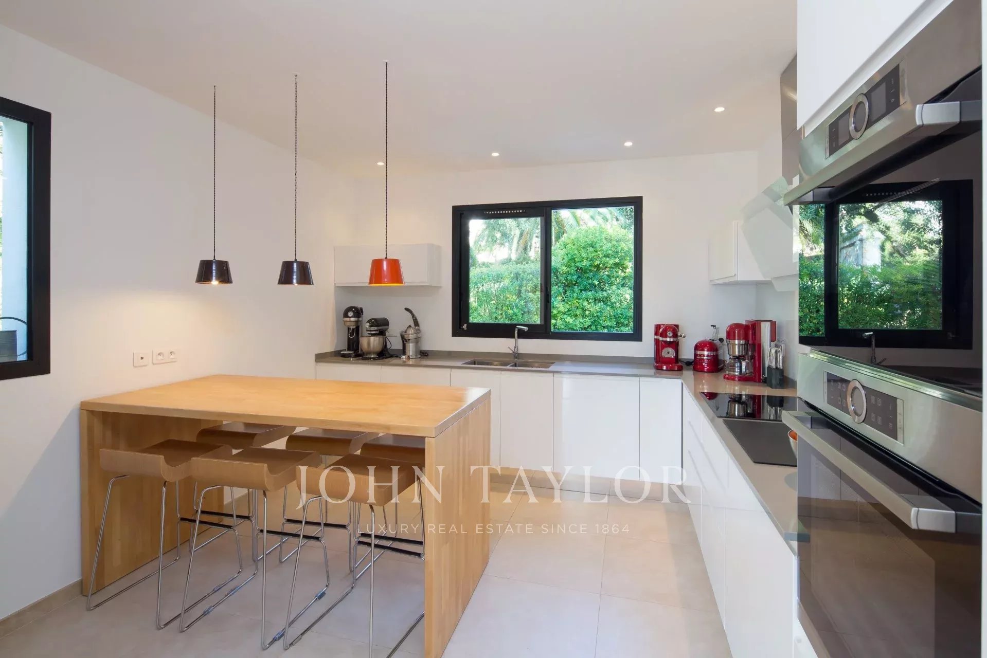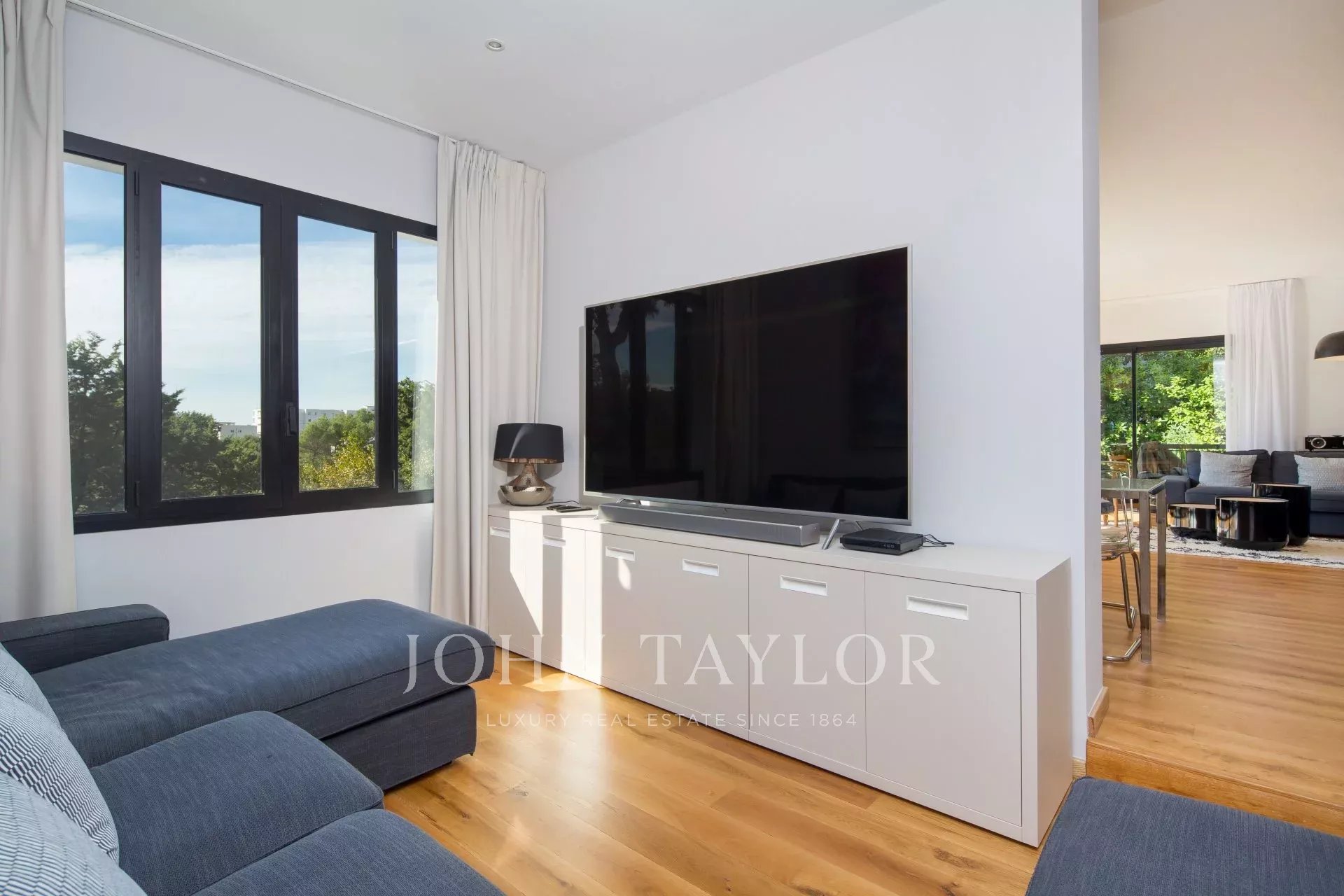 Proche du centre-ville de Cannes, dans un domaine privé, villa contemporaine climatisée, jouissant d’un exposition Sud et de 255 m2 de superficie habitable au cœur d’un jardin de 1 300 m2.