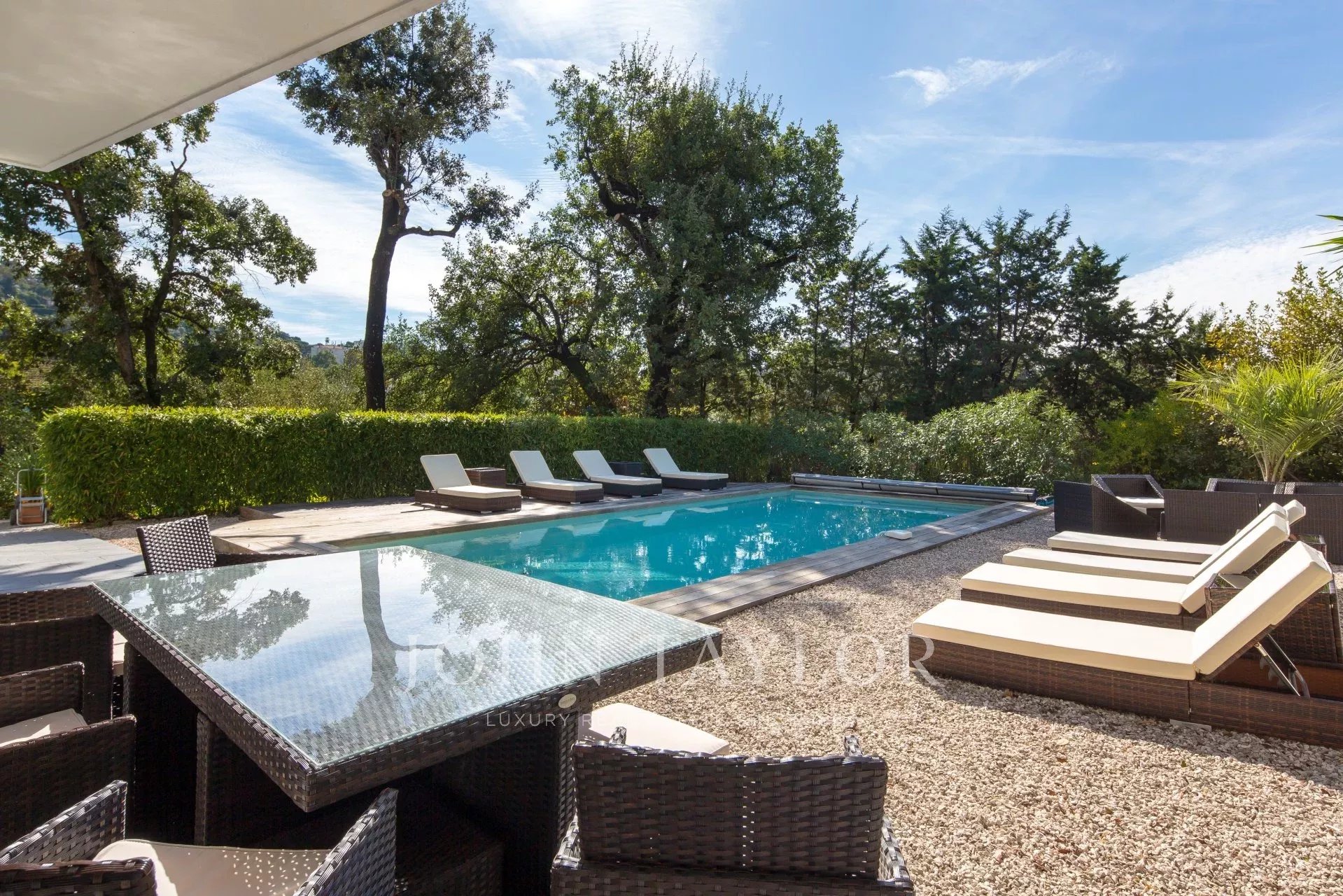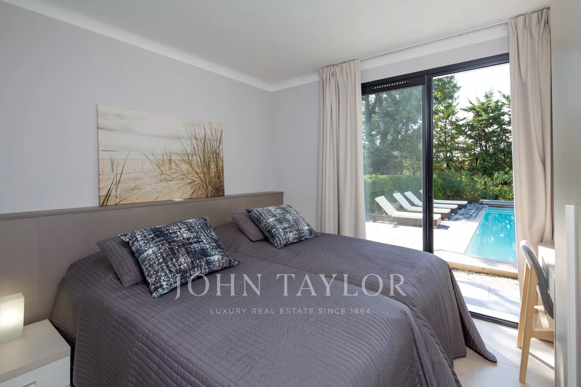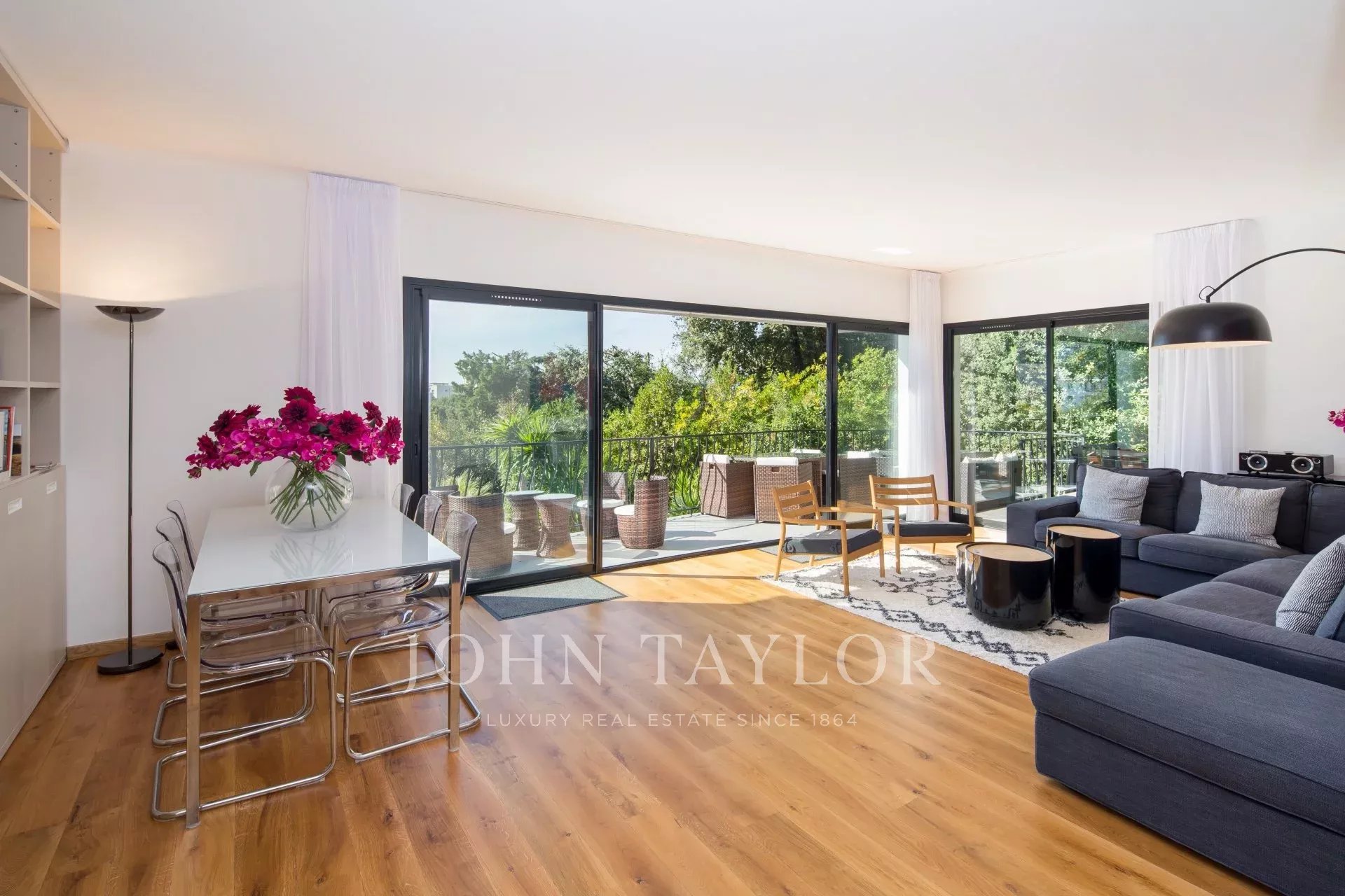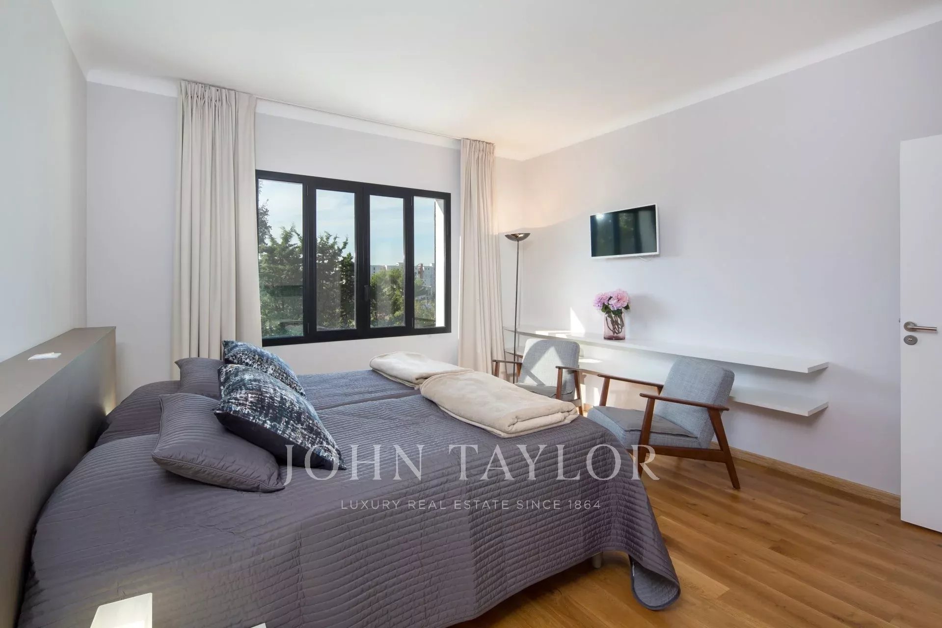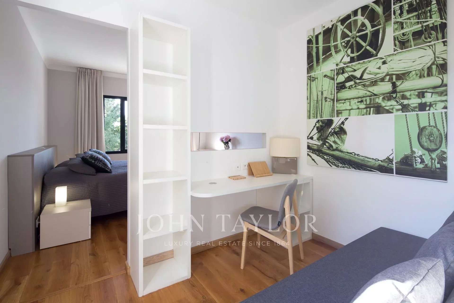 Proche du centre-ville de Cannes, dans un domaine privé, villa contemporaine climatisée, jouissant d’un exposition Sud et de 255 m2 de superficie habitable au cœur d’un jardin de 1 300 m2.