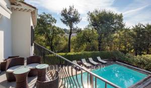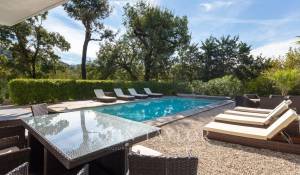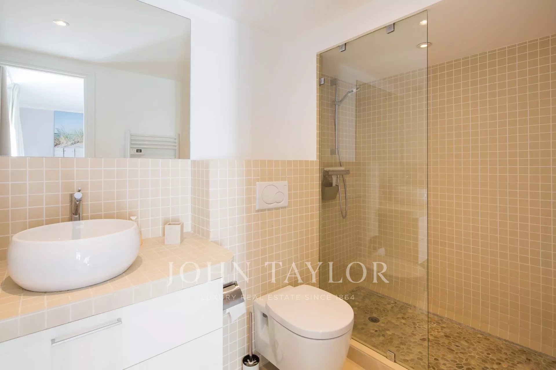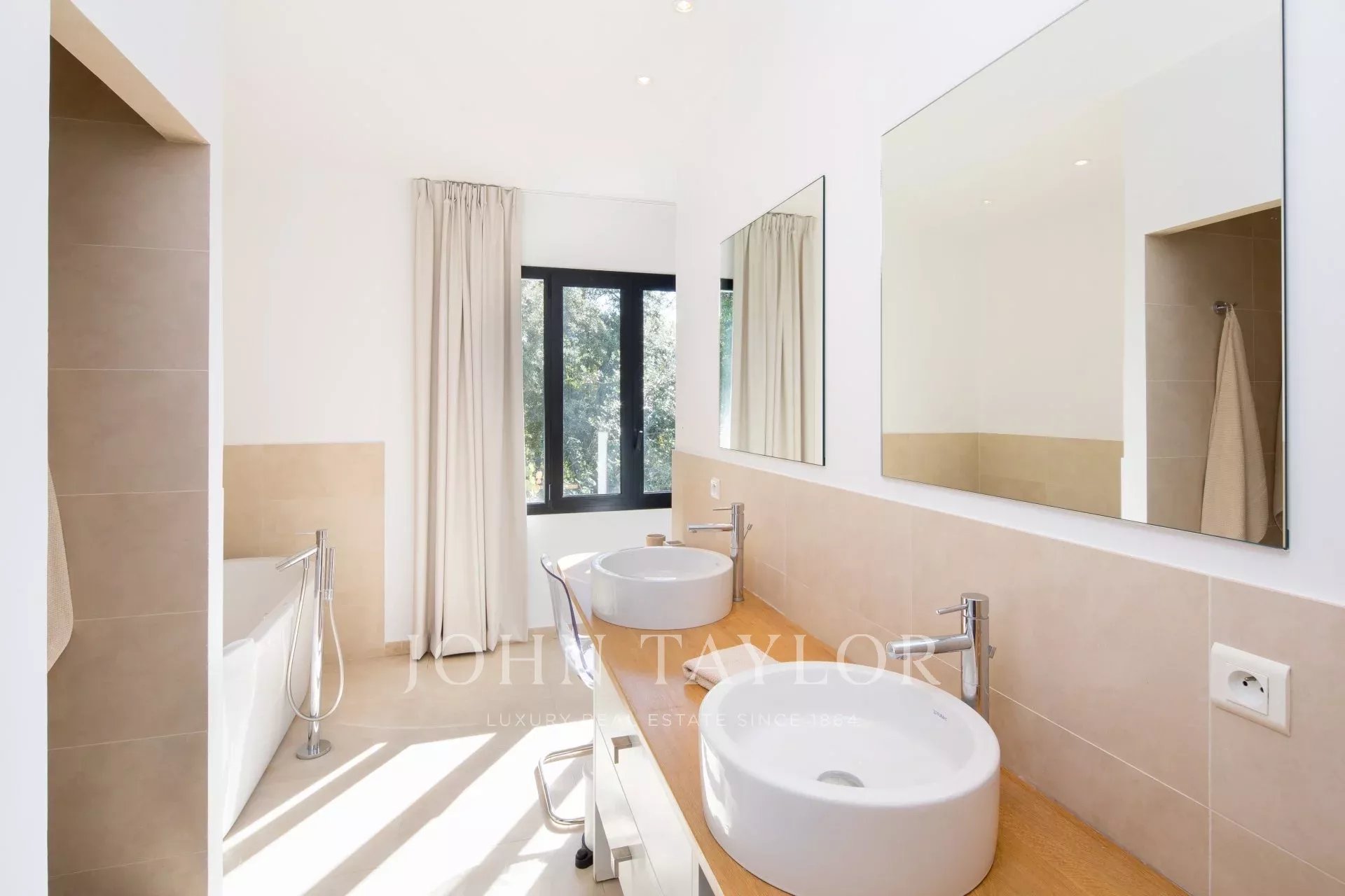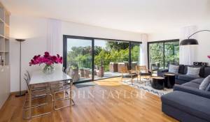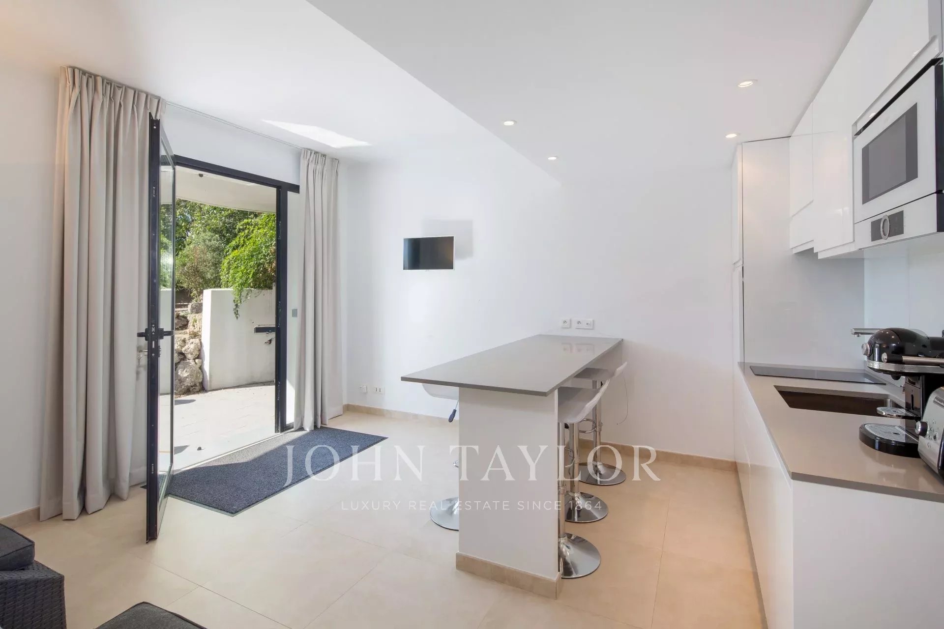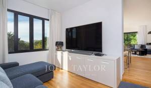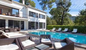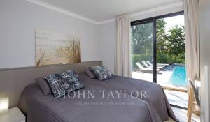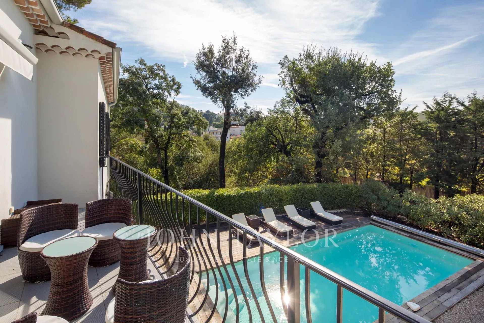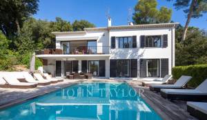 Proche du centre-ville de Cannes, dans un domaine privé, villa contemporaine climatisée, jouissant d’un exposition Sud et de 255 m2 de superficie habitable au cœur d’un jardin de 1 300 m2.