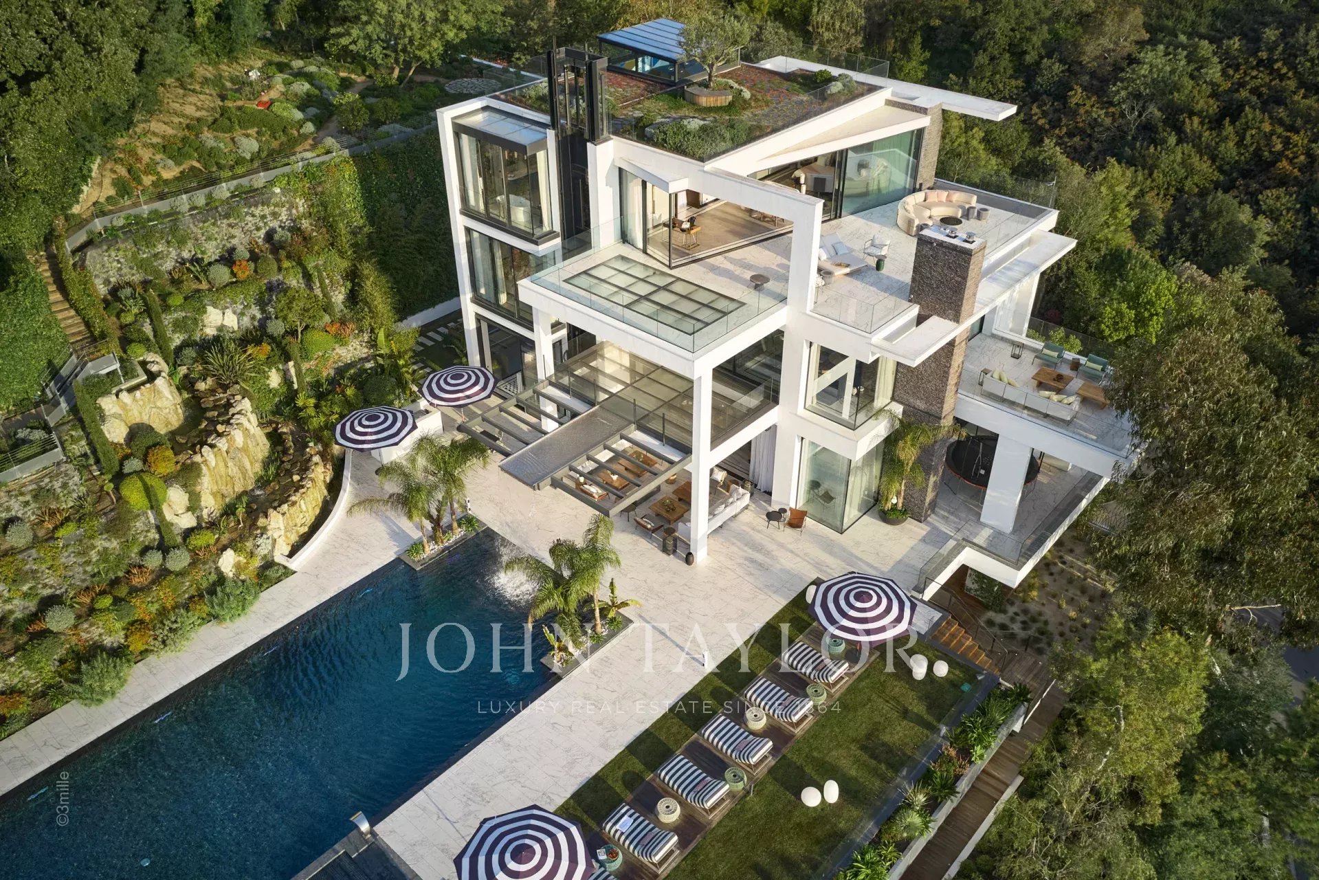 Les espaces extérieurs sont tout aussi somptueux, avec une terrasse au rez-de-chaussée équipée d'une terrasse autour de la piscine avec un vue panoramique sur la mer, d'un brasero, d'un barbecue et d'un coin repas, surplombant la piscine chauffée et deux cascades. Les étages supérieurs offrent des terrasses panoramiques équipées et d'espaces de détente avec transats et brasero, tandis que le jardin méditerranéen en terrasses comprend un terrain de pétanque et un potager.
