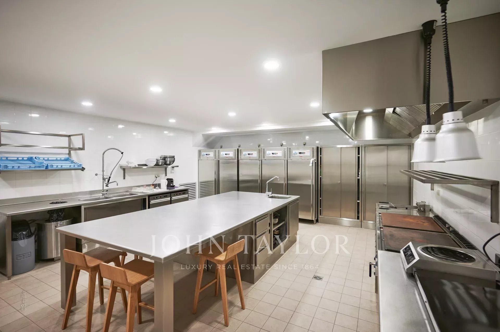 Le sous-sol abrite une buanderie, une cuisine professionnelle et un accès au parking intérieur avec deux places de stationnement dédiées.