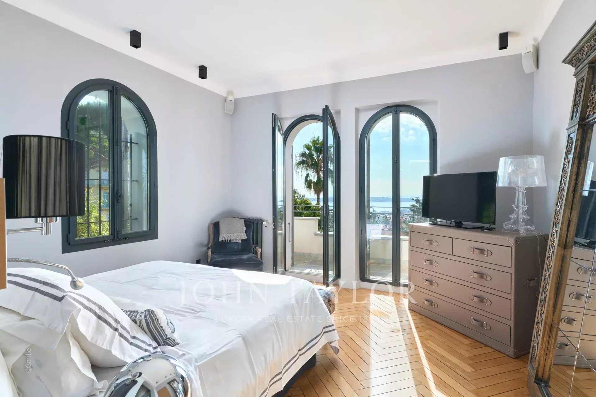 Chambre de Maître (lit king size ou deux lits individuels), TV, s’ouvrant sur balcon, vue mer – Salle de bains / douche / WC