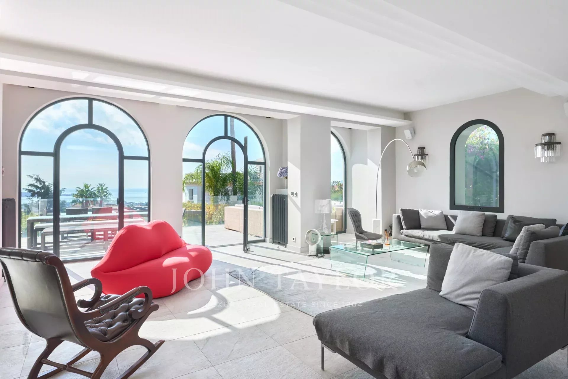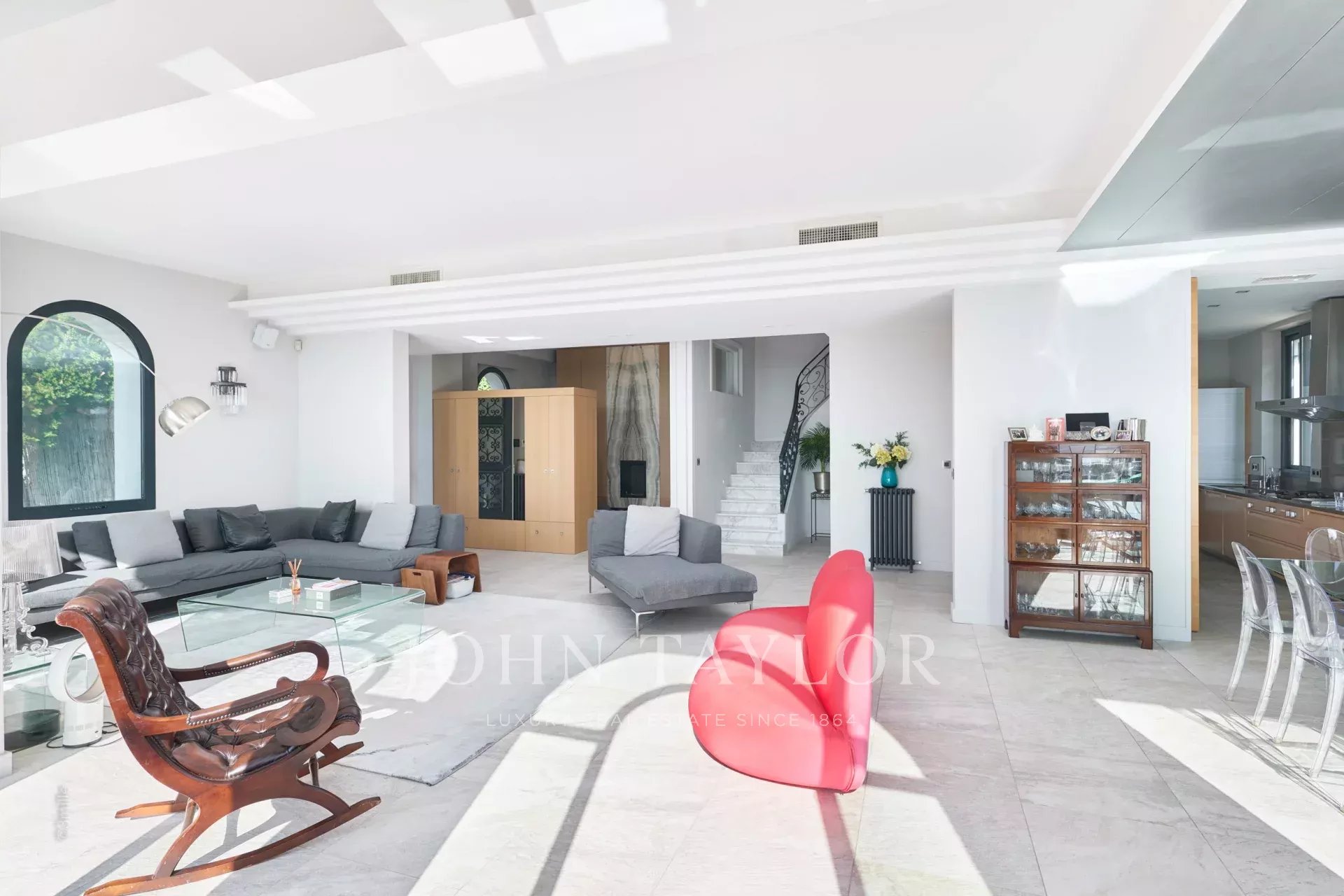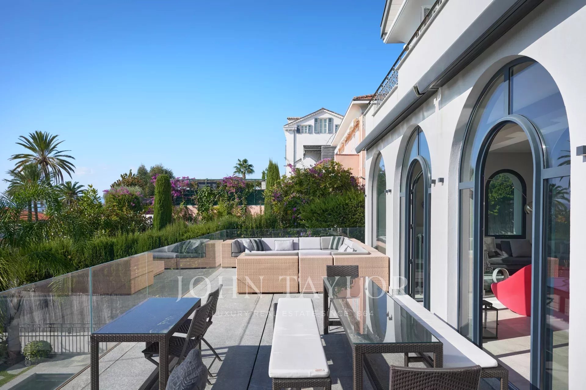Hall d'entrée menant à la pièce de réception offrant salon et salle à manger, le tout s'ouvrant sur une grande terrasse équipée avec salon et salle à manger d'été