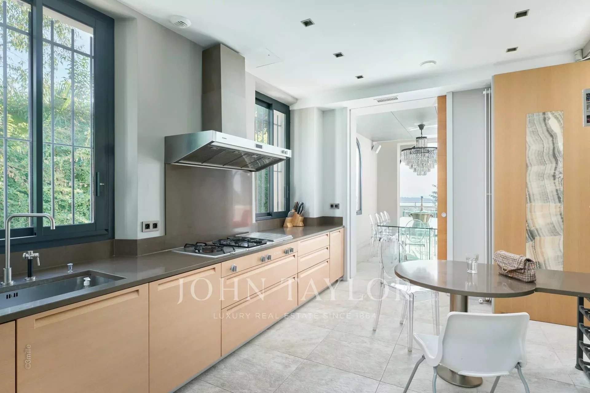 Belle cuisine parfaitement équipée avec coin petit déjeuner, ouverte sur la salle à manger