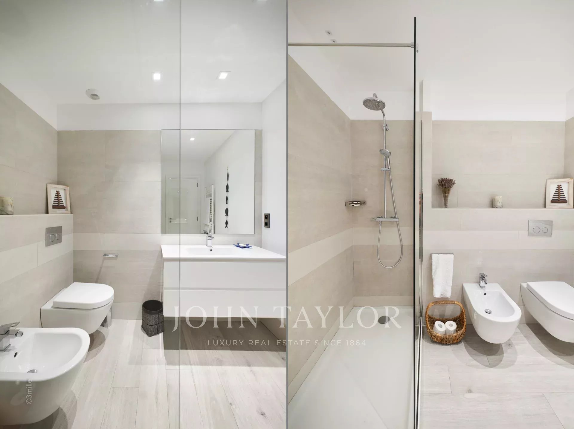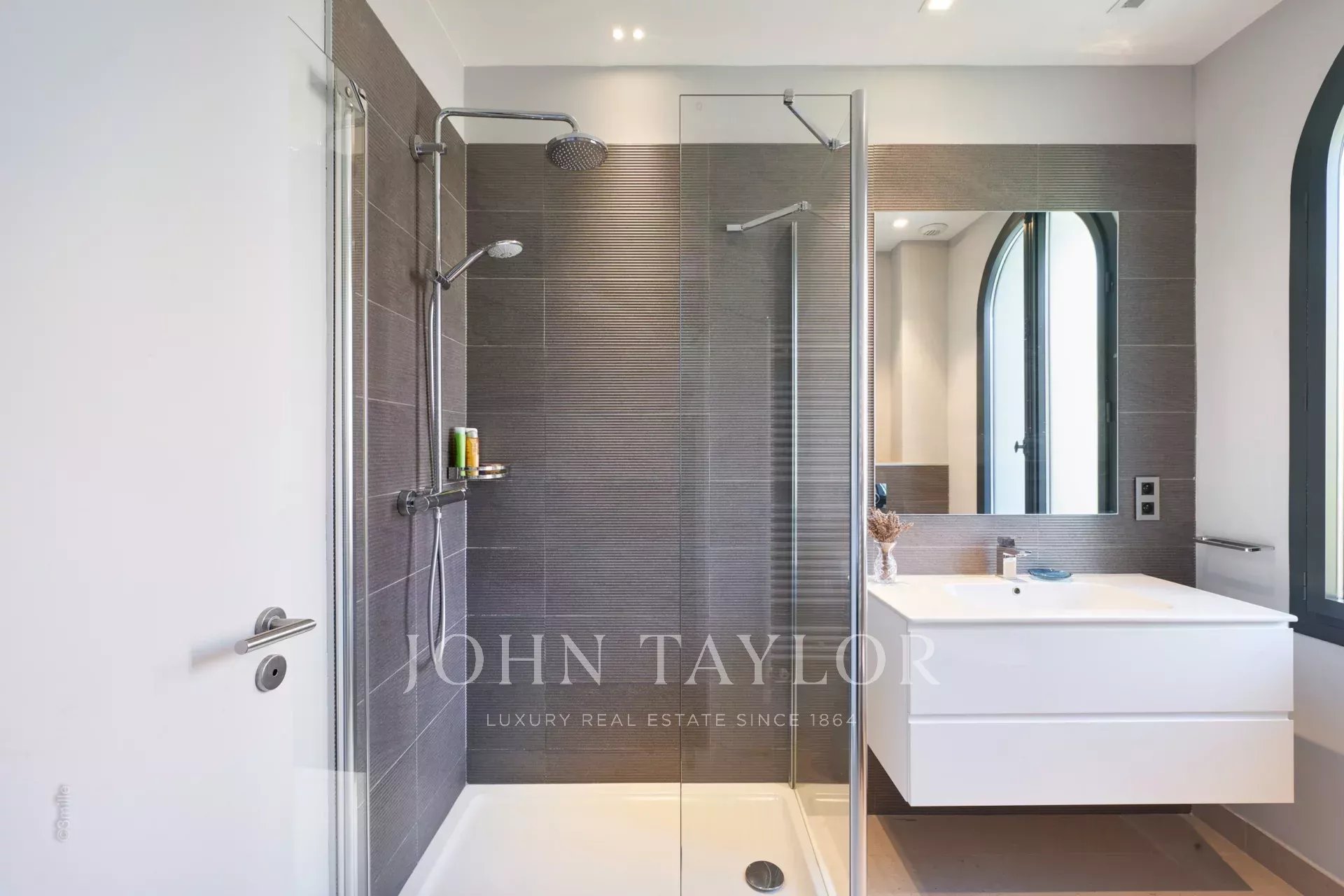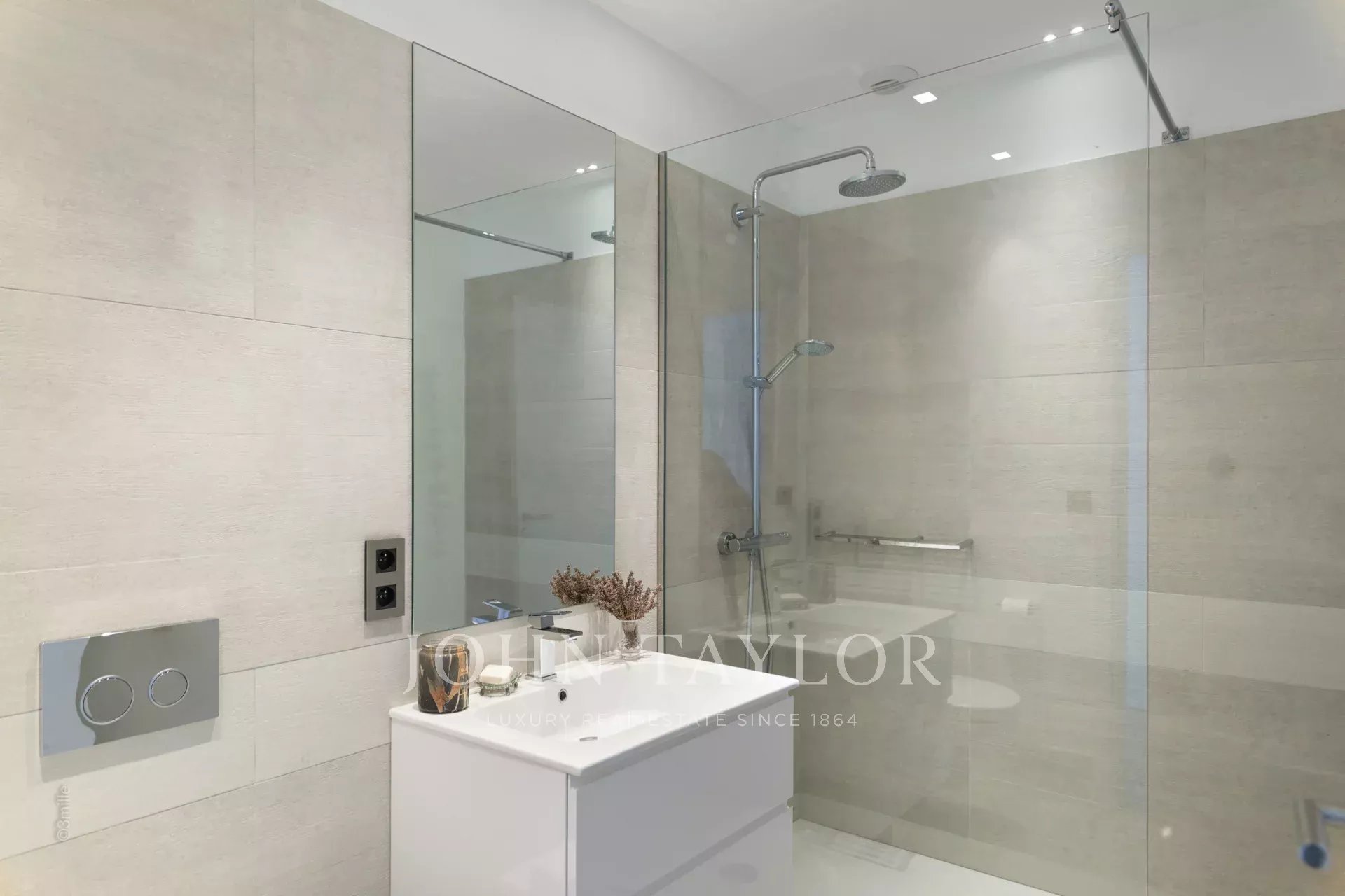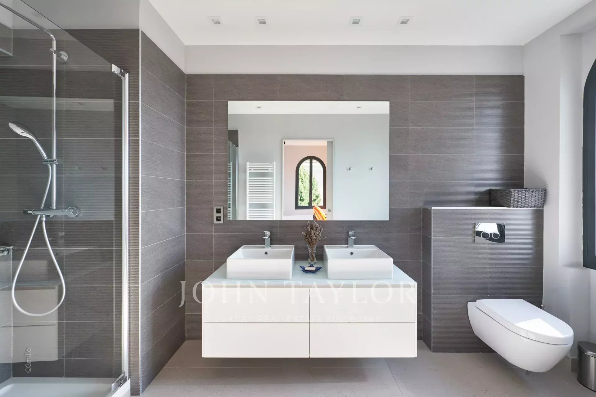 Chambre (lit king size ou deux lits individuels), magnifique vue sur la baie de Cannes et les Iles de Lérins – Salle de douches / WC