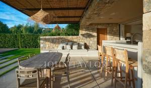 Grand salon TV donnant sur la terrasse couverte avec cuisine / bar / salle à manger d'été avec BBQ à gaz, plancha,lave vaisselle et réfrigérateur