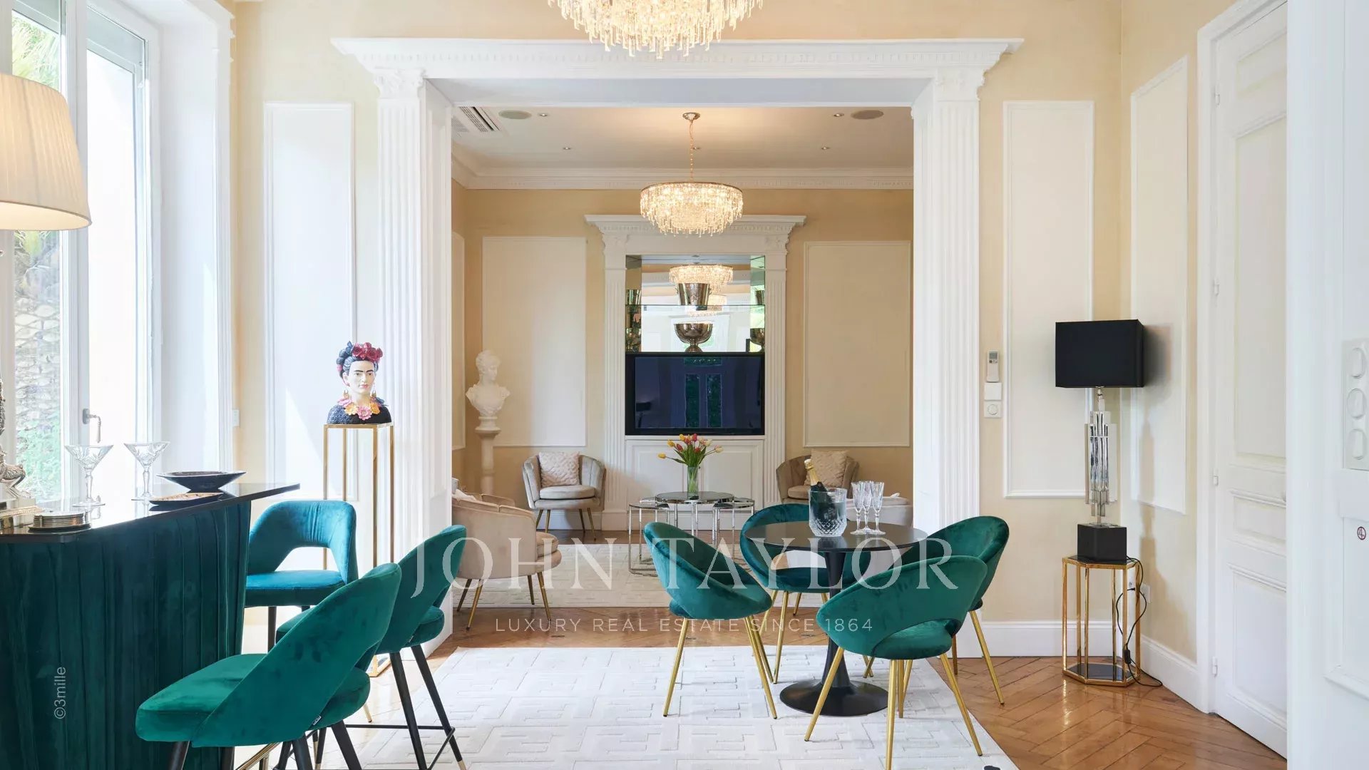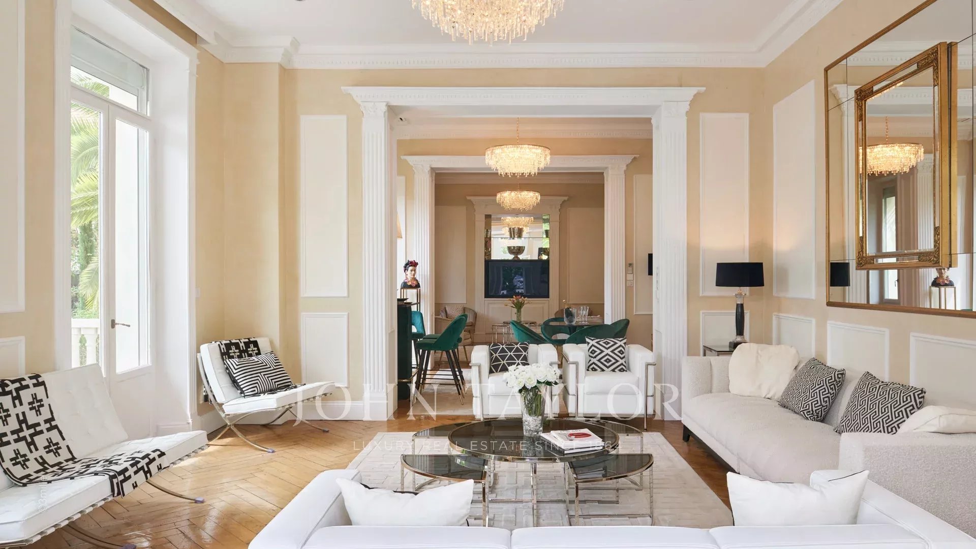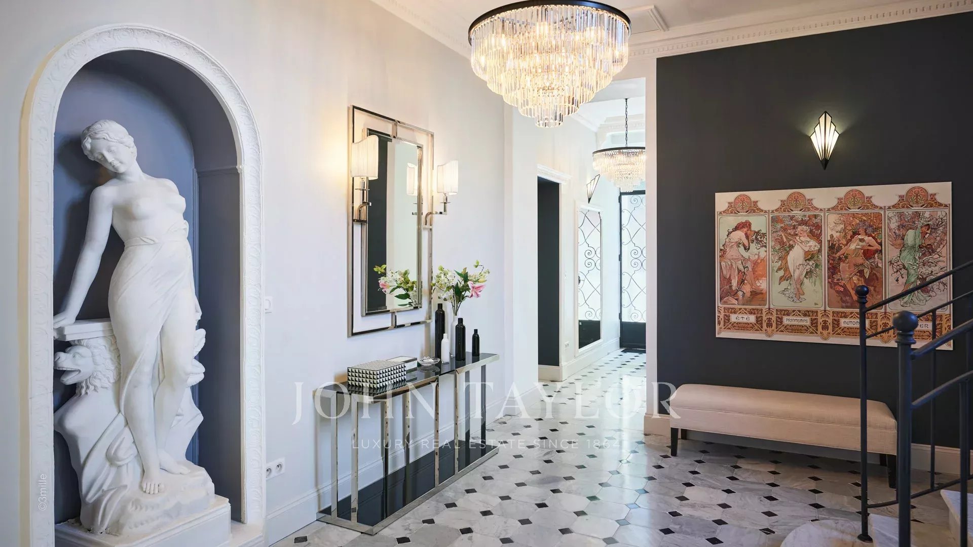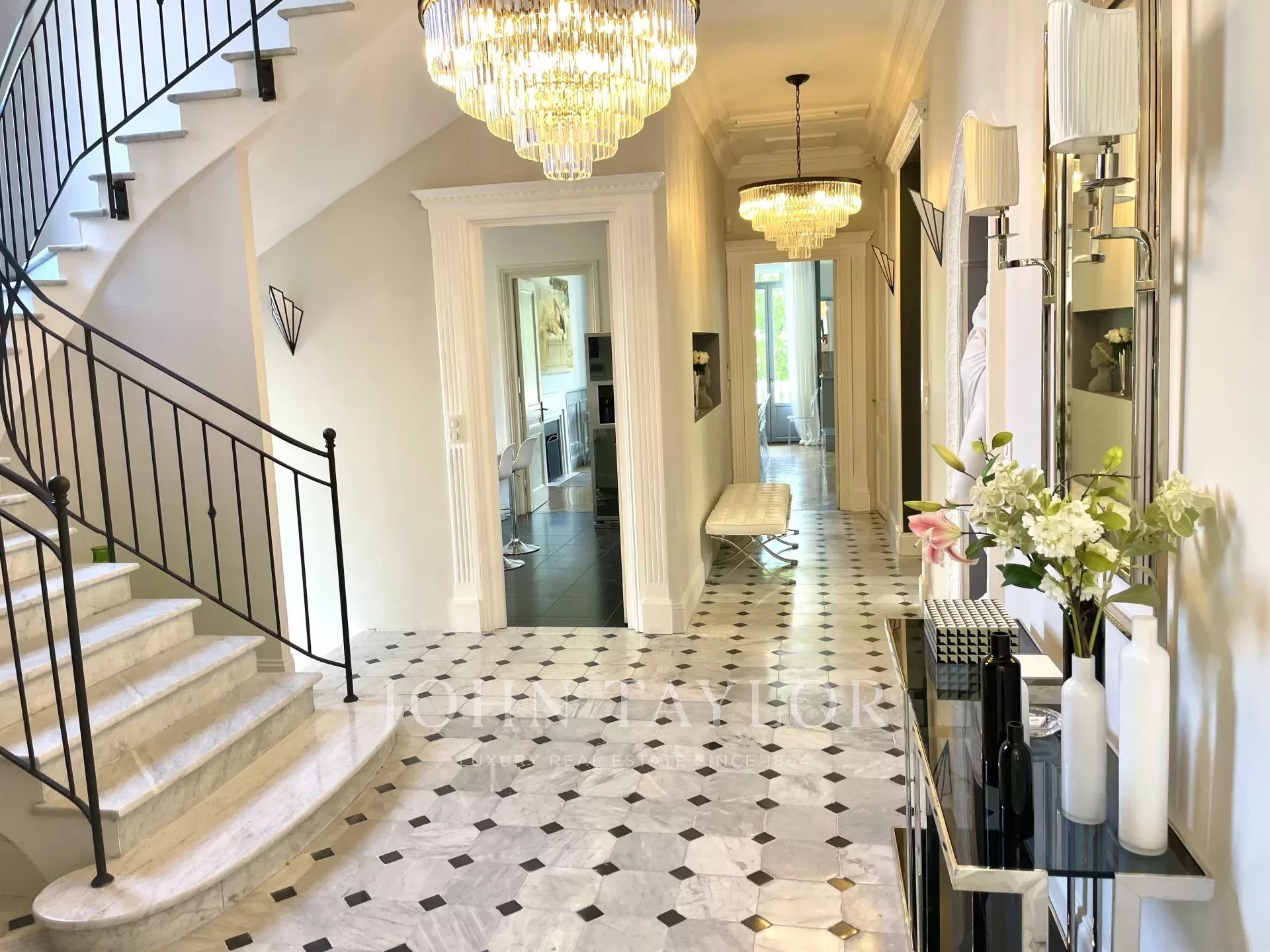 Elégant hall d’entrée menant à la triple réception, le tout s’ouvrant sur la terrasse de 60 m2 qui surplombe la piscine