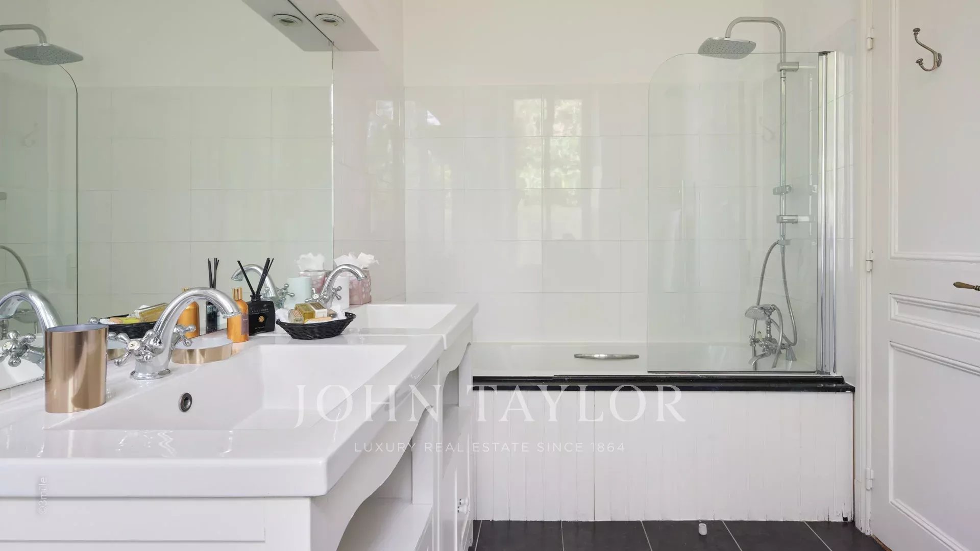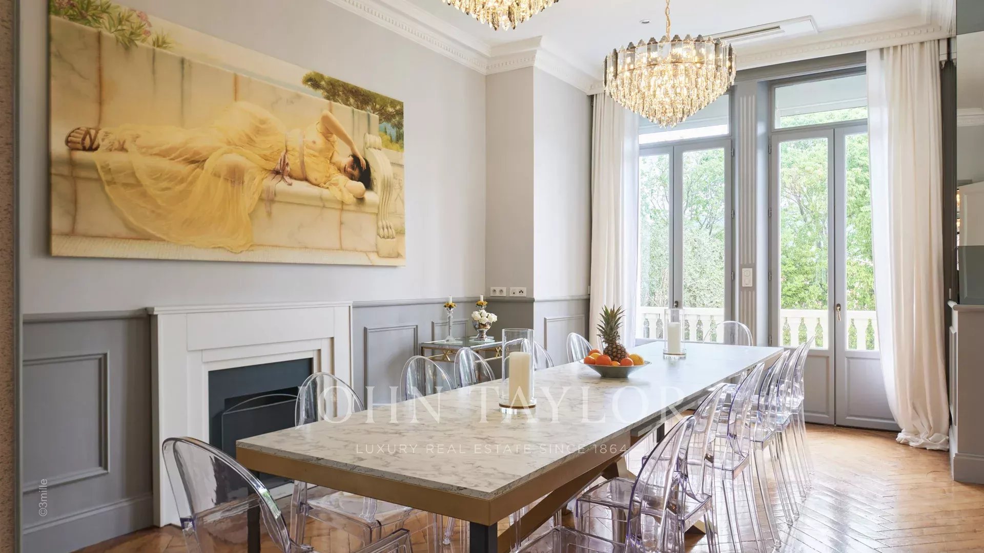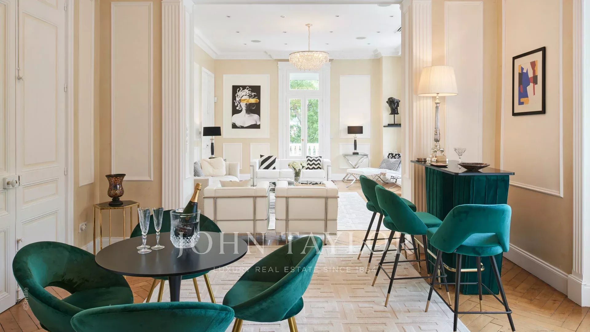 Elégant hall d’entrée menant à la triple réception, le tout s’ouvrant sur la terrasse de 60 m2 qui surplombe la piscine