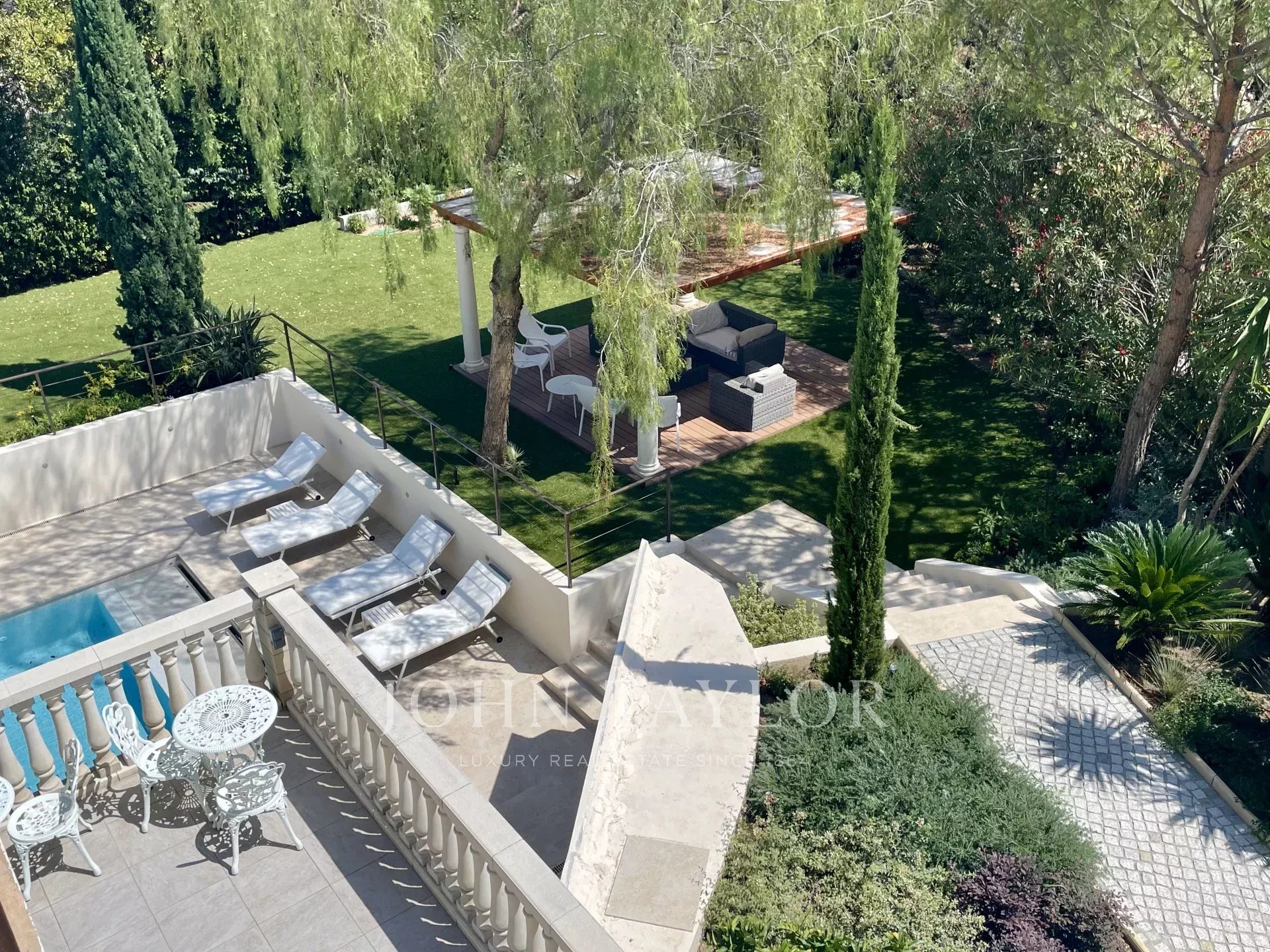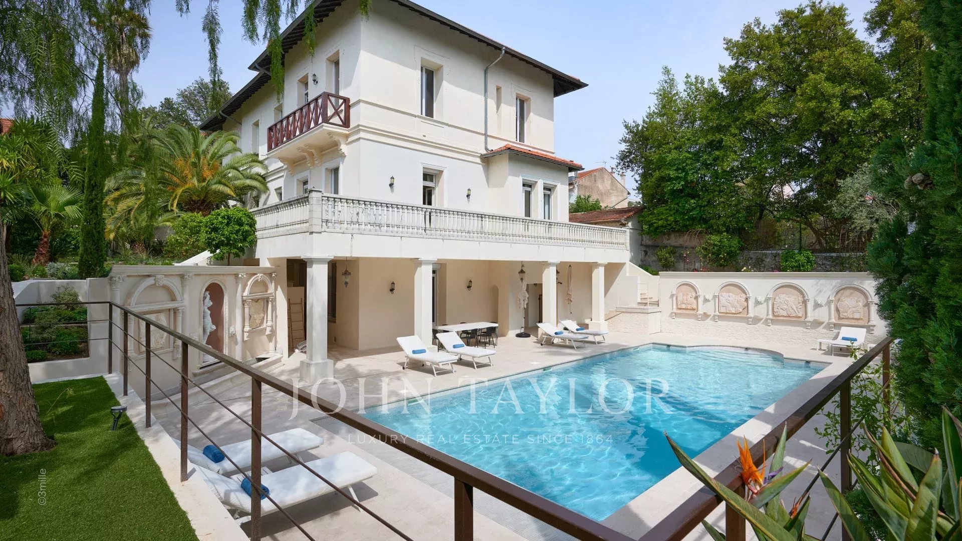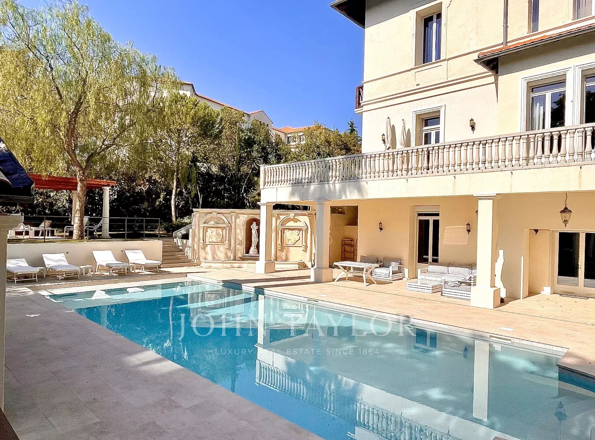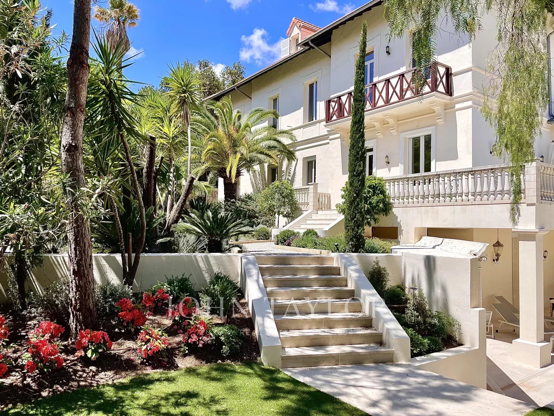 Dans un quartier résidentiel, à deux pas du cœur de Cannes, 10 minutes à pied du Palais des Festivals, luxueuse villa « Belle Epoque » de 650 m2 habitables entièrement rénovés et climatisés, au cœur d’un parc de 2 500 m2.