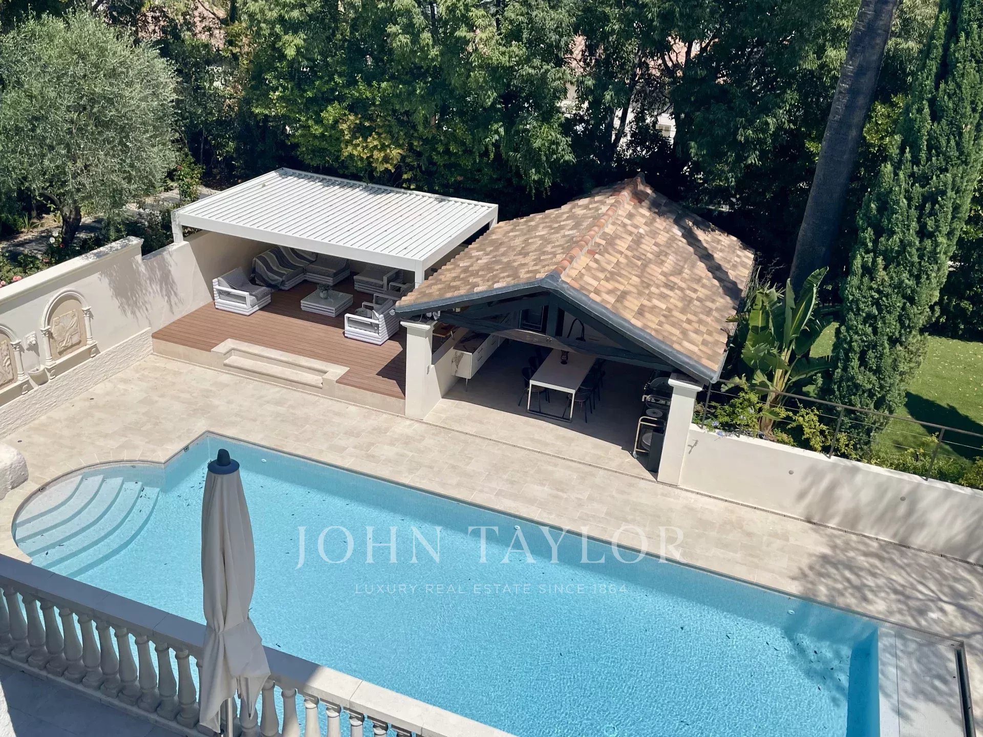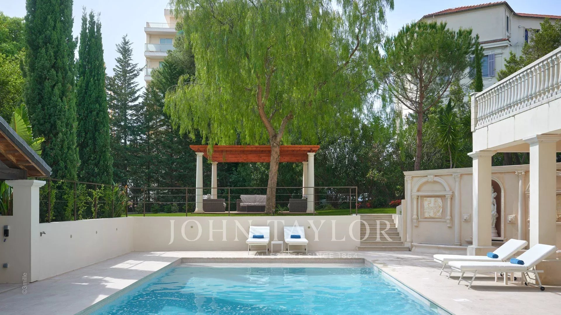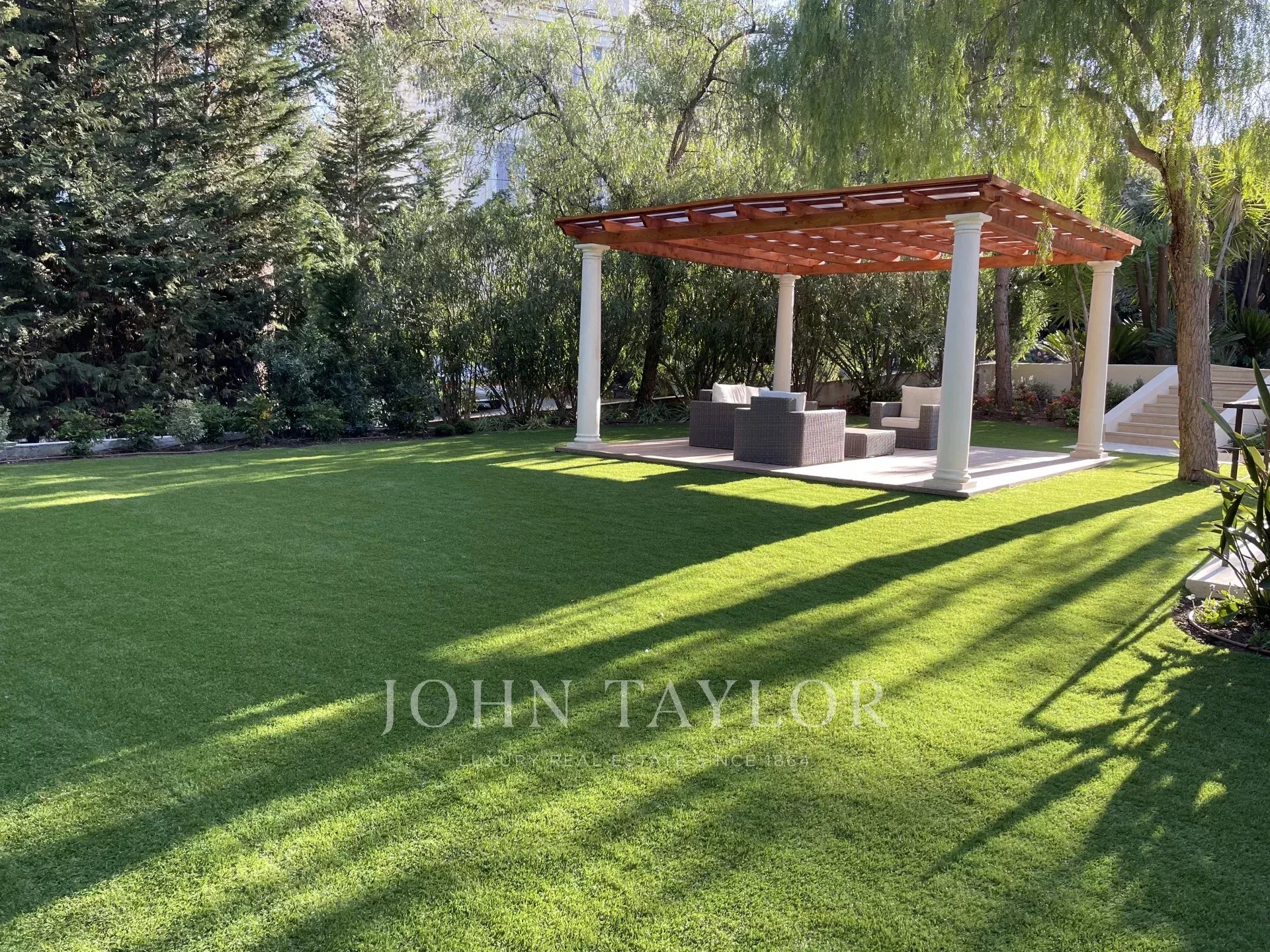 Dans un quartier résidentiel, à deux pas du cœur de Cannes, 10 minutes à pied du Palais des Festivals, luxueuse villa « Belle Epoque » de 650 m2 habitables entièrement rénovés et climatisés, au cœur d’un parc de 2 500 m2.