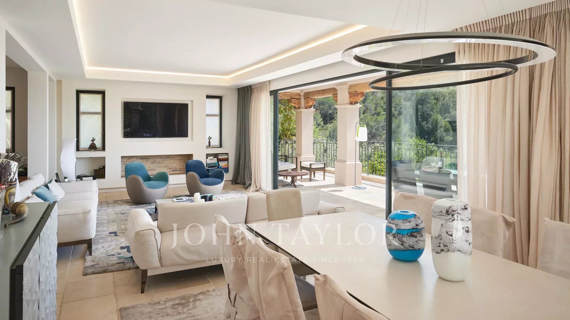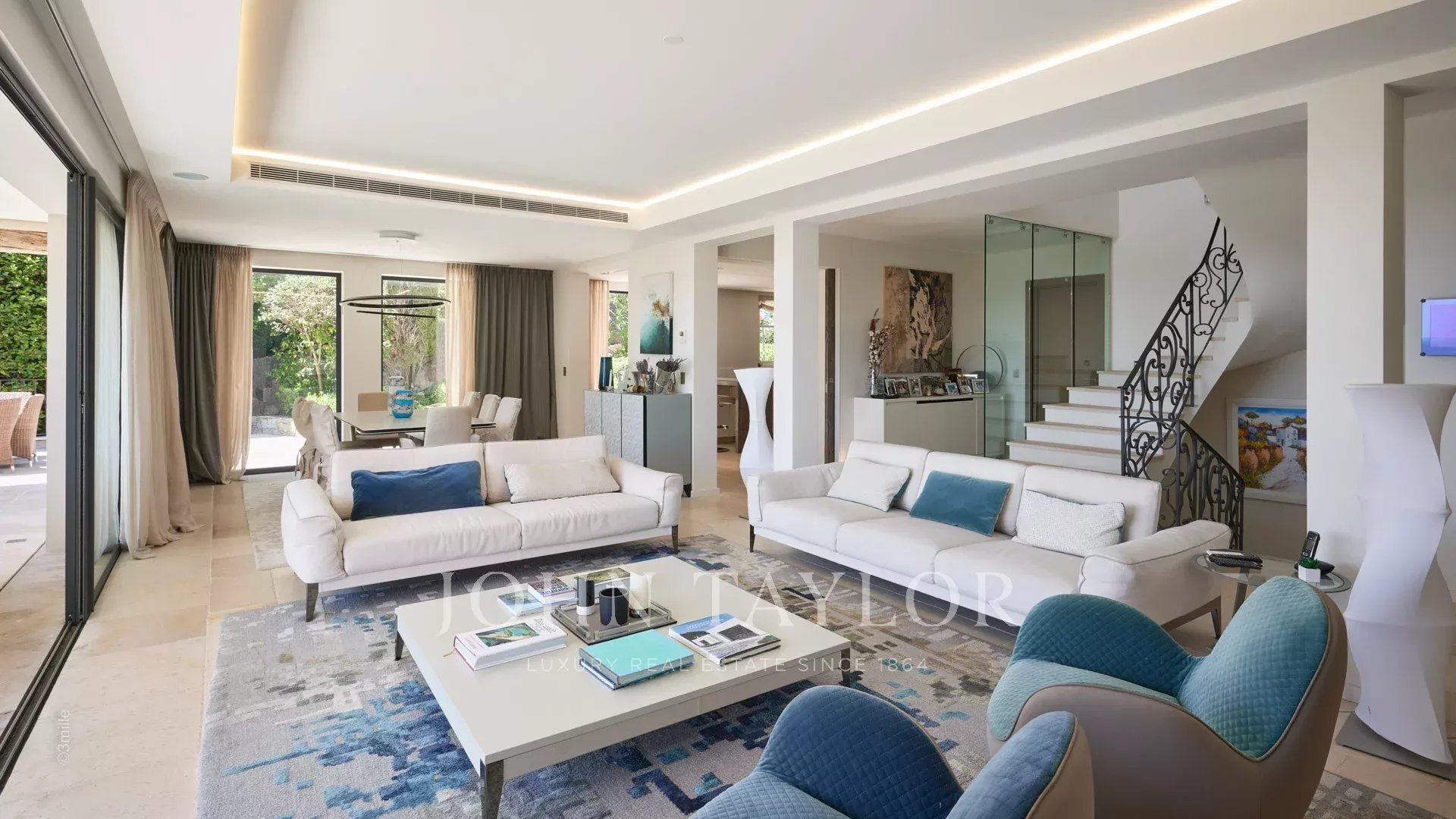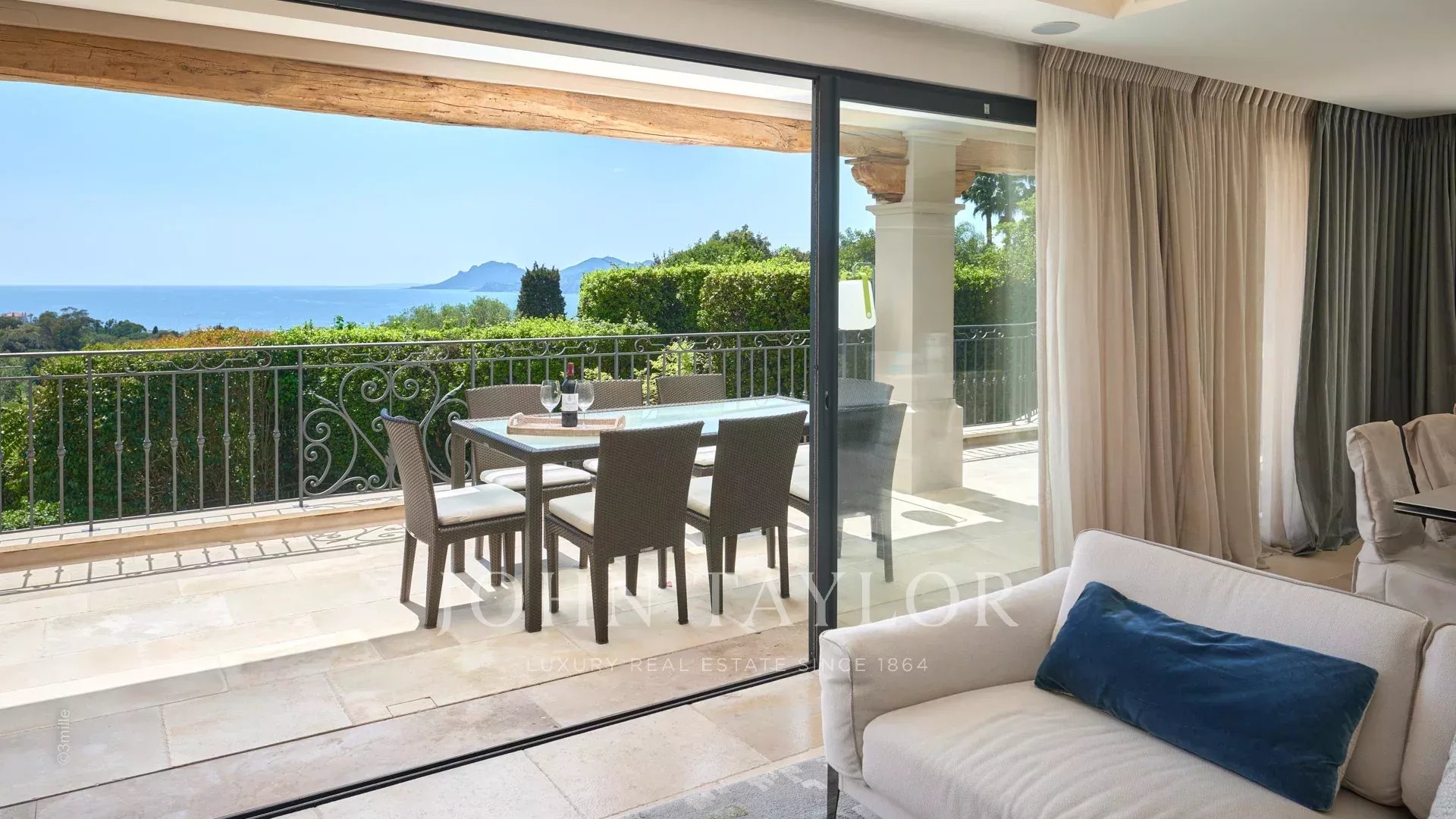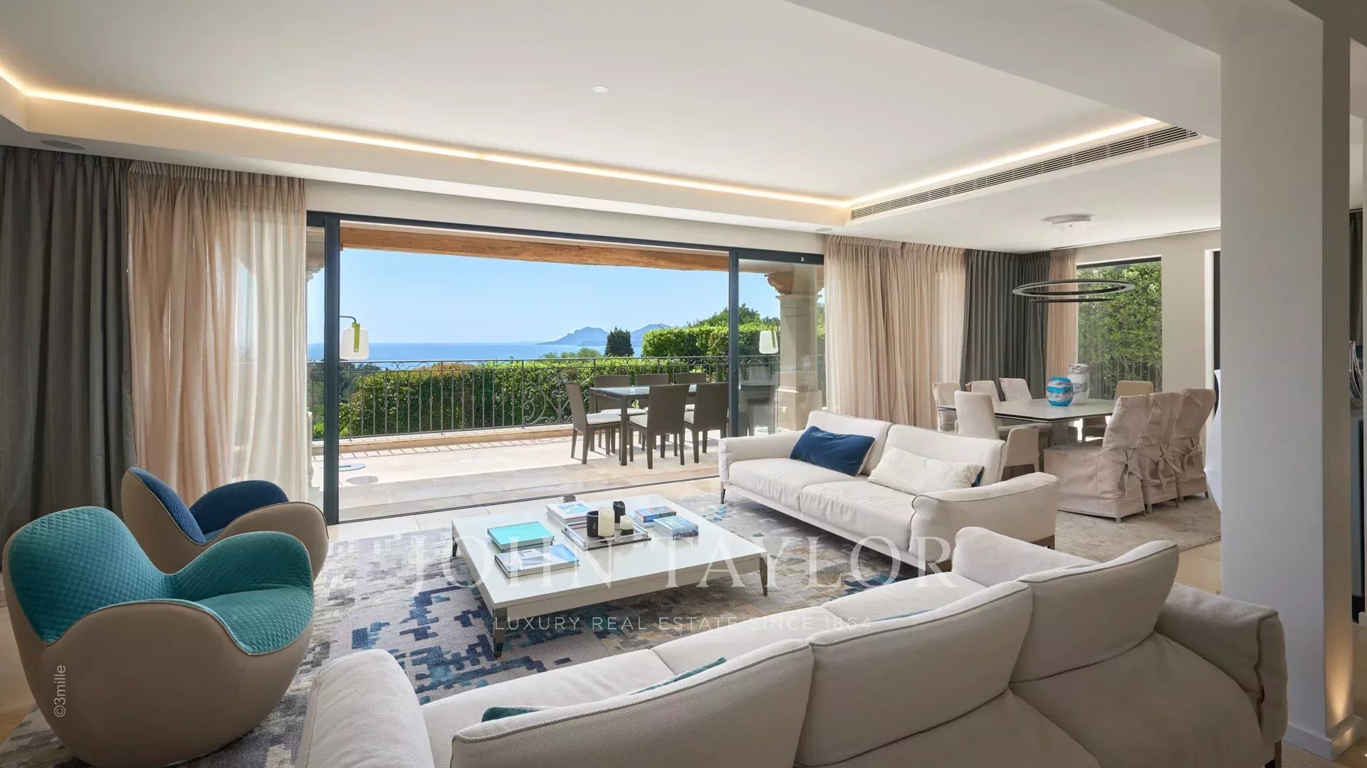 Entrée donnant sur la pièce de réception comprenant salon, salle à manger et cuisine ouverte, le tout s’ouvrant sur la terrasse jouissant d’une vue mer panoramique sur la baie de Cannes.