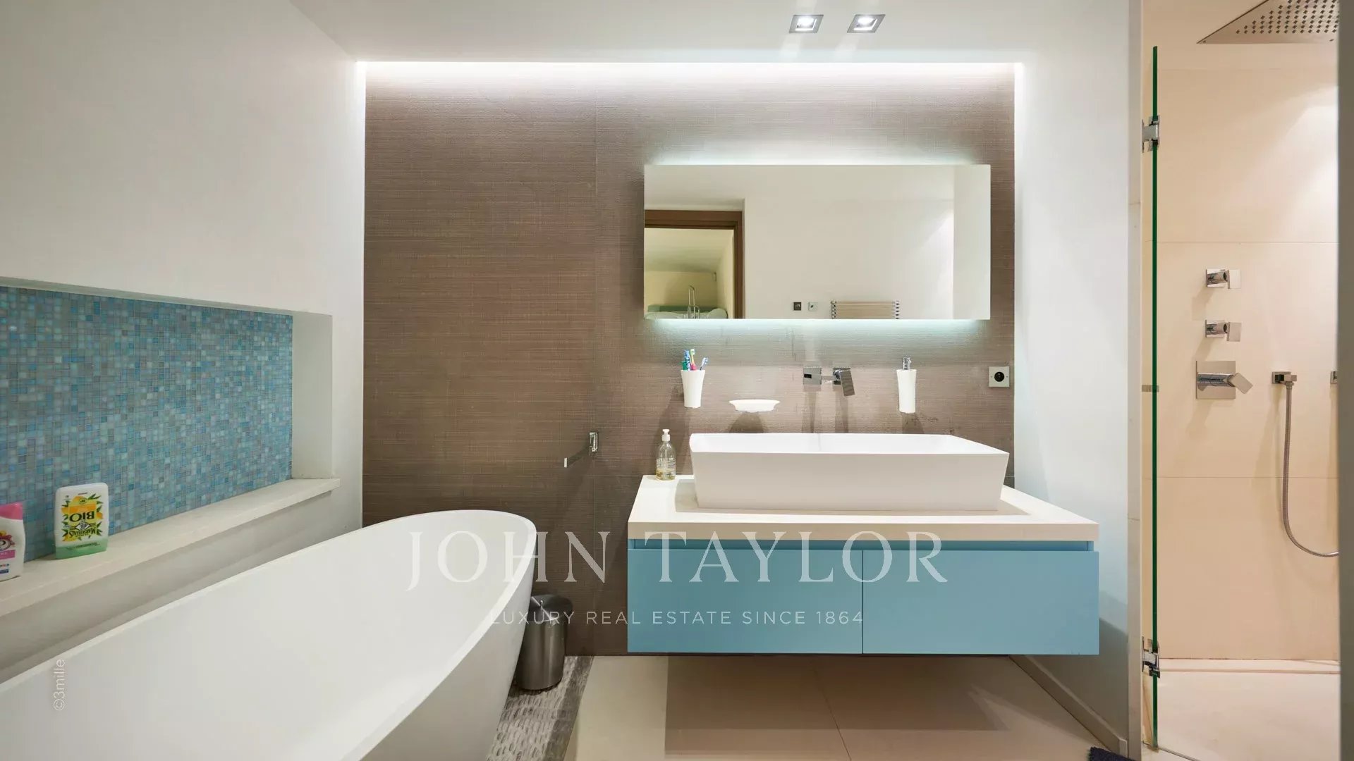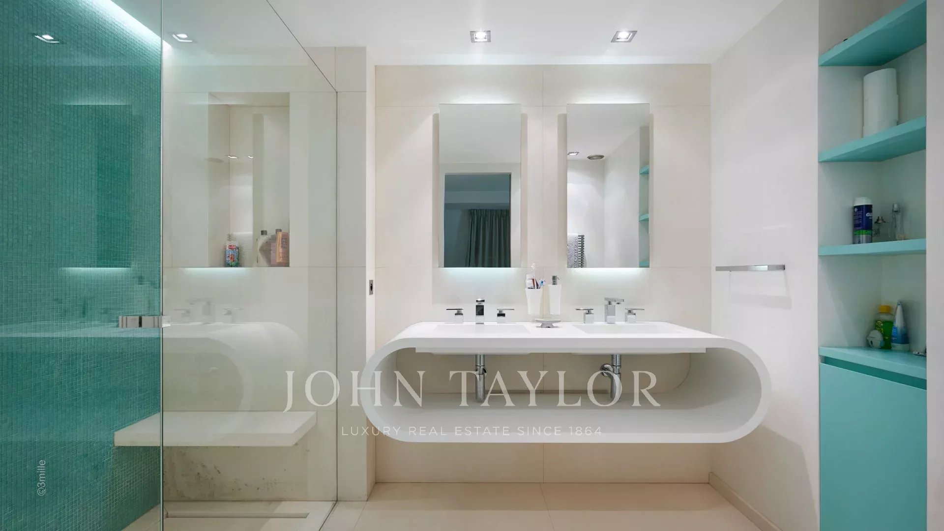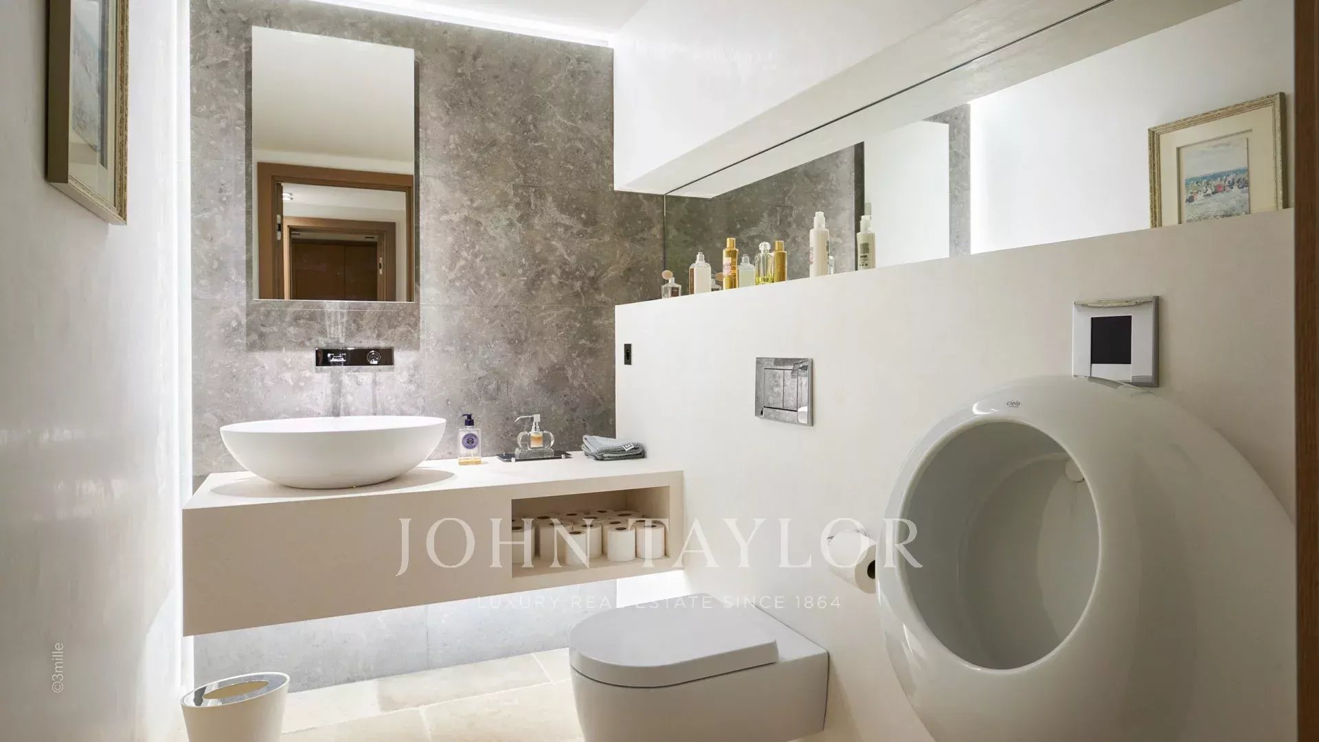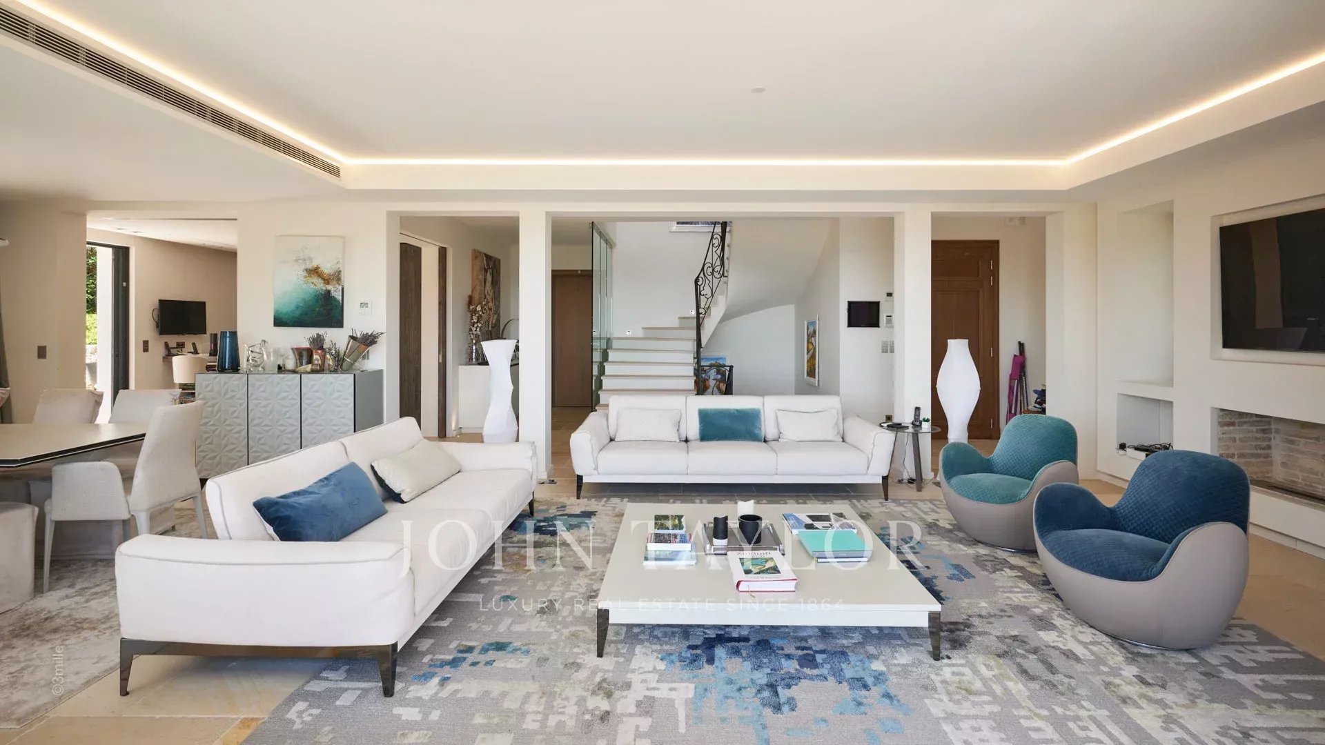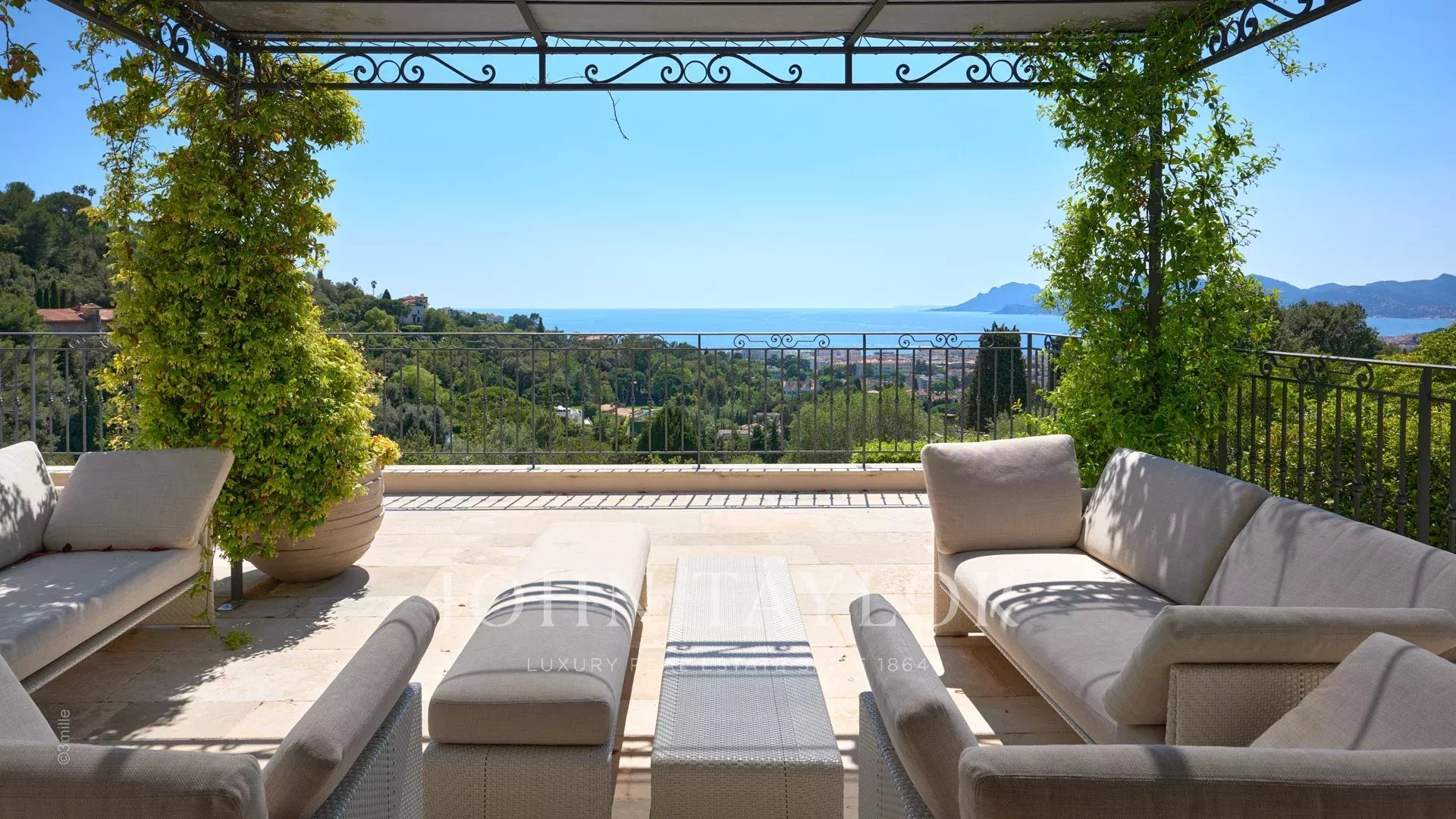 Entrée donnant sur la pièce de réception comprenant salon, salle à manger et cuisine ouverte, le tout s’ouvrant sur la terrasse jouissant d’une vue mer panoramique sur la baie de Cannes.