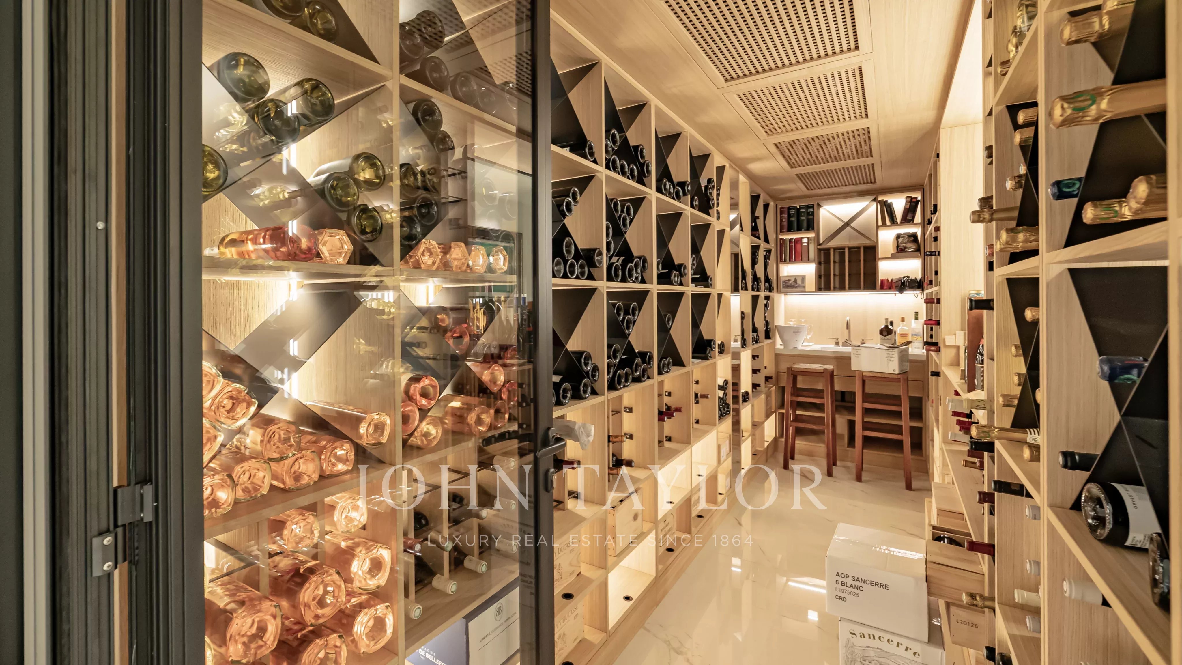 Le niveau inférieur accueille une chambre avec salle de douches et toilettes, une cave à vins, ainsi qu’un appartement pour le personnel comprenant une cuisine, une chambre et une salle de douches avec toilettes.