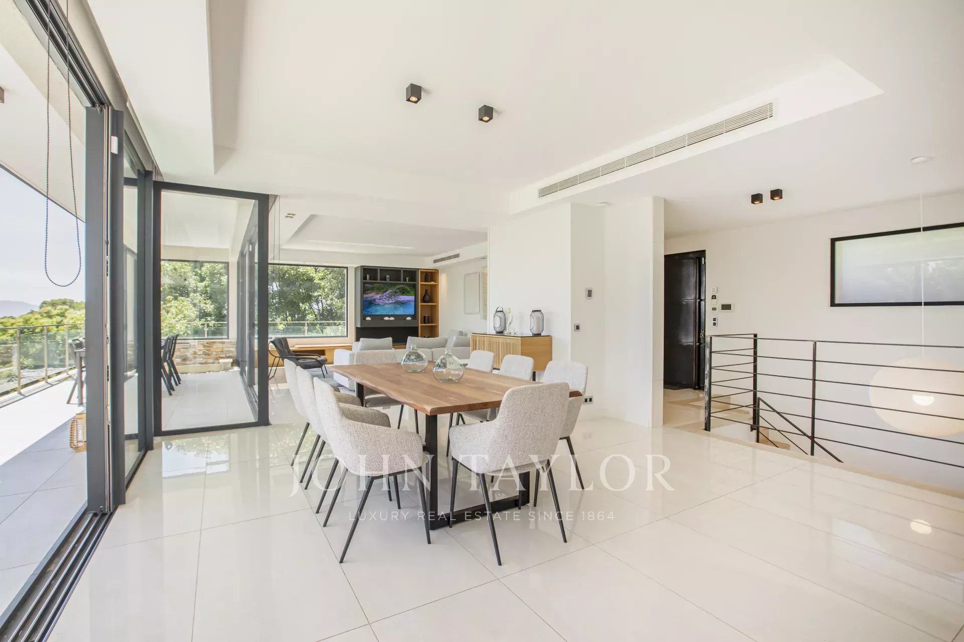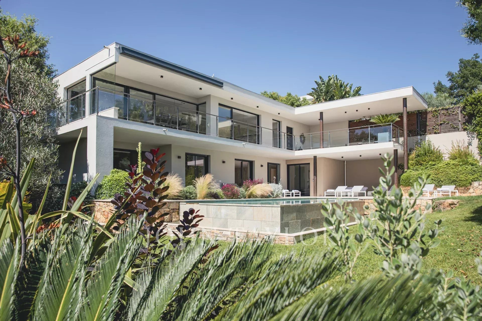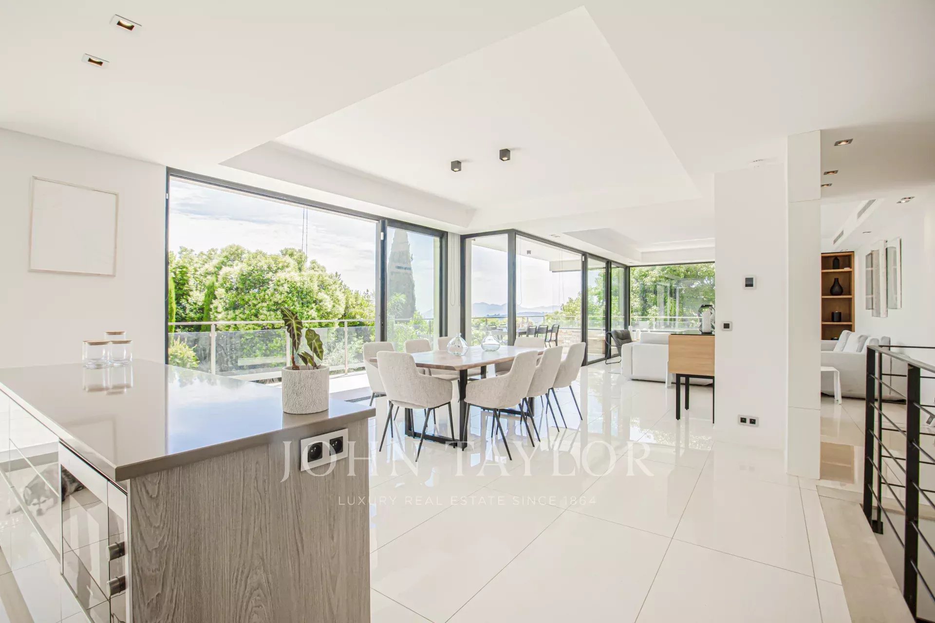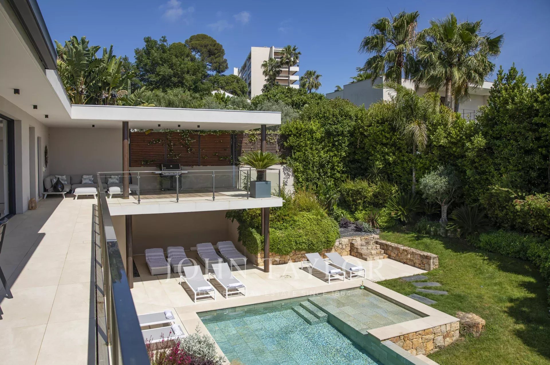 Sur les hauteurs de Cannes, dans un quartier résidentiel à proximité du vieux village du Cannet, belle villa contemporaine entièrement climatisée d’environ 240 m2 habitables au cœur d’un terrain arboré et exotique de 1 374 m2.