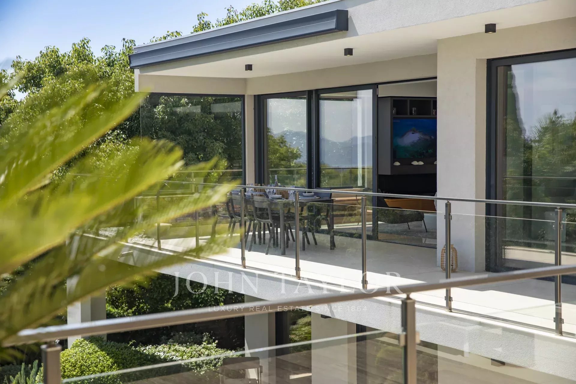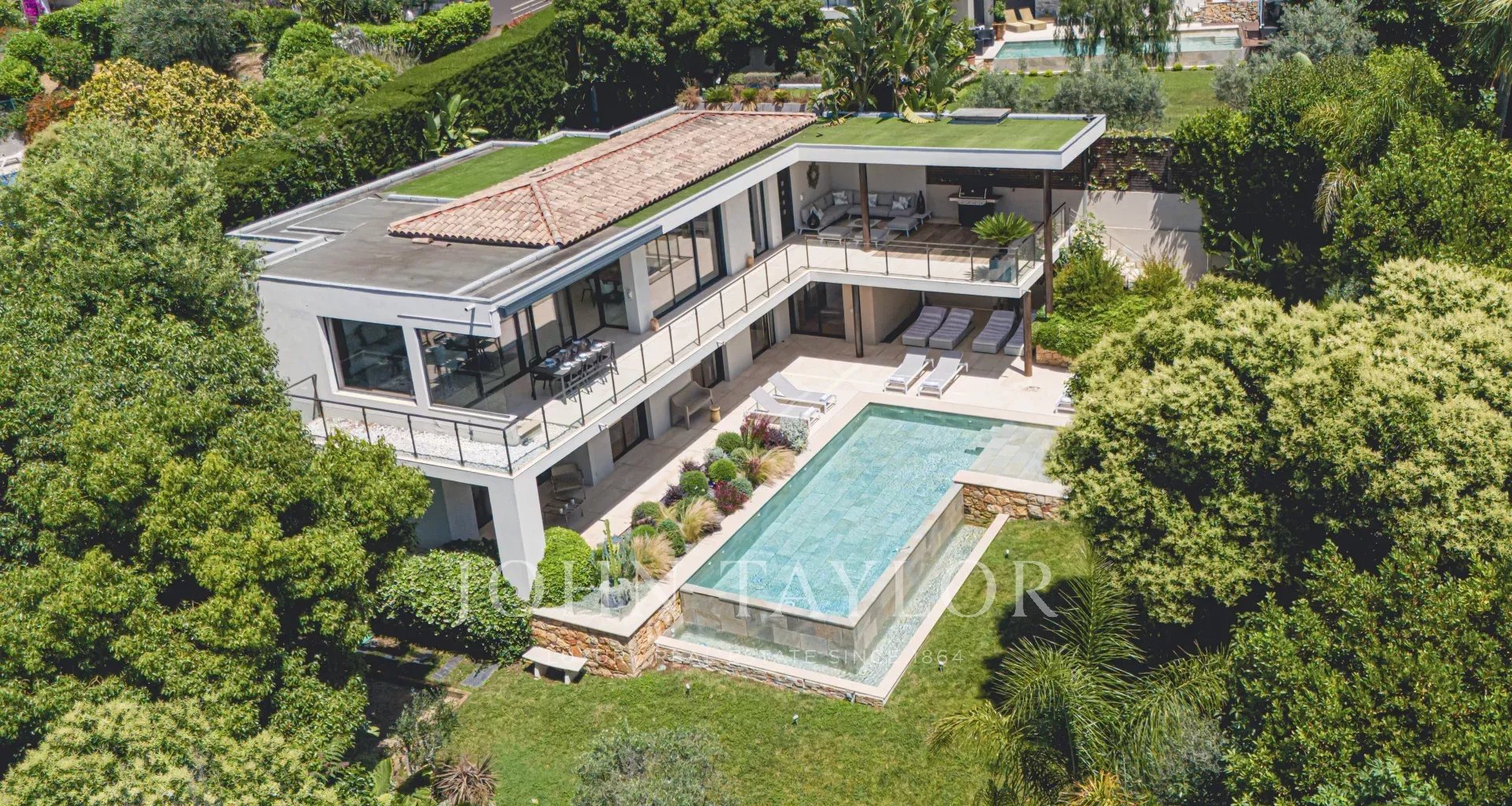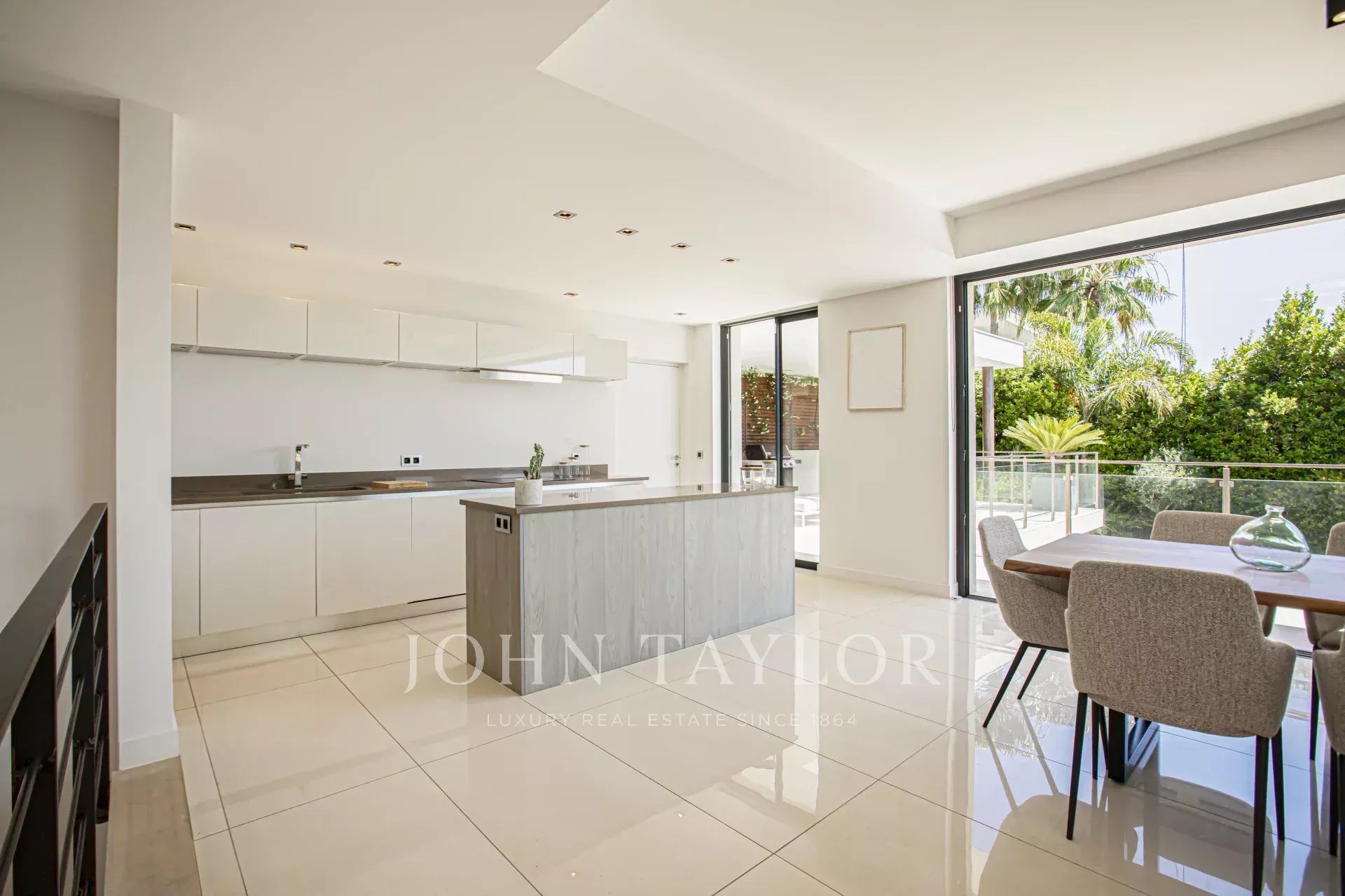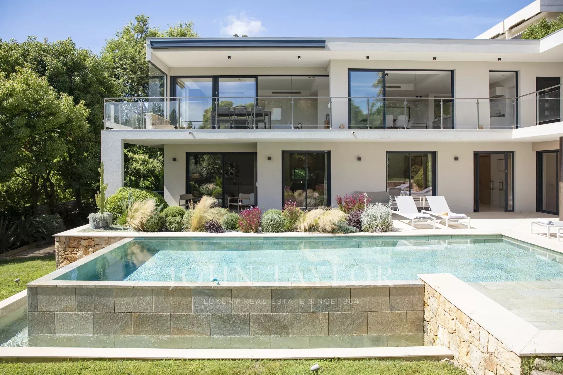 Sur les hauteurs de Cannes, dans un quartier résidentiel à proximité du vieux village du Cannet, belle villa contemporaine entièrement climatisée d’environ 240 m2 habitables au cœur d’un terrain arboré et exotique de 1 374 m2.