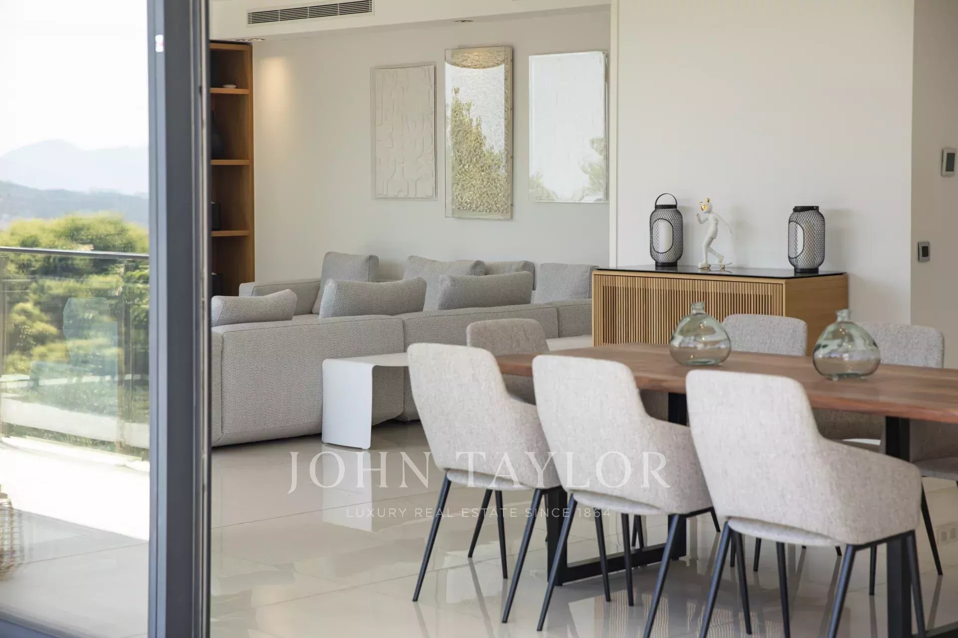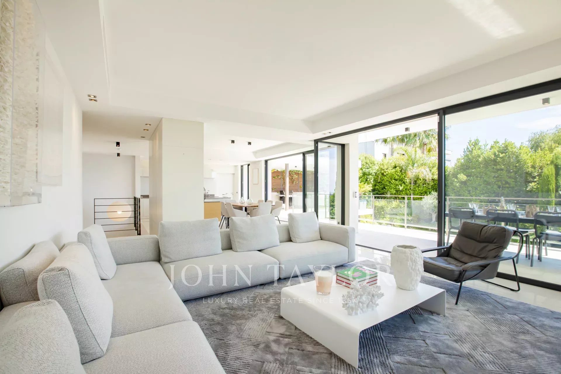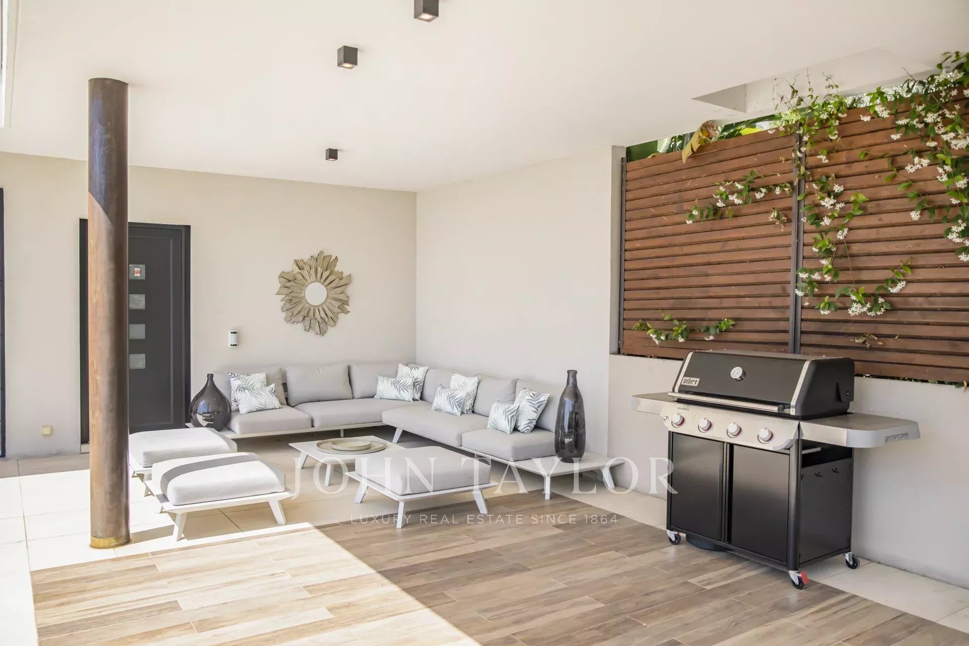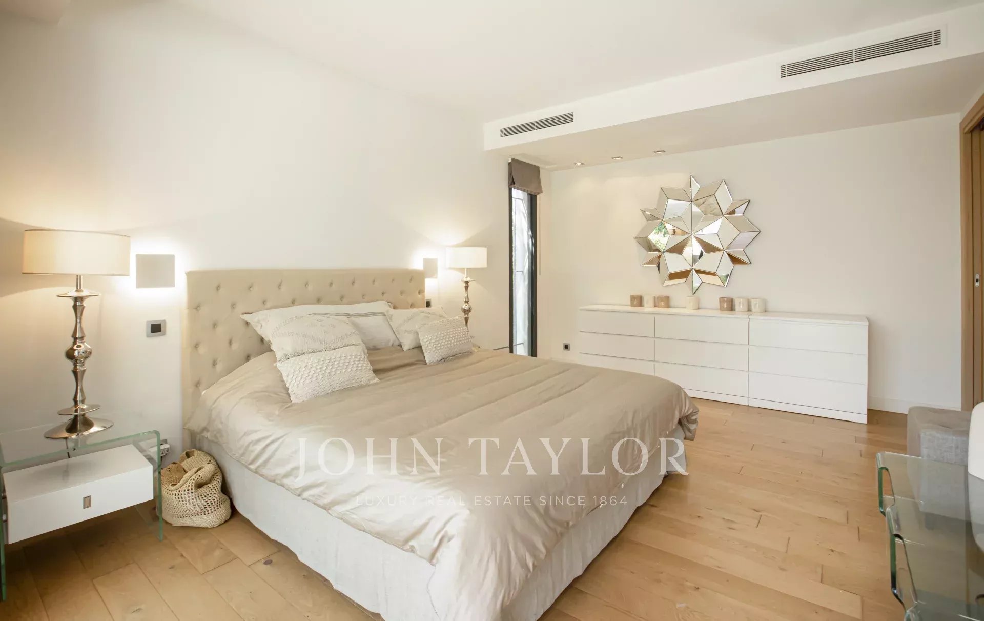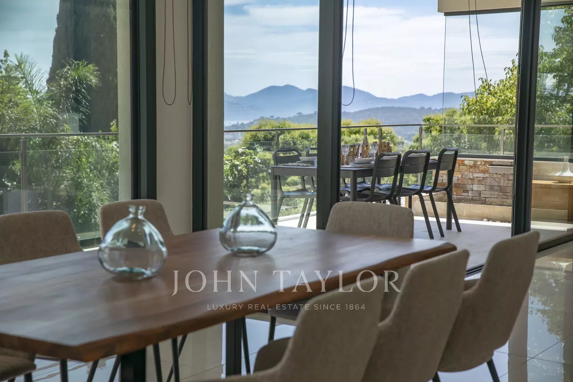 Sur les hauteurs de Cannes, dans un quartier résidentiel à proximité du vieux village du Cannet, belle villa contemporaine entièrement climatisée d’environ 240 m2 habitables au cœur d’un terrain arboré et exotique de 1 374 m2.