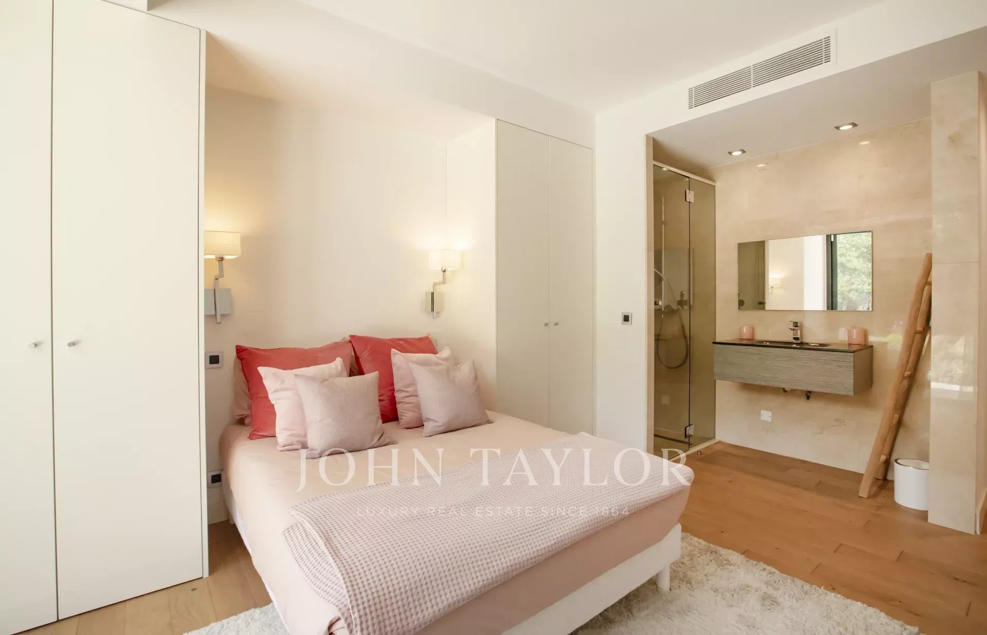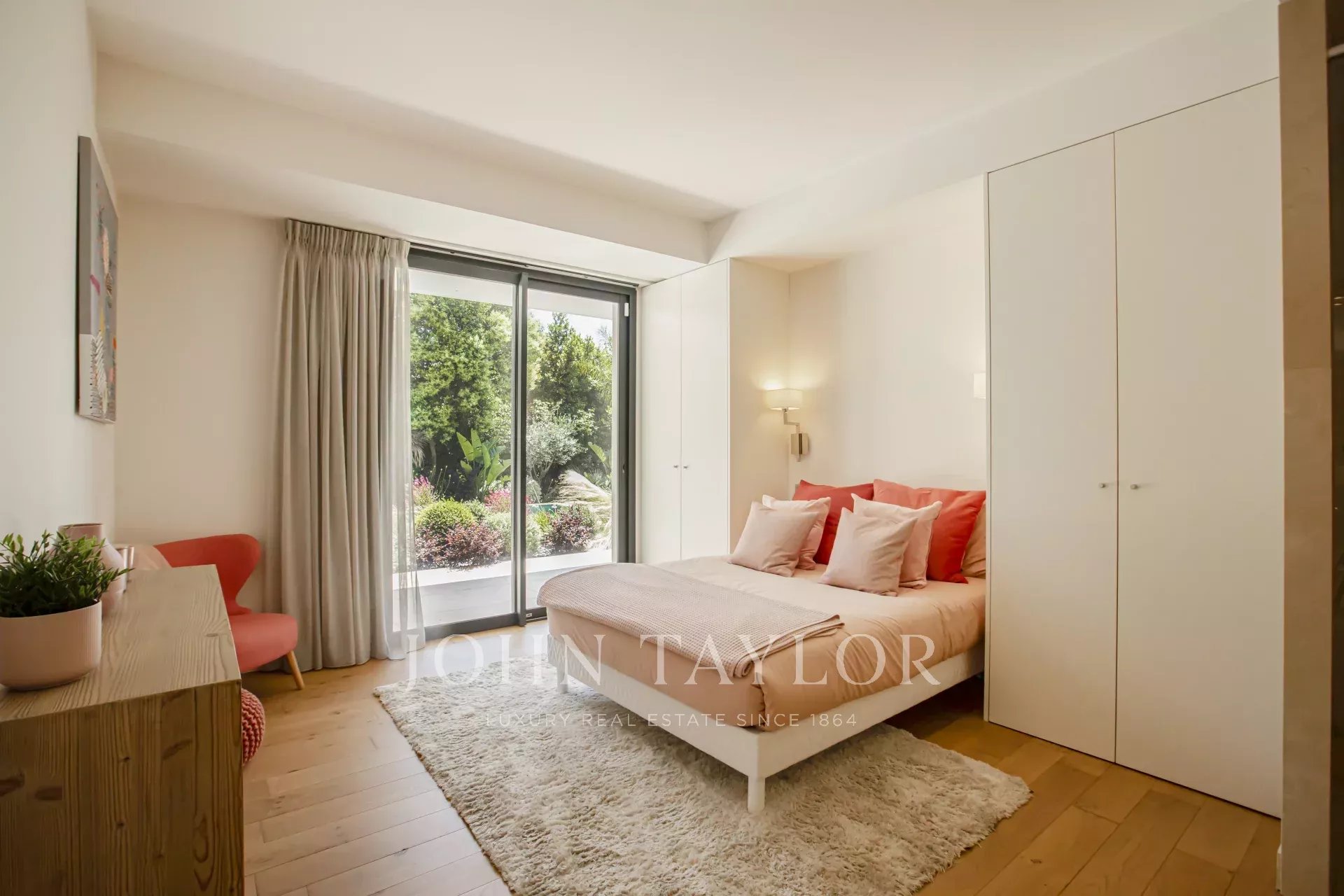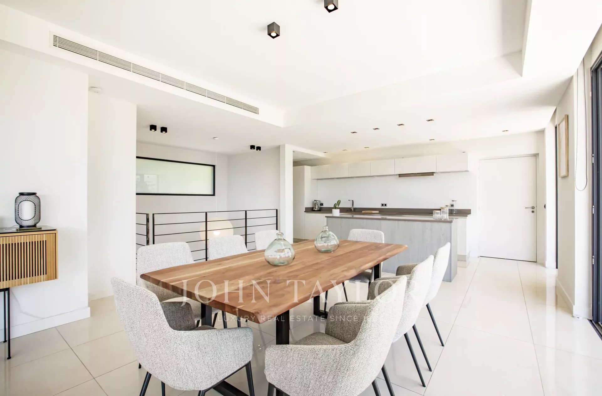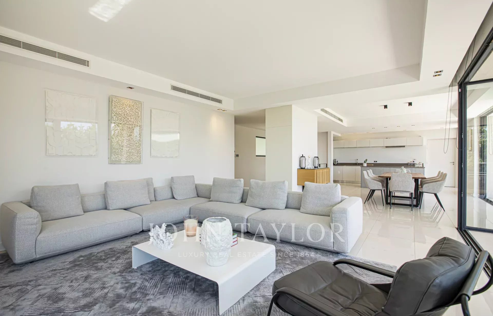 Sur les hauteurs de Cannes, dans un quartier résidentiel à proximité du vieux village du Cannet, belle villa contemporaine entièrement climatisée d’environ 240 m2 habitables au cœur d’un terrain arboré et exotique de 1 374 m2.