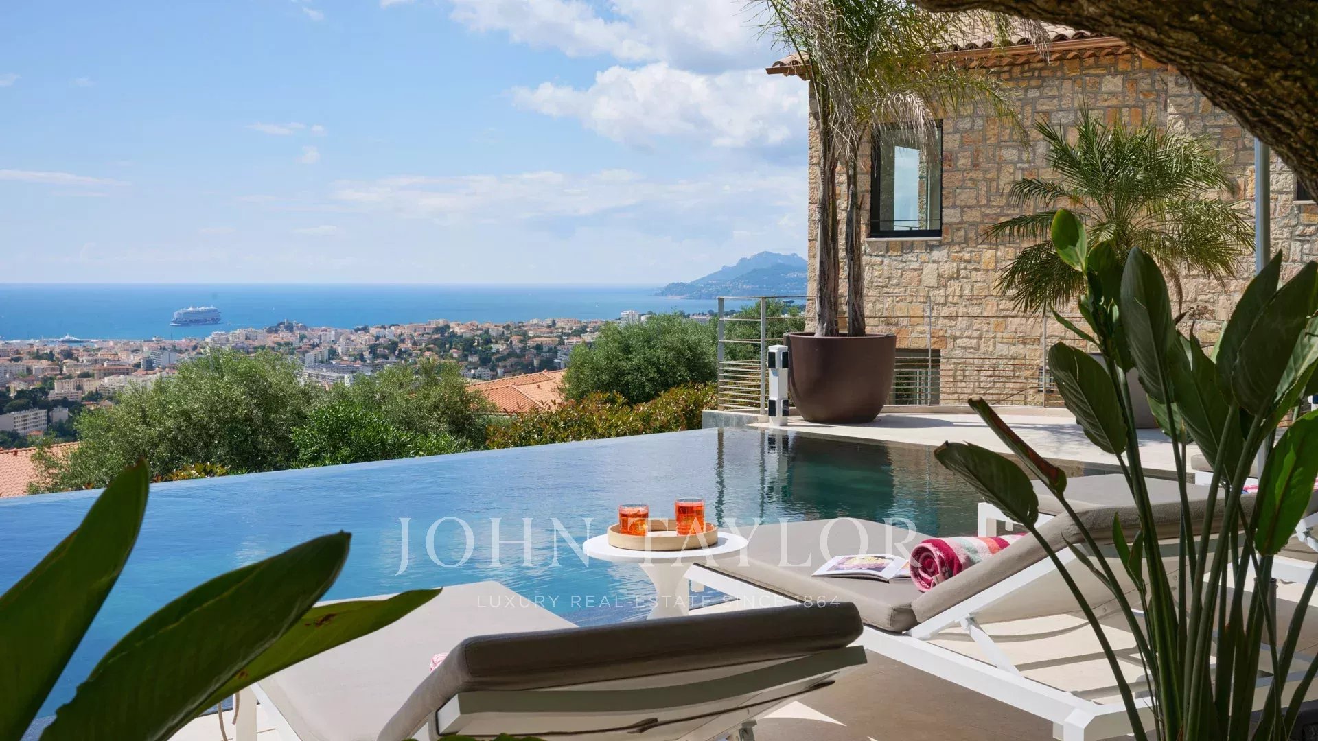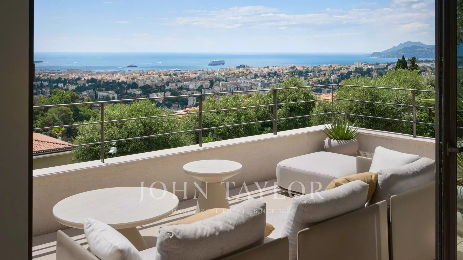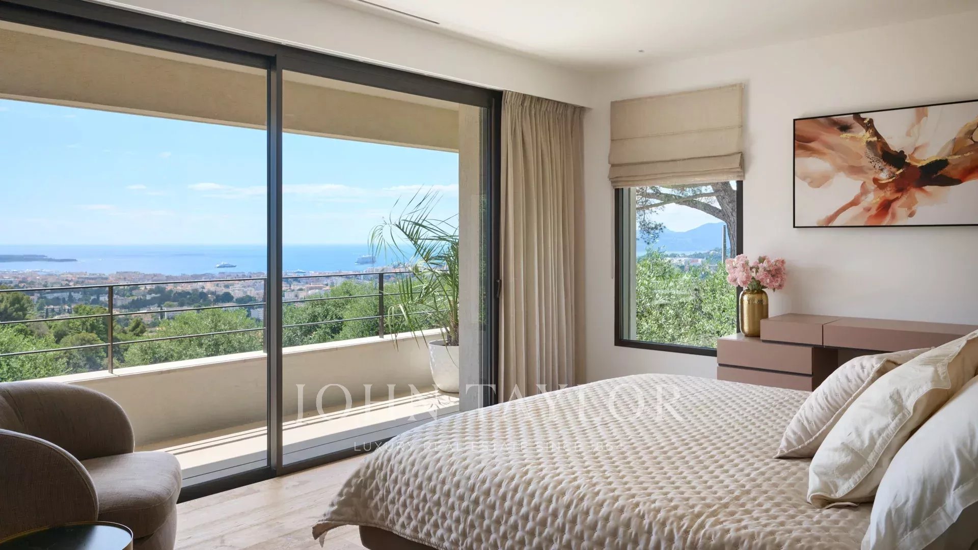 Sur les hauteurs de Cannes, superbe villa contemporaine d’environ 440 m2 habitables, entièrement climatisée, bénéficiant d'une très belle vue mer sur la Baie de Cannes et le massif de l'Estérel.