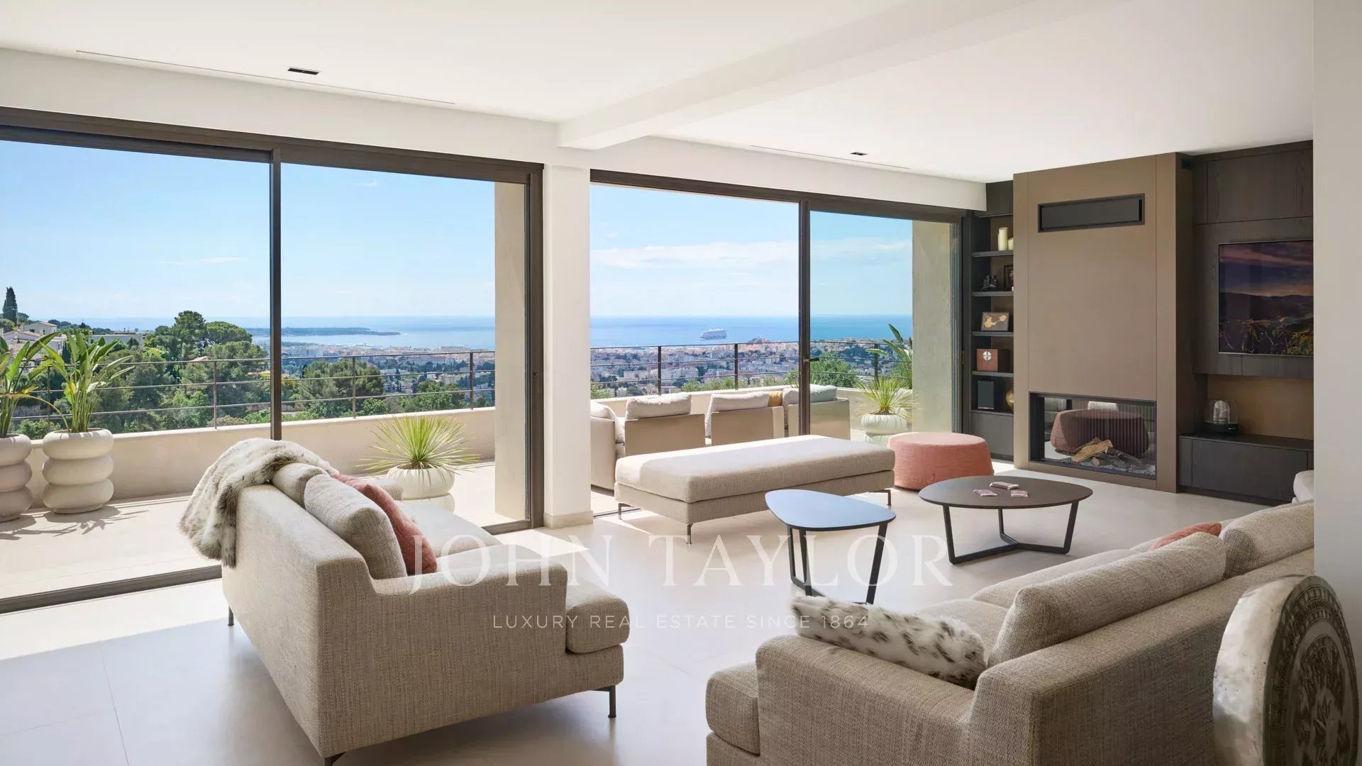 Salon TV avec cheminée s’ouvrant sur terrasse, vue mer et Estérel