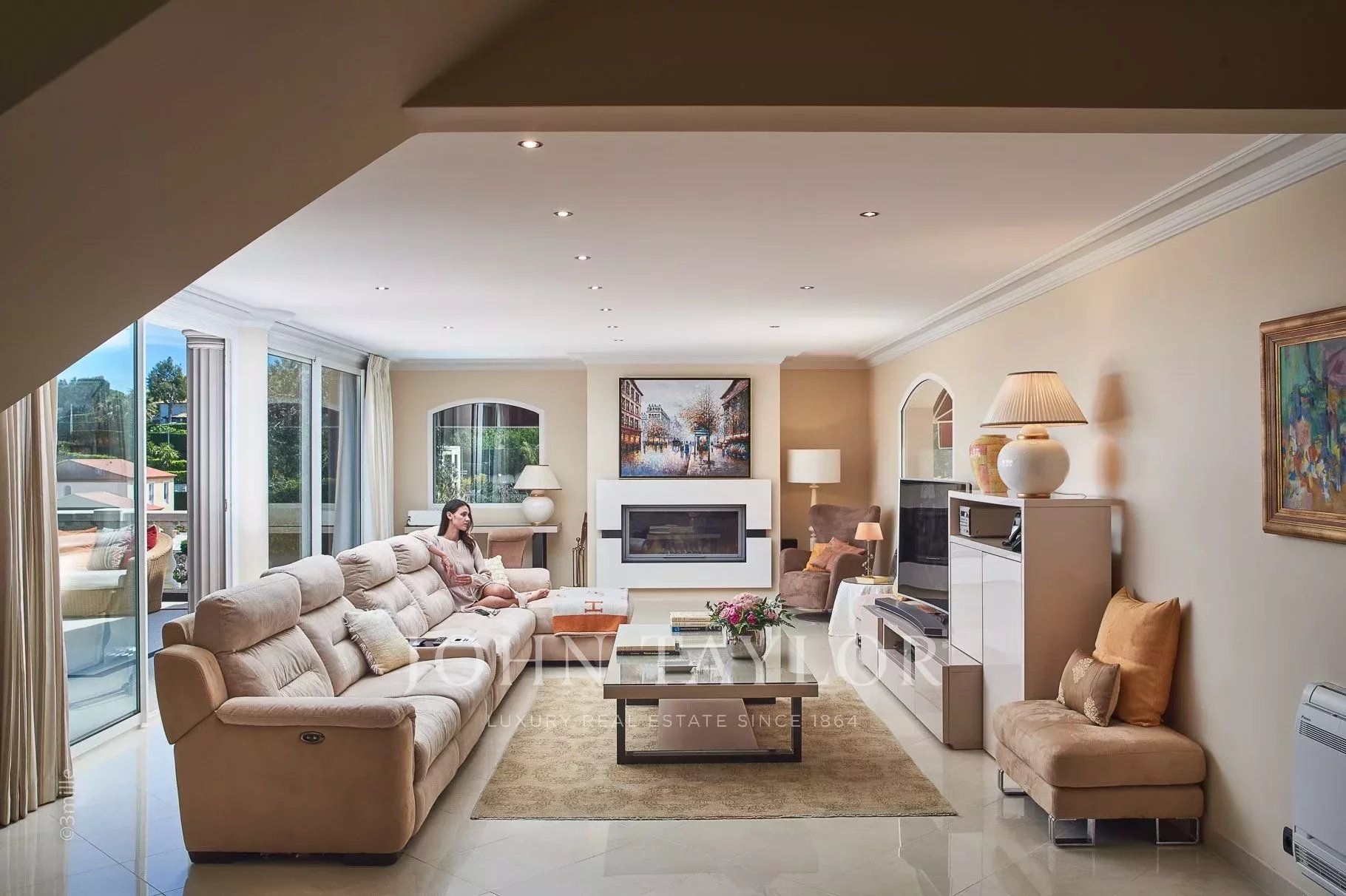 Salon avec cheminée, équipé d'un grand écran plasma, s'ouvrant sur une grande terrasse jouissant d'une vue mer et montage et équipée d'un salon d’été