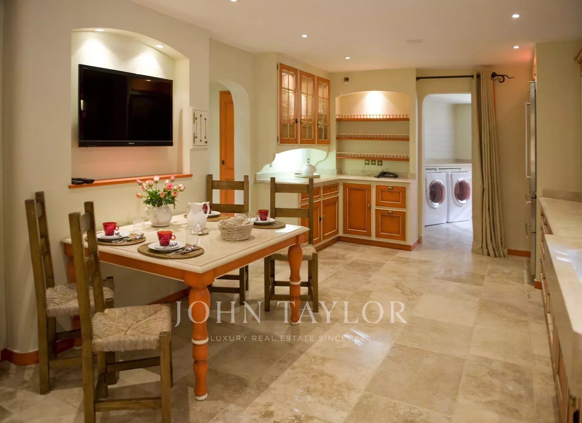 Cuisine indépendante entièrement équipée (TV) avec un espace pour prendre les repas. La cuisine ouvre sur une terrasse aménagée en salle à manger d'été avec barbecue et cuisine d'été, face à la piscine avec vue sur le massif de l'Estérel.