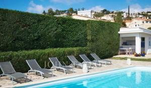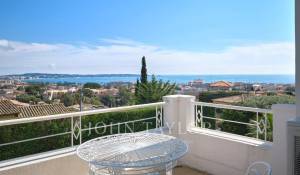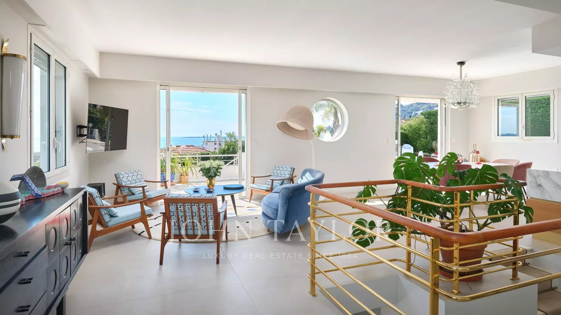 Sur les hauteurs de Golfe-Juan et à 800 m des plages, au cœur d’un jardin de 1 000 m2, villa moderne d’environ 180 m2 habitables jouissant d’une belle vue mer.