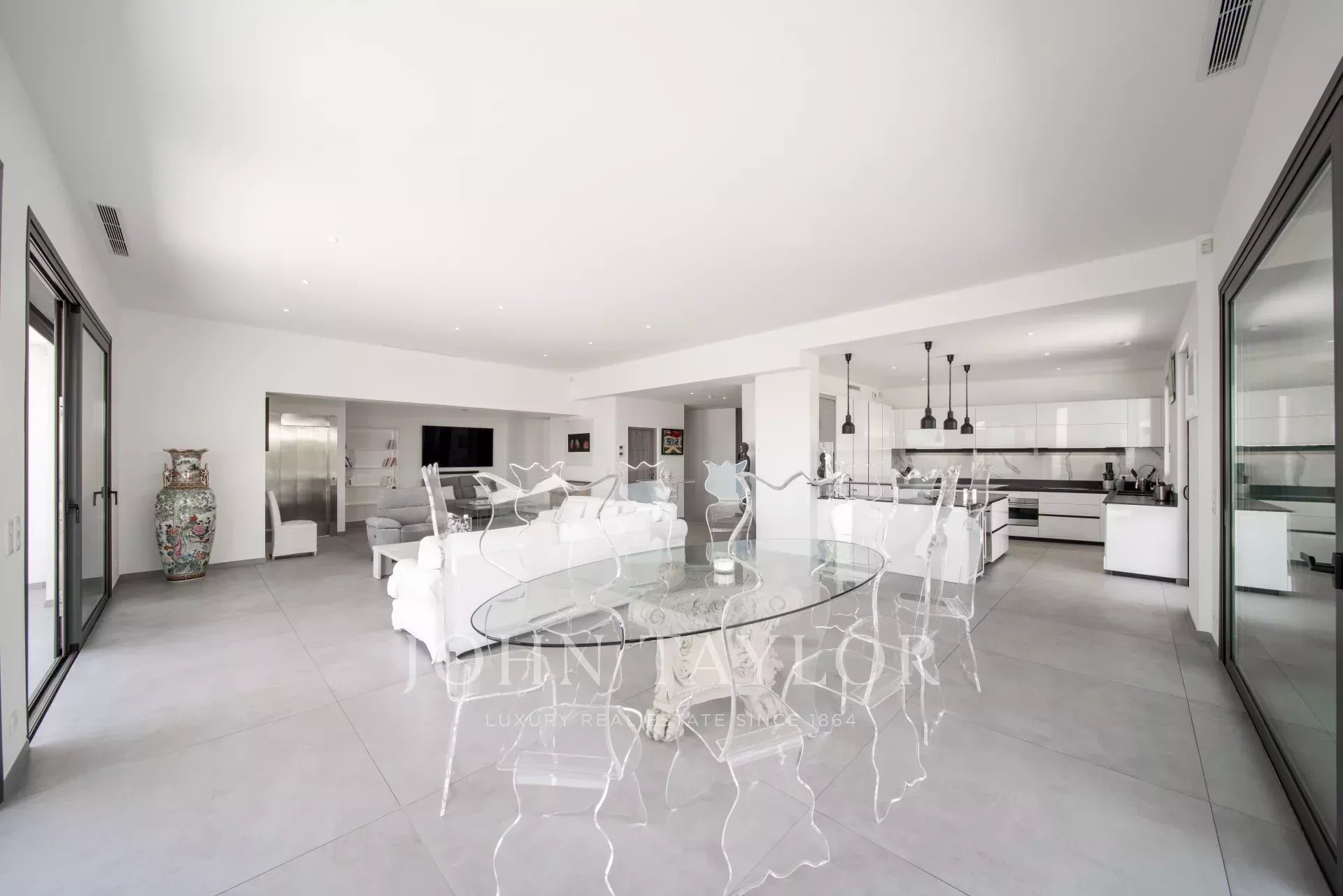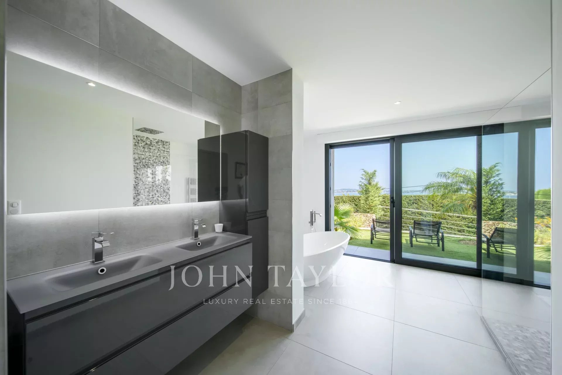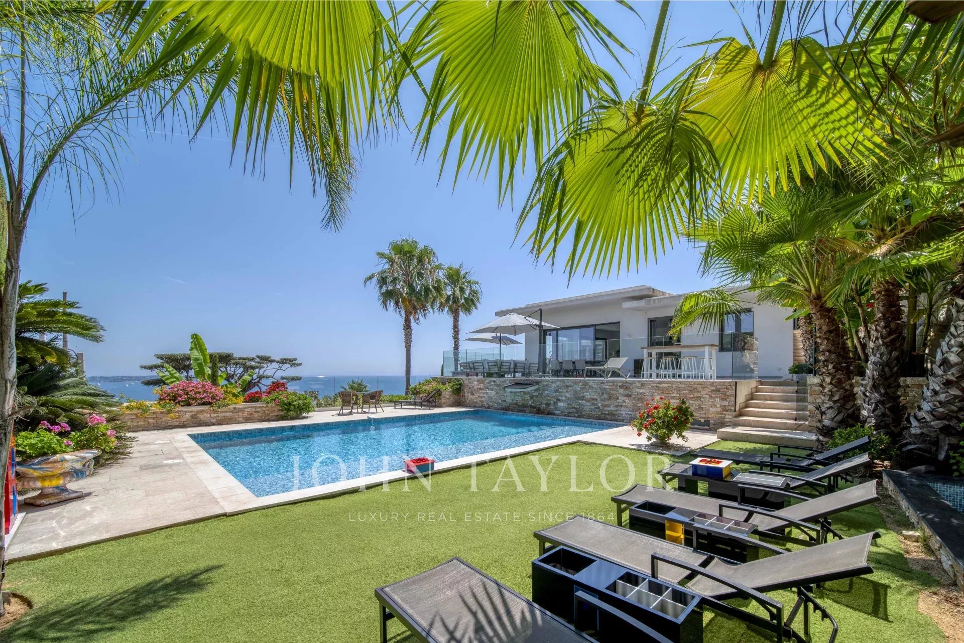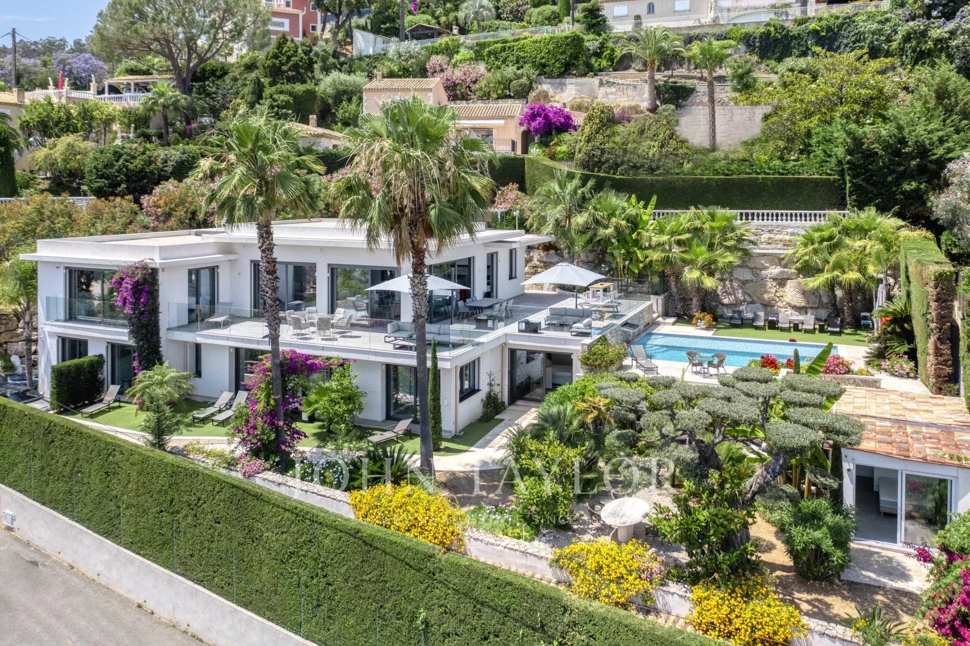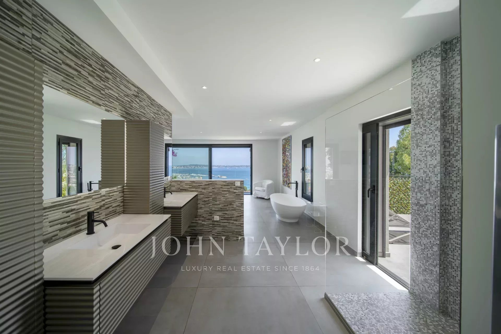 Dominant les hauteurs de Golfe Juan, à deux pas de Cannes, cette villa contemporaine offre un cadre de villégiature avec une vue spectaculaire sur la Méditerranée et le légendaire Cap d’Antibes.