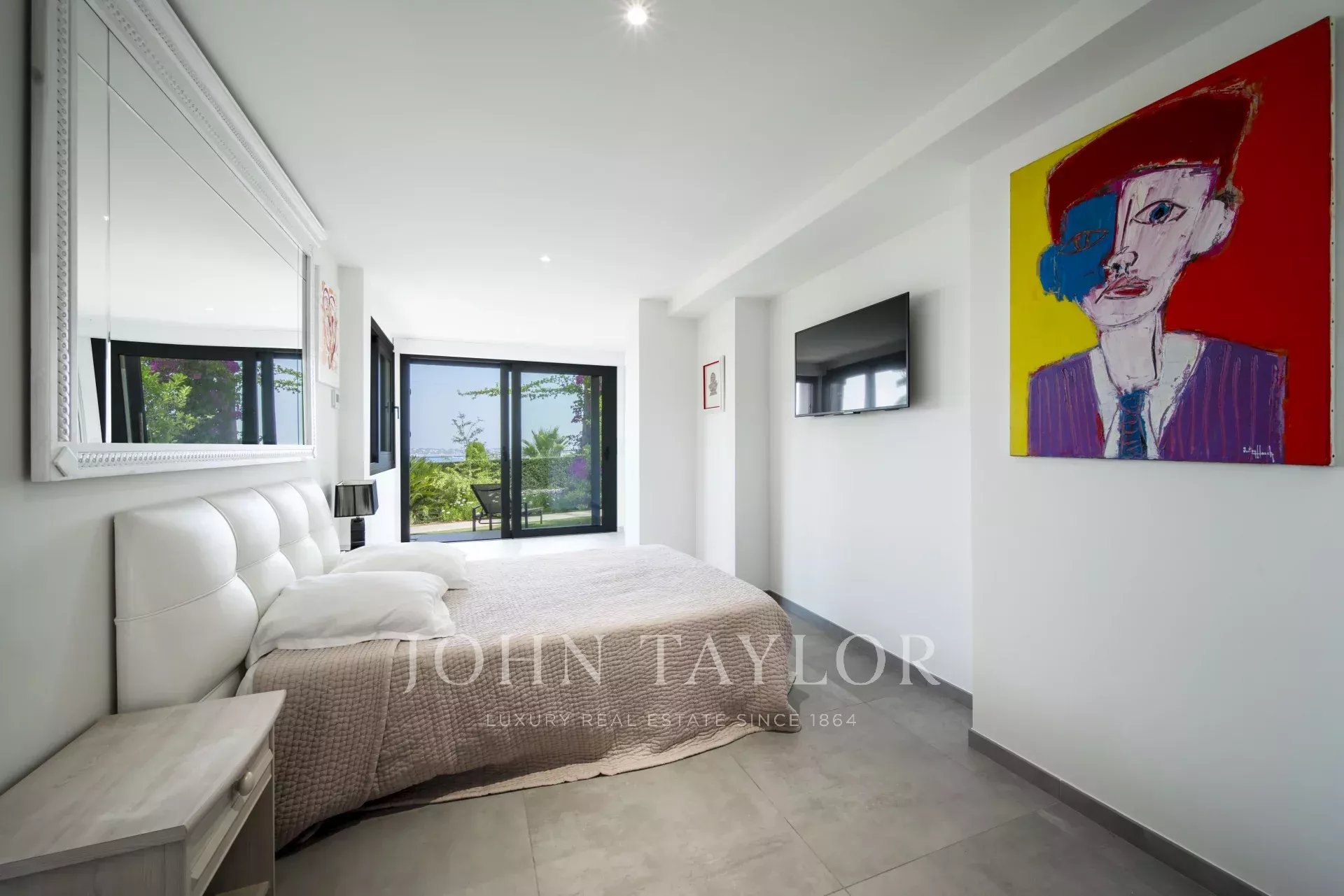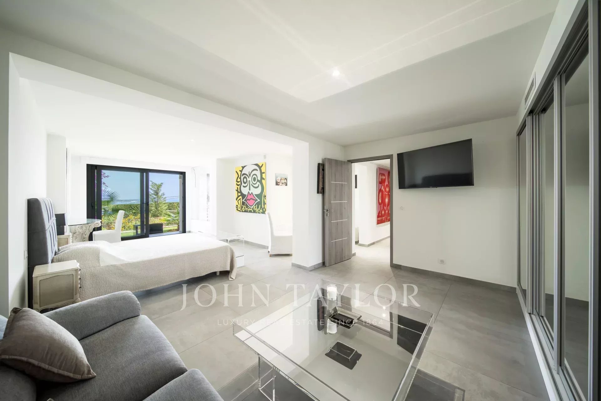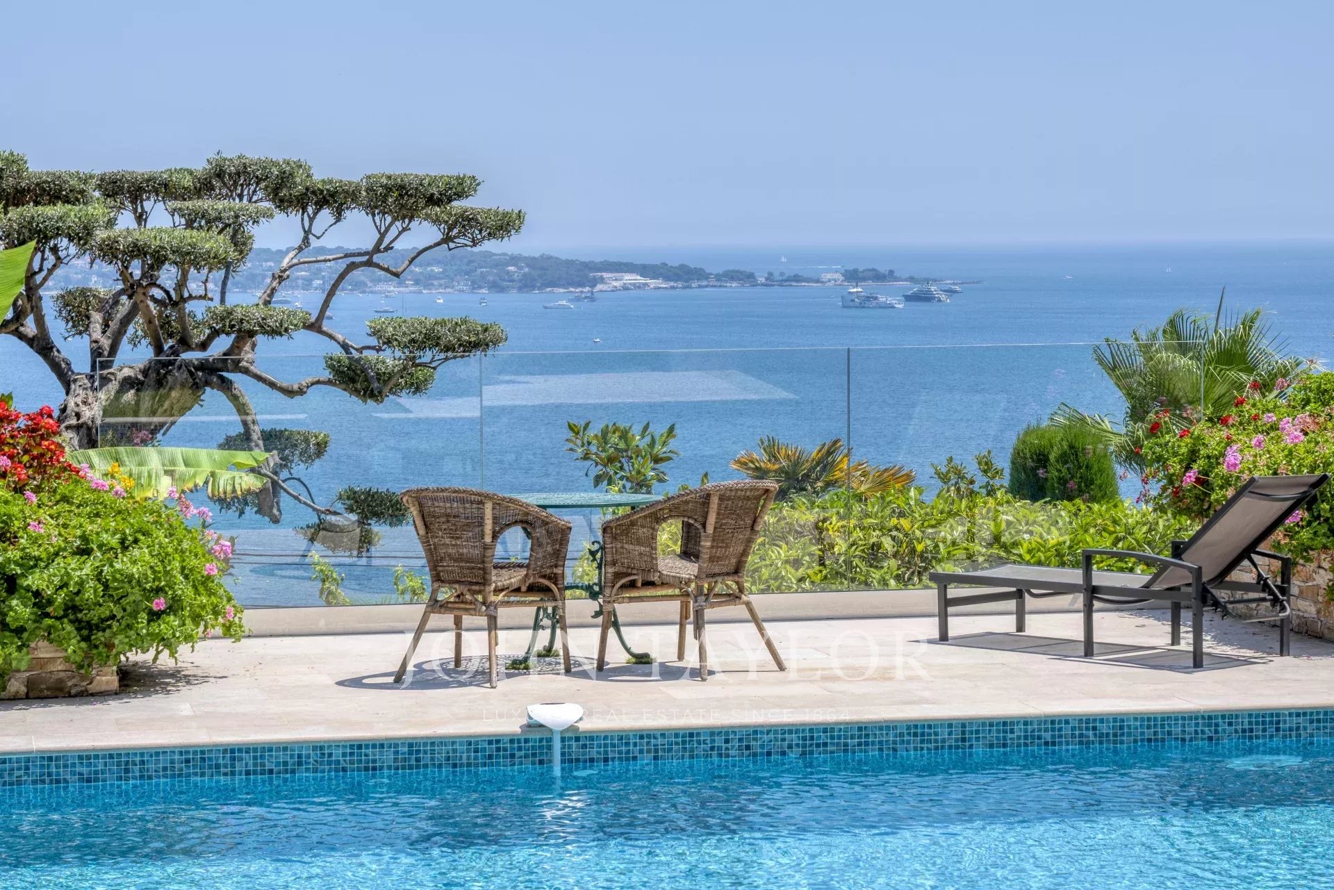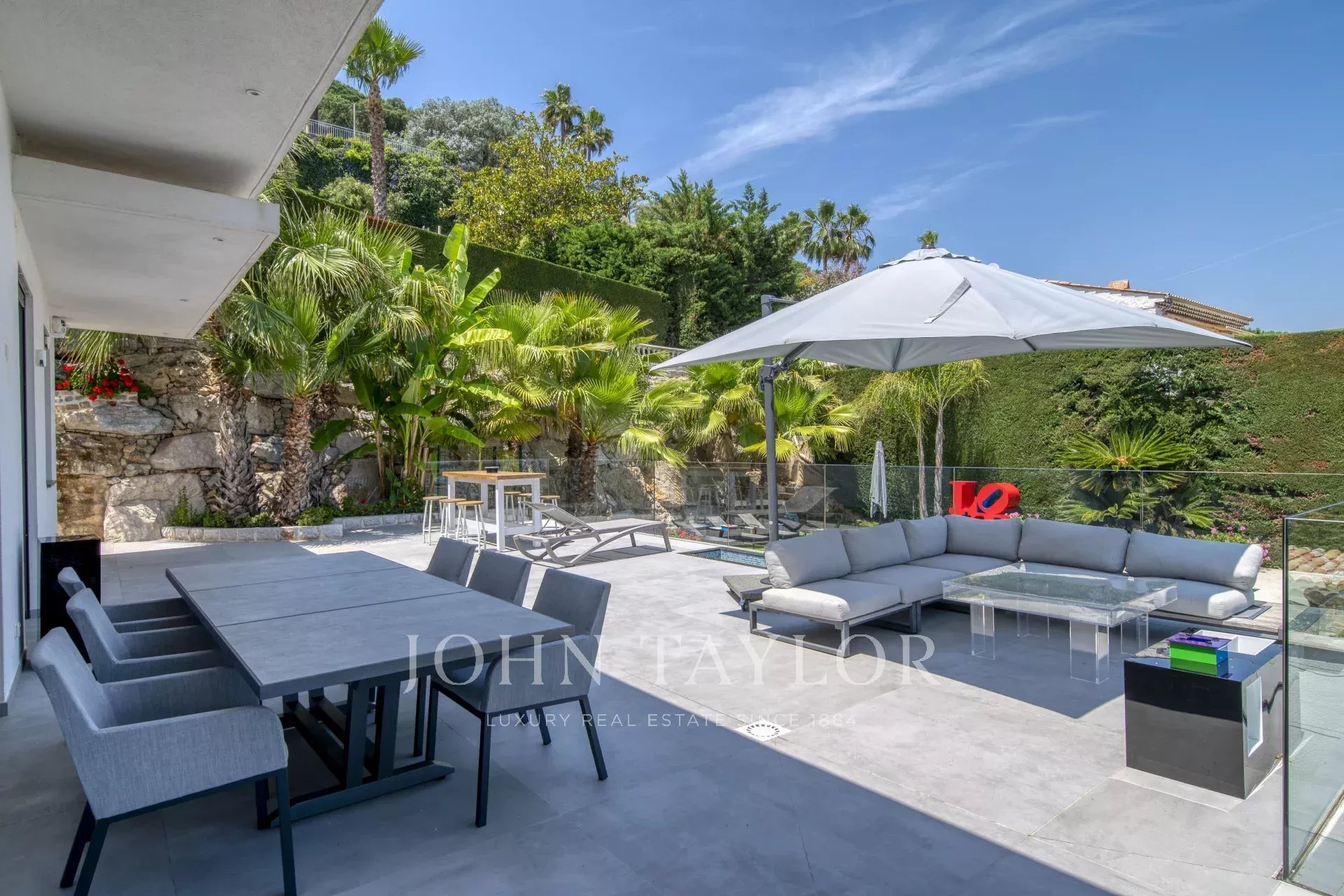 Dominant les hauteurs de Golfe Juan, à deux pas de Cannes, cette villa contemporaine offre un cadre de villégiature avec une vue spectaculaire sur la Méditerranée et le légendaire Cap d’Antibes.