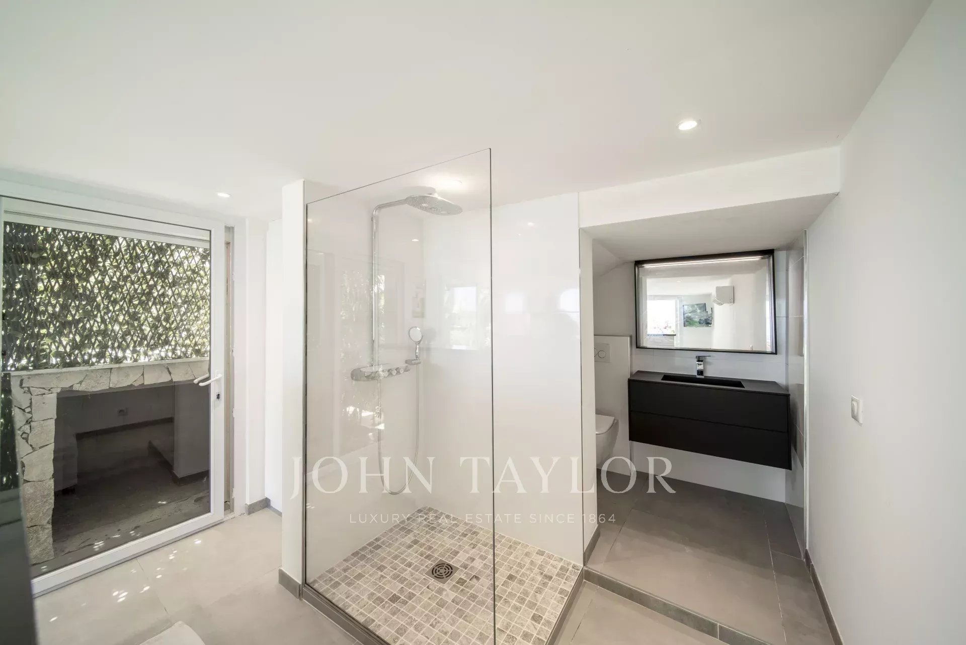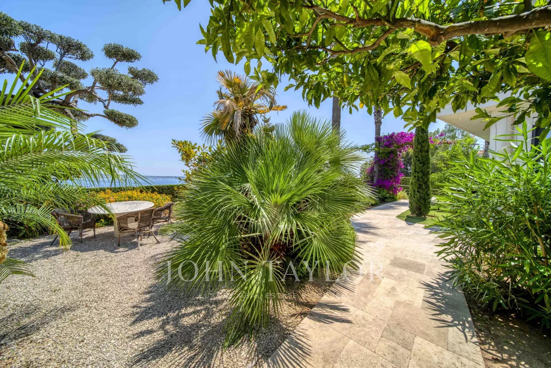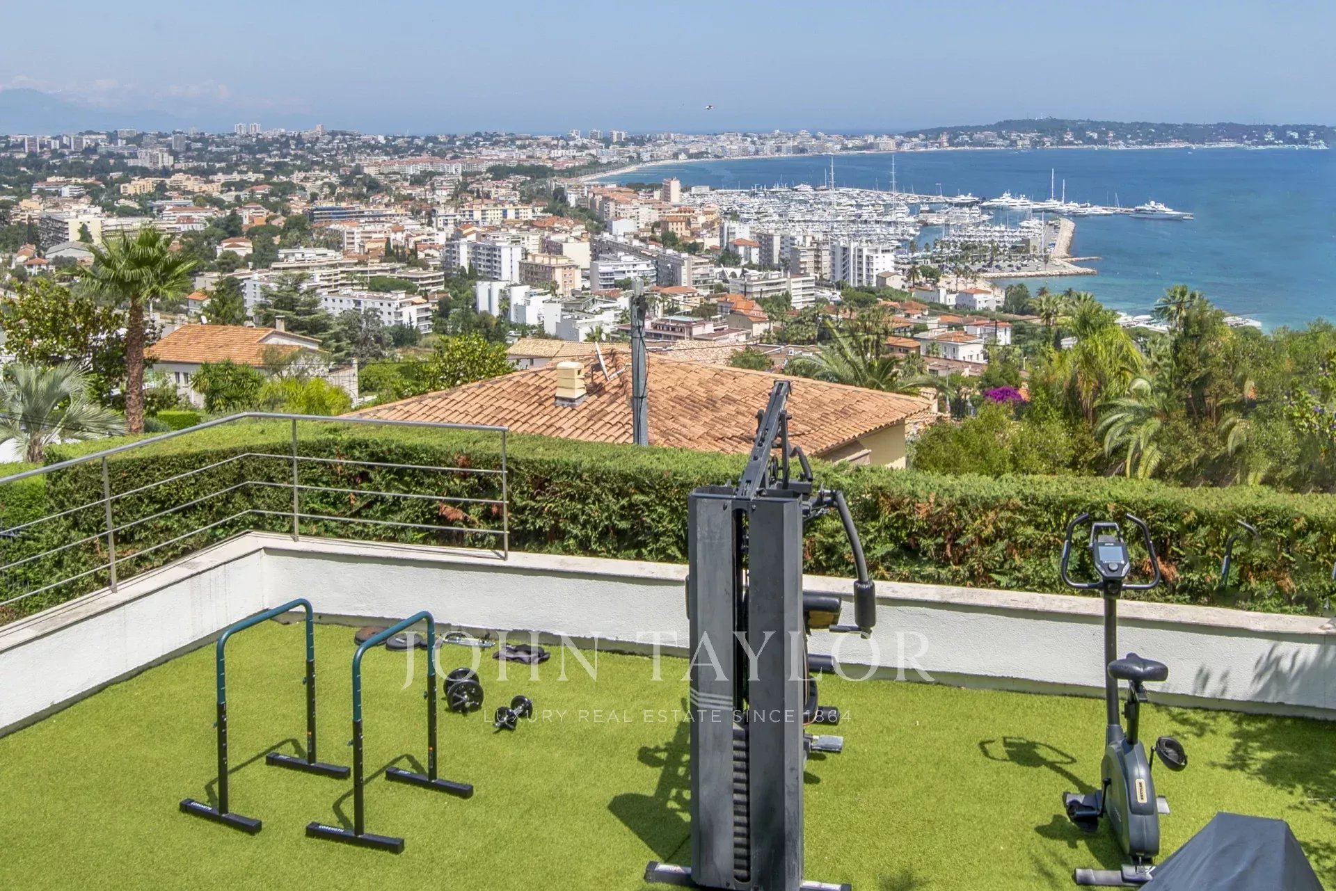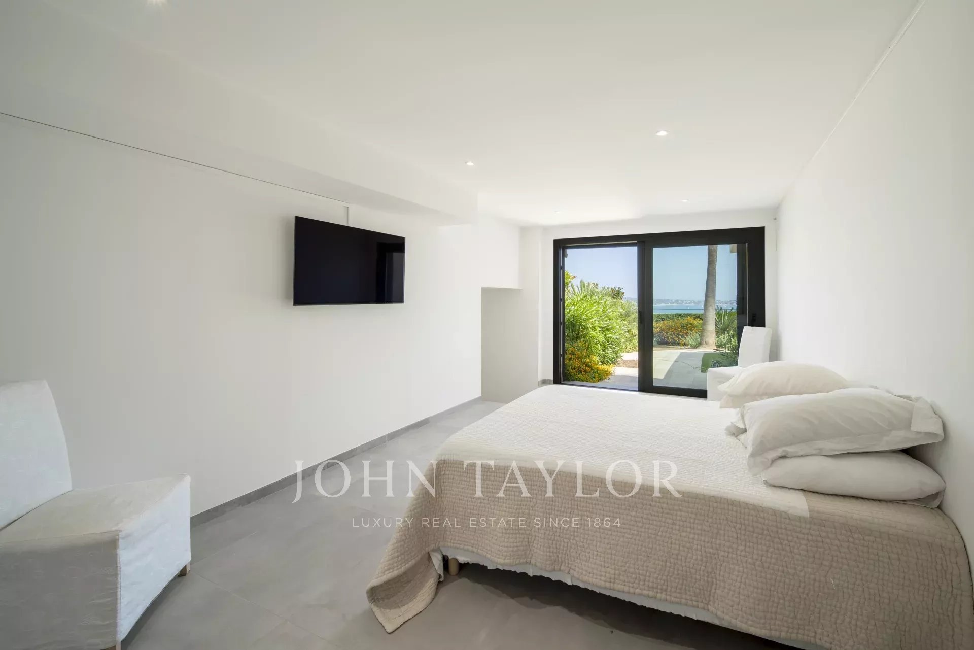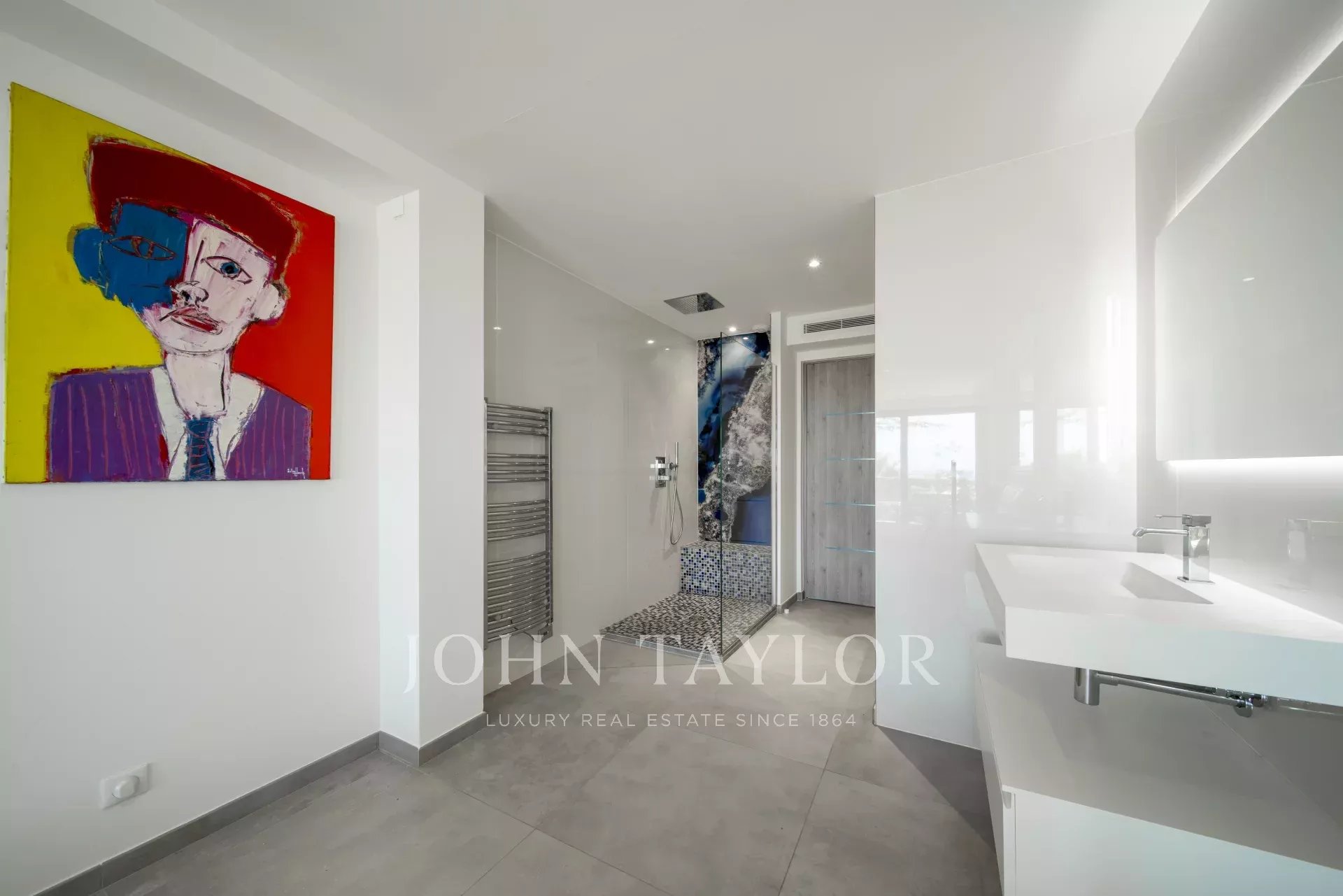 Dominant les hauteurs de Golfe Juan, à deux pas de Cannes, cette villa contemporaine offre un cadre de villégiature avec une vue spectaculaire sur la Méditerranée et le légendaire Cap d’Antibes.