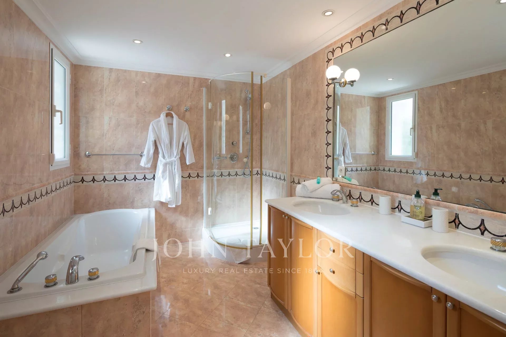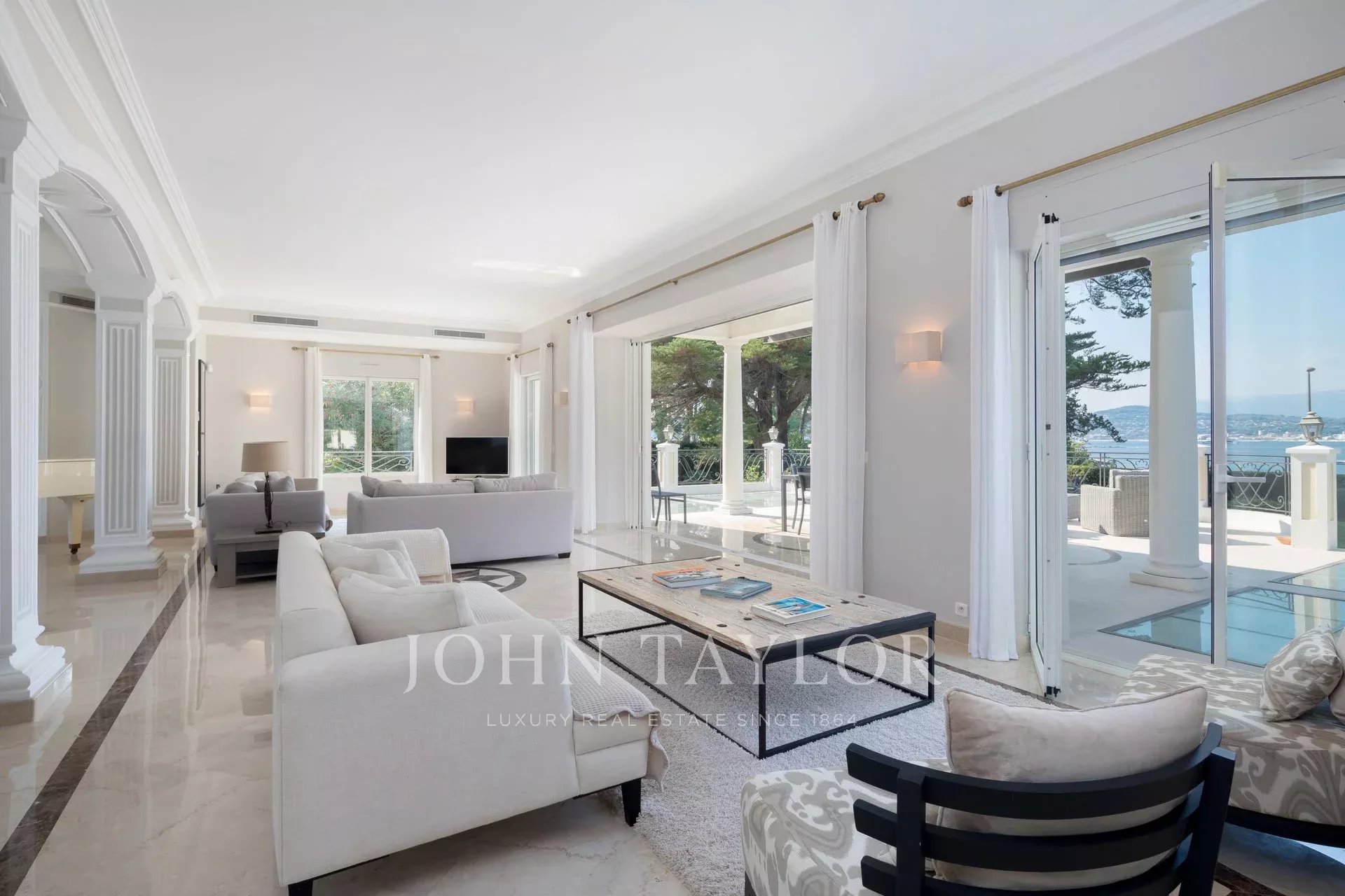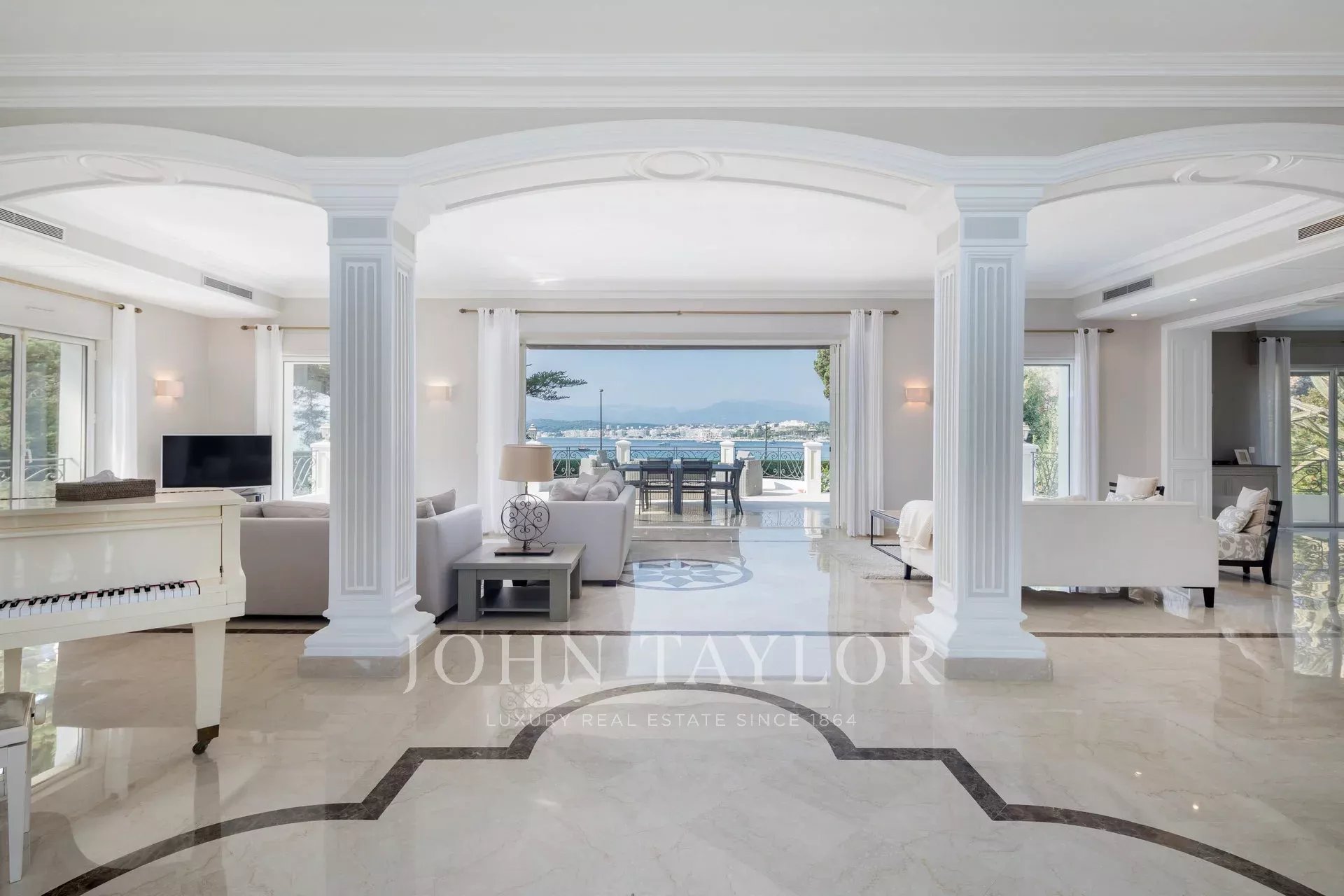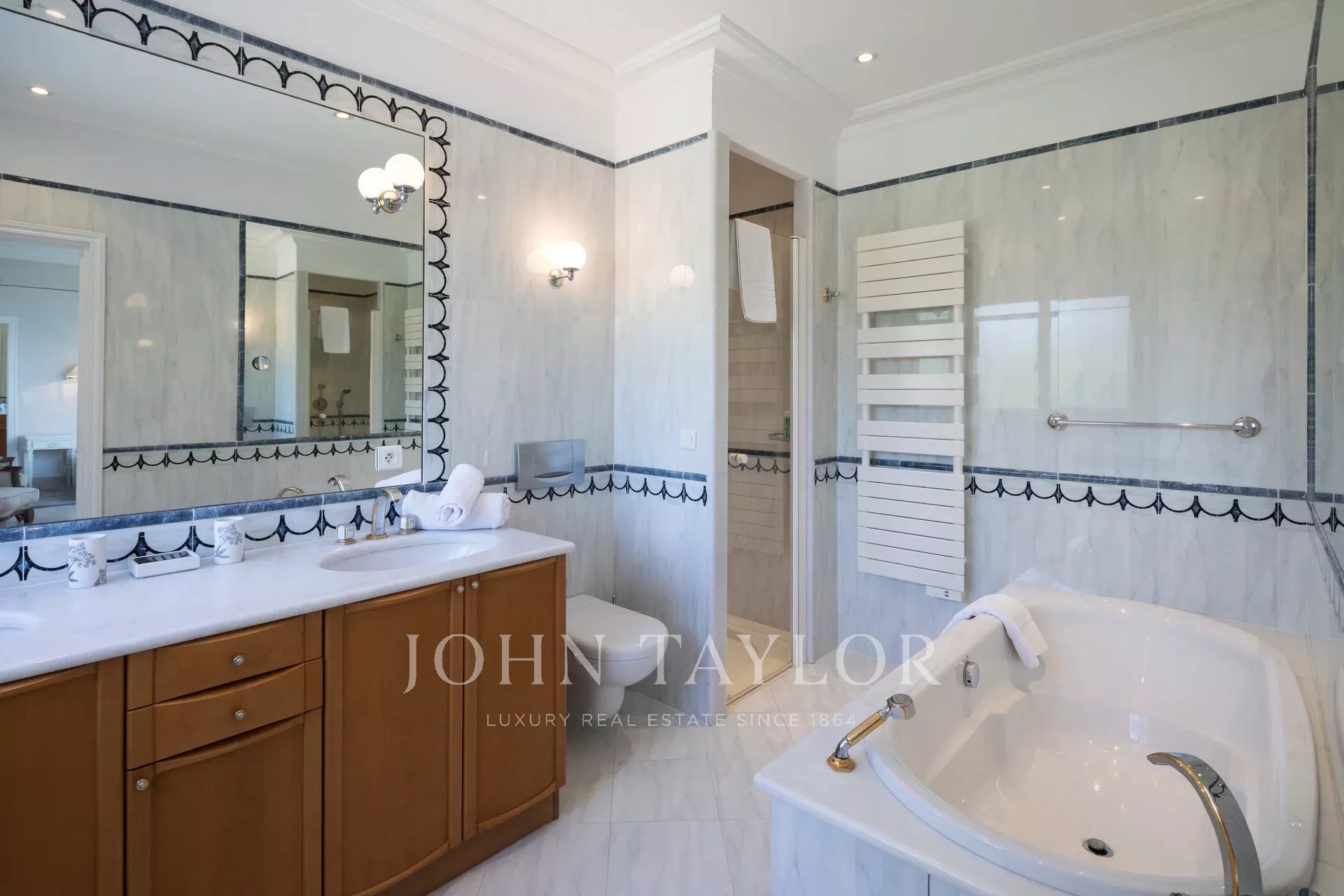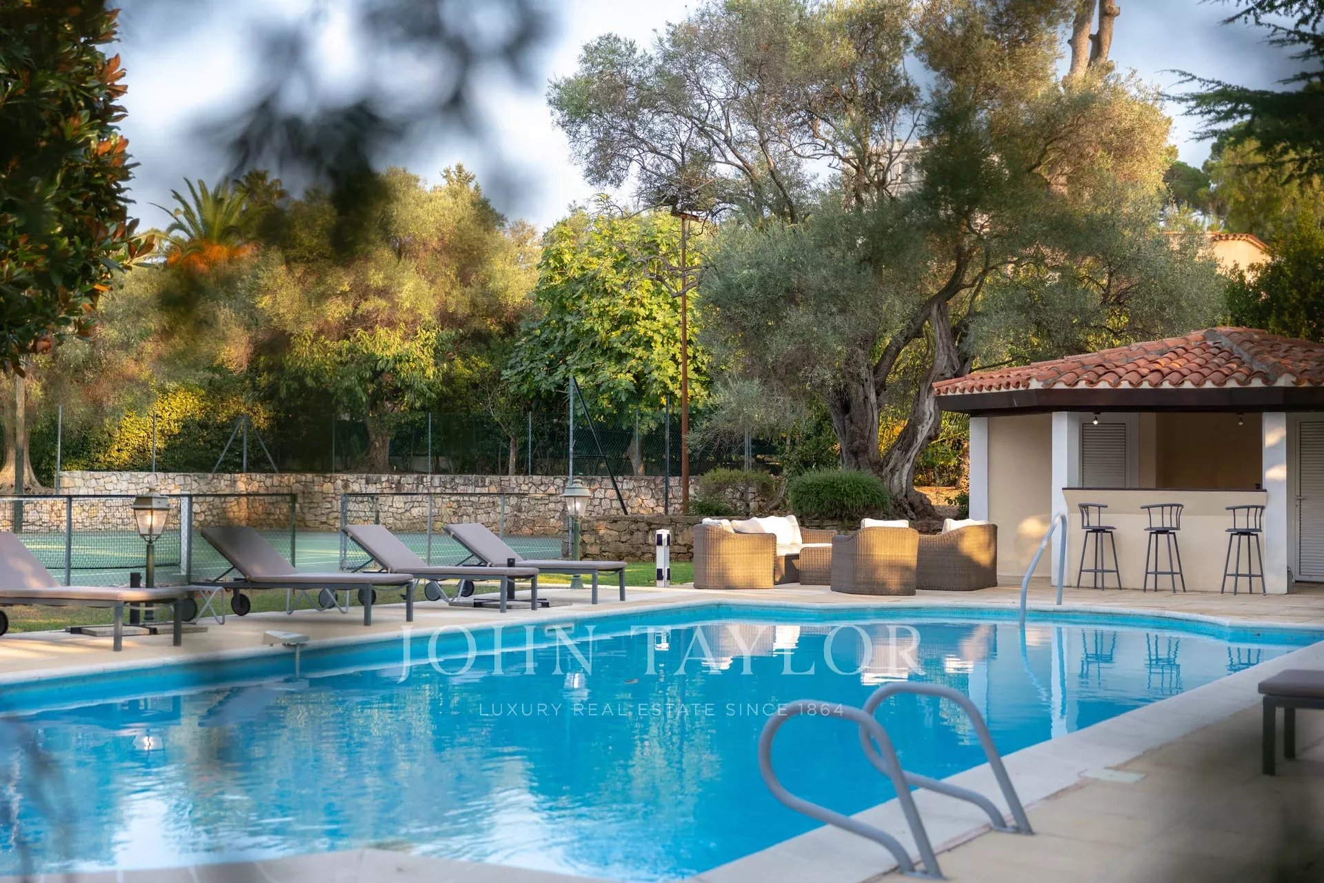 Splendide propriété de 3 niveaux située en bordure du Boulevard du Littoral. A quelques minutes à pied de l'hôtel Eden Roc, elle jouit d'une très belle vue sur la Baie de Juan Les Pins, les Iles de Lérins et l'Esterel. Entièrement rénovée et climatisée, elle est entourée d'un parc de 9 000 m2 bien dessiné, avec pelouse, fleurs et très beaux arbres.