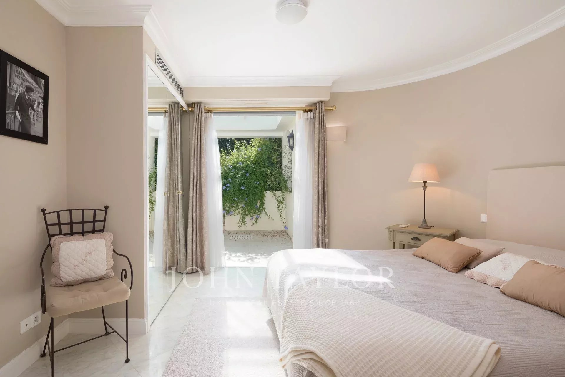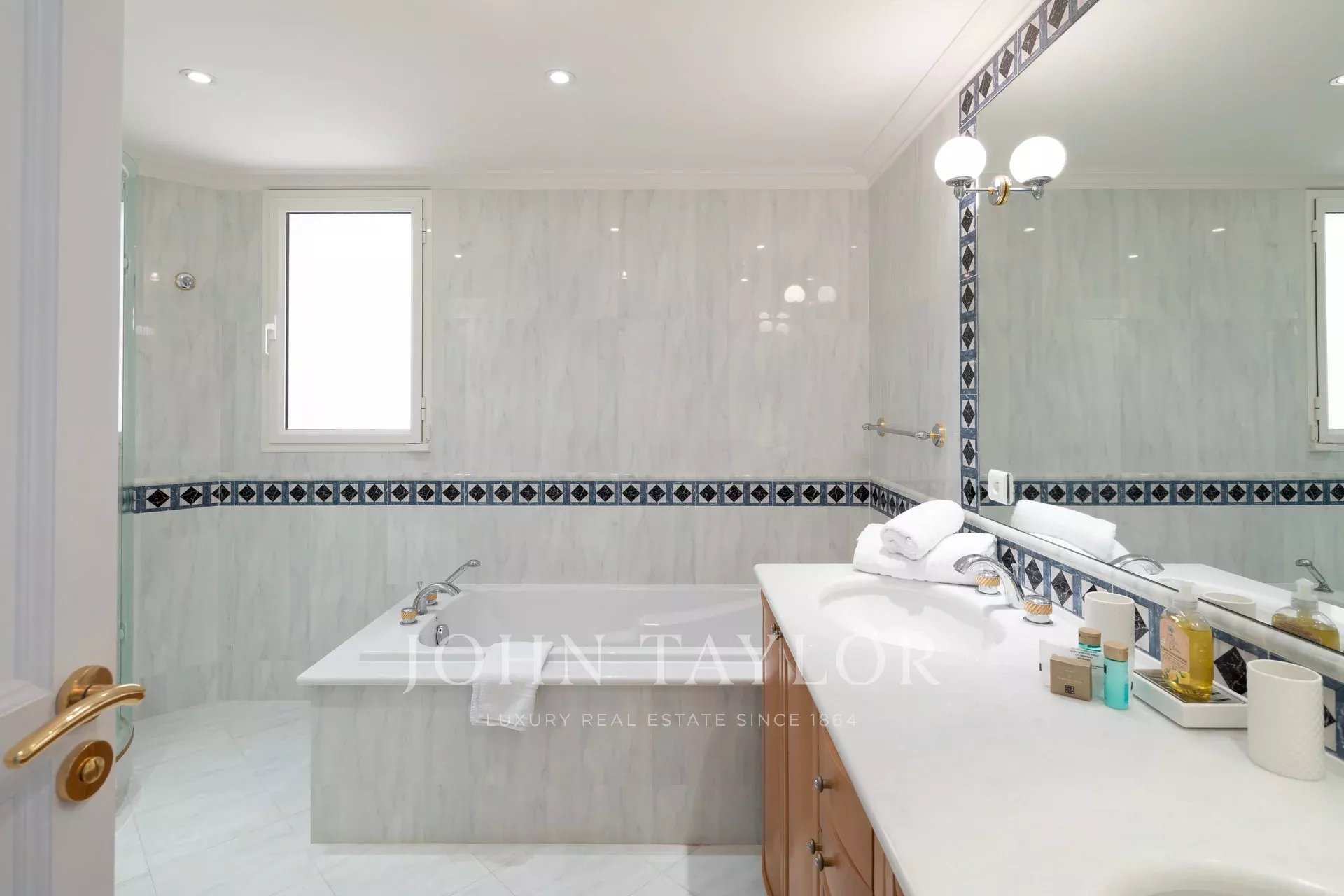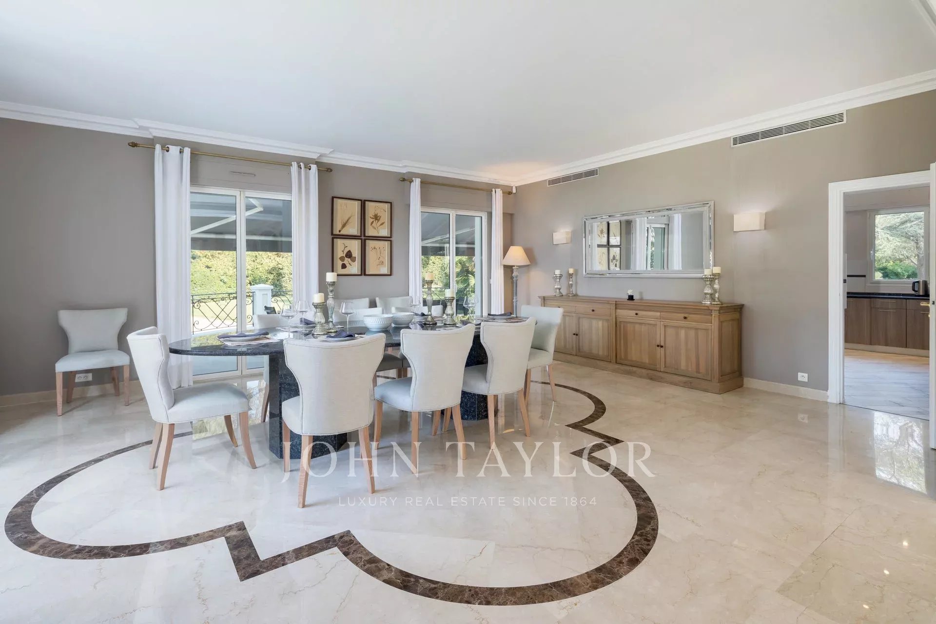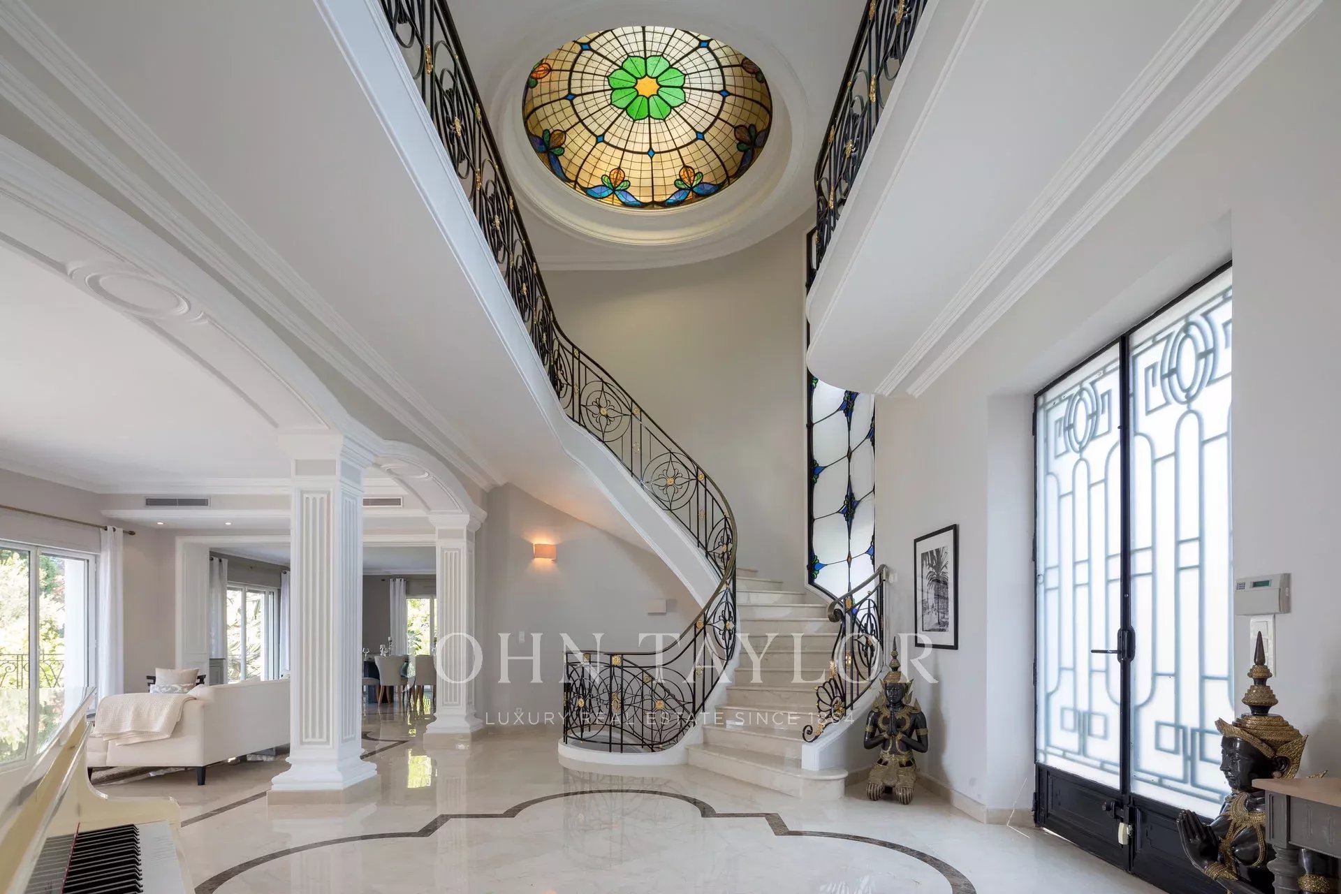 Splendide propriété de 3 niveaux située en bordure du Boulevard du Littoral. A quelques minutes à pied de l'hôtel Eden Roc, elle jouit d'une très belle vue sur la Baie de Juan Les Pins, les Iles de Lérins et l'Esterel. Entièrement rénovée et climatisée, elle est entourée d'un parc de 9 000 m2 bien dessiné, avec pelouse, fleurs et très beaux arbres.