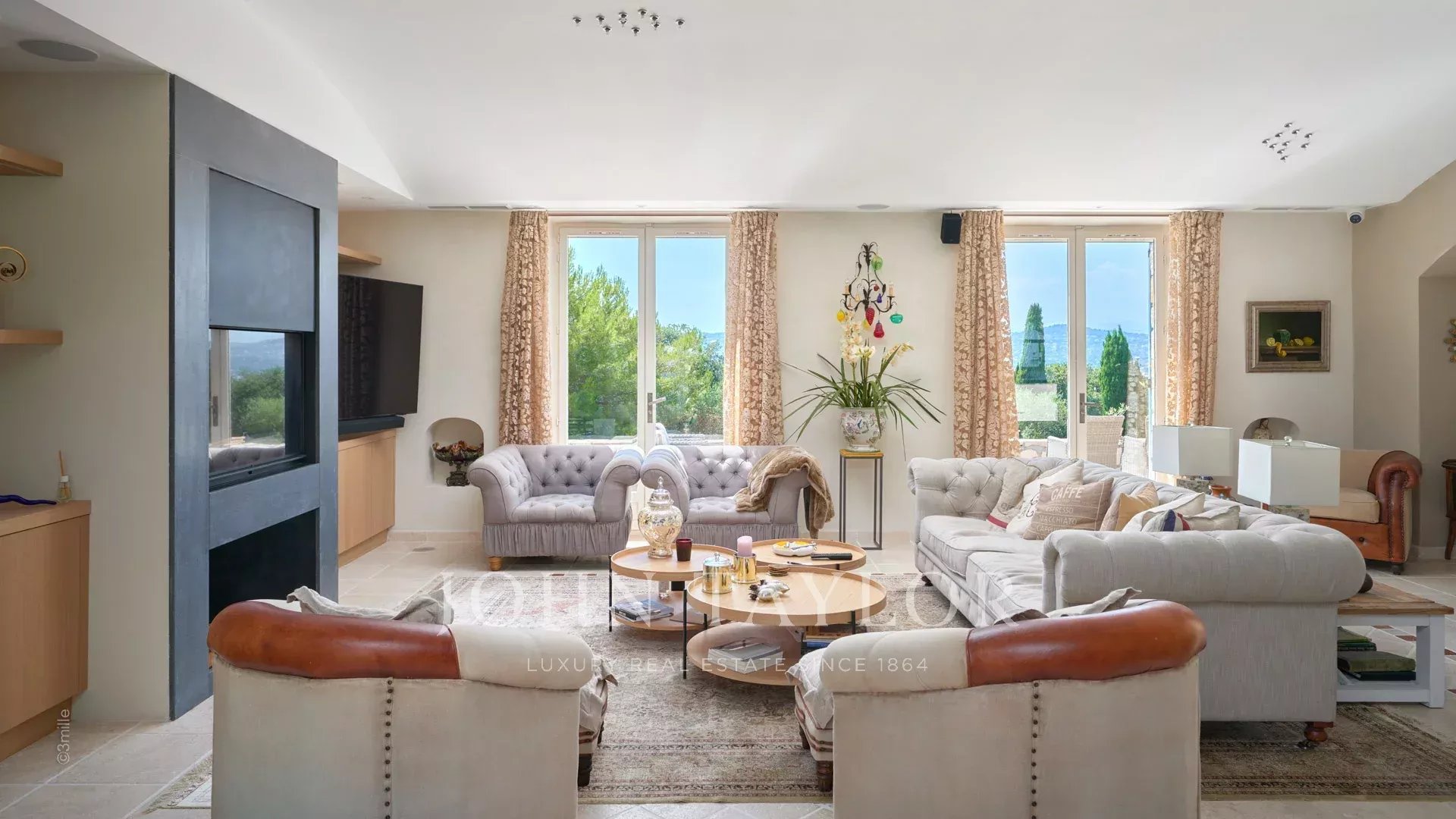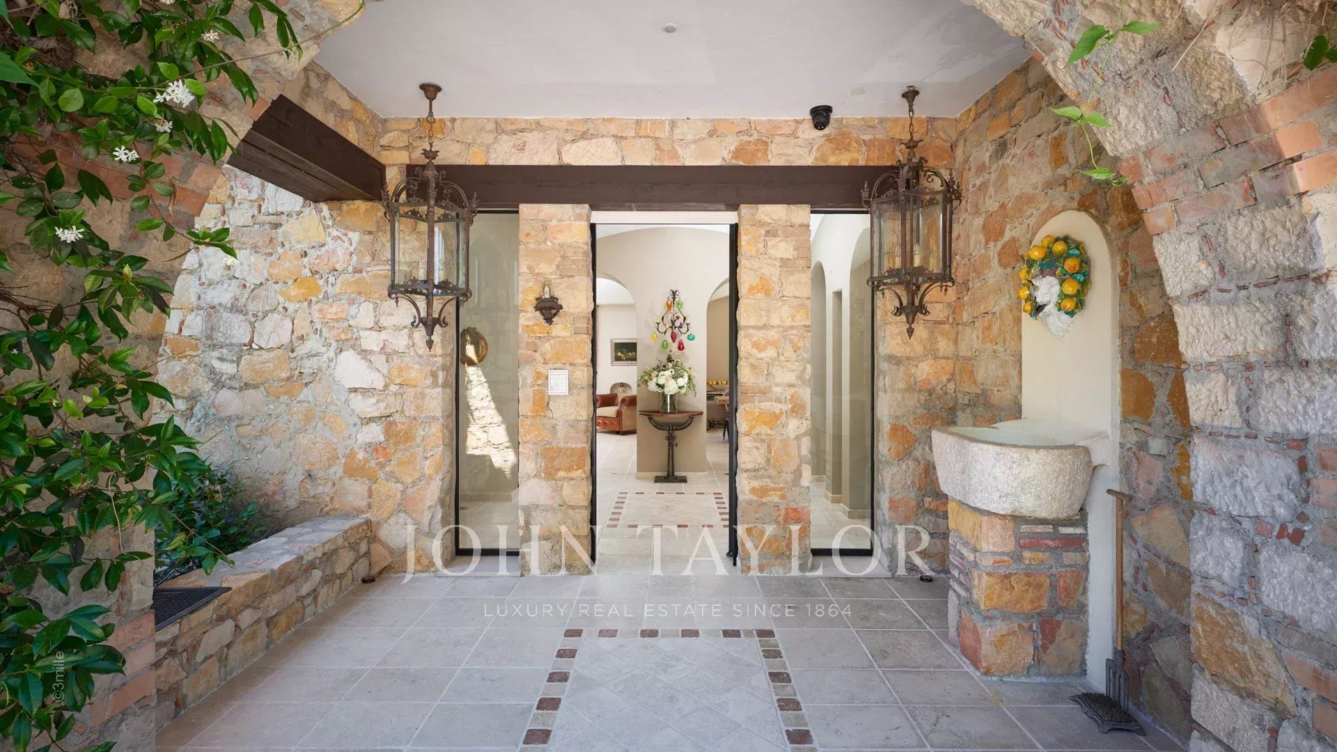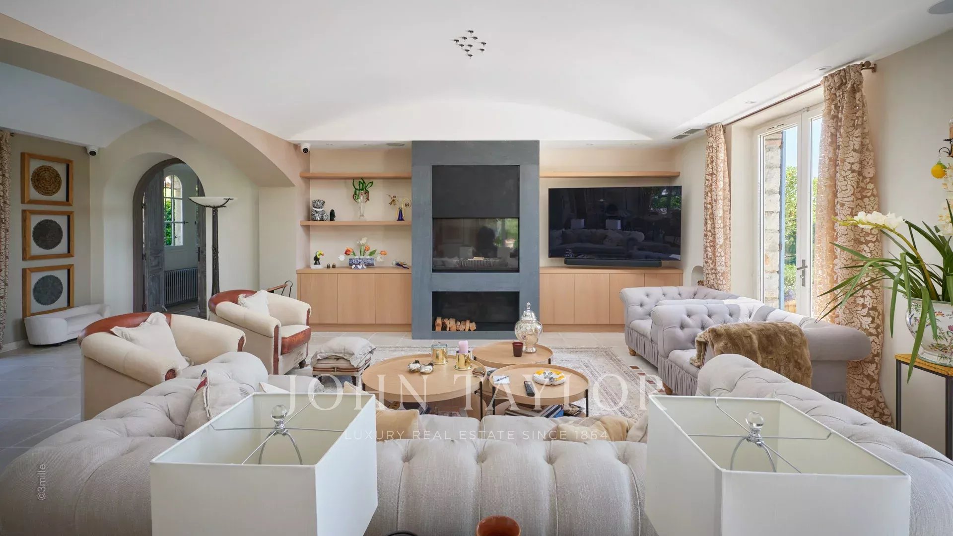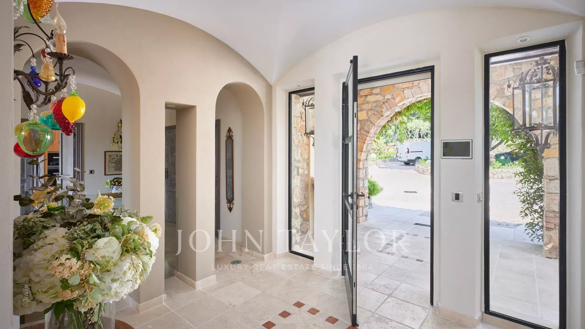 Entrée menant à la pièce de réception comprenant un grand salon et un espace salle à manger s’ouvrant par de grandes baies vitrées sur les terrasses