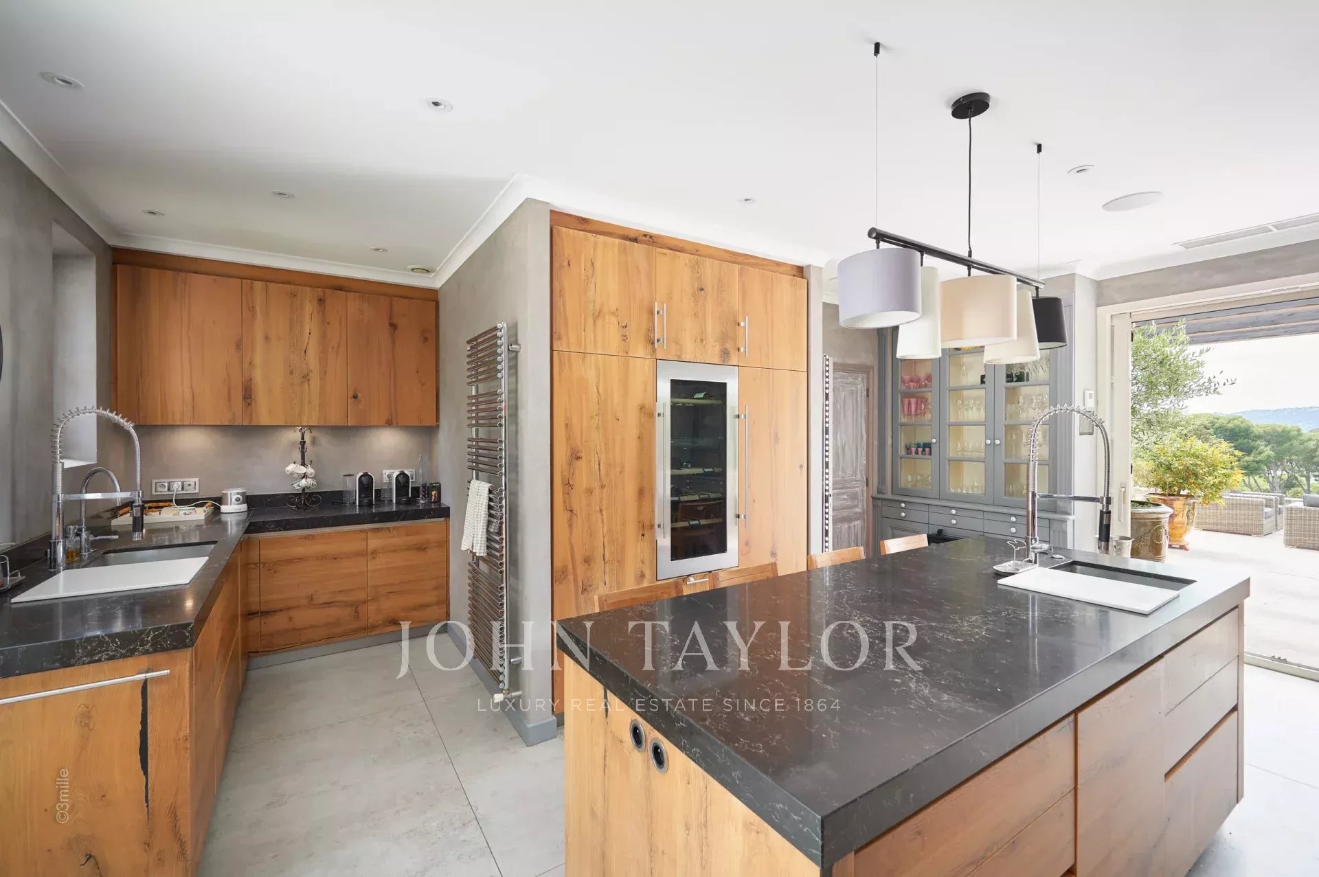 Cuisine professionnelle s’ouvrant sur terrasse