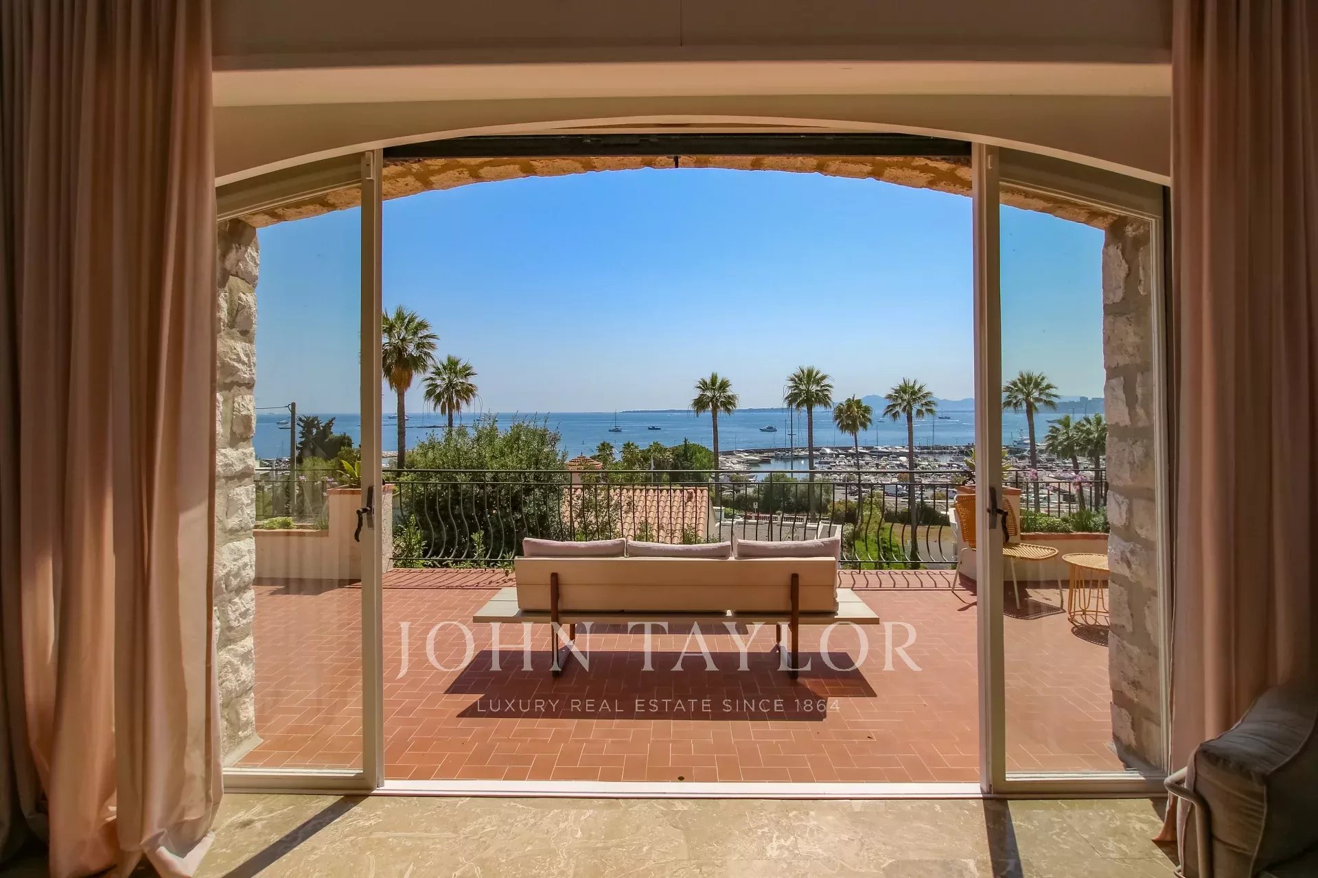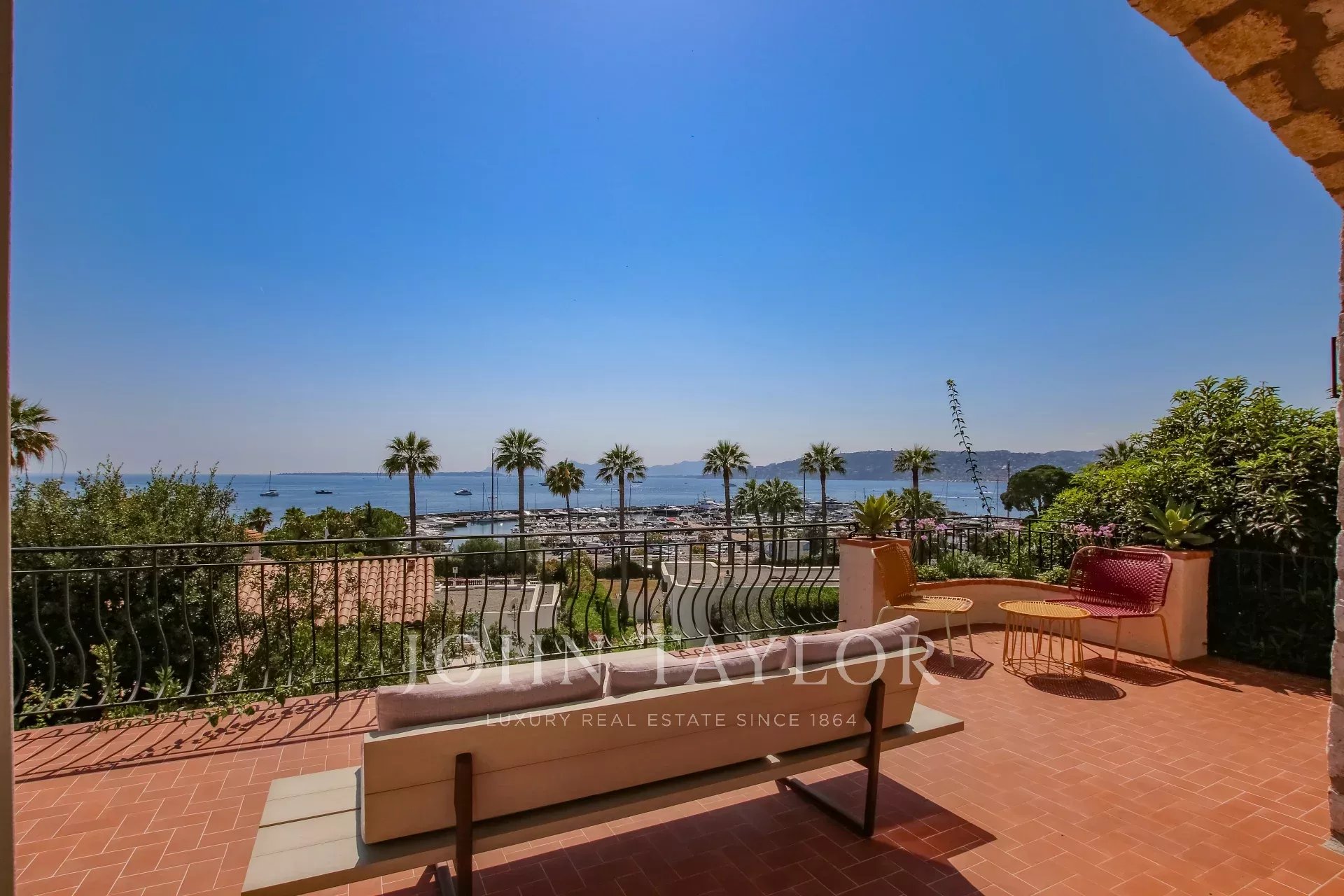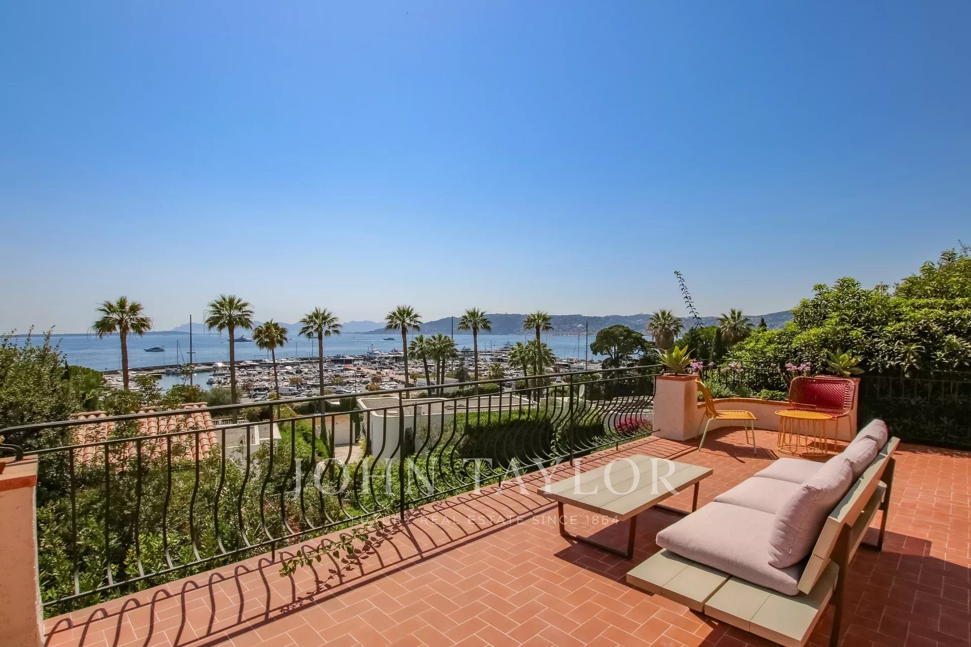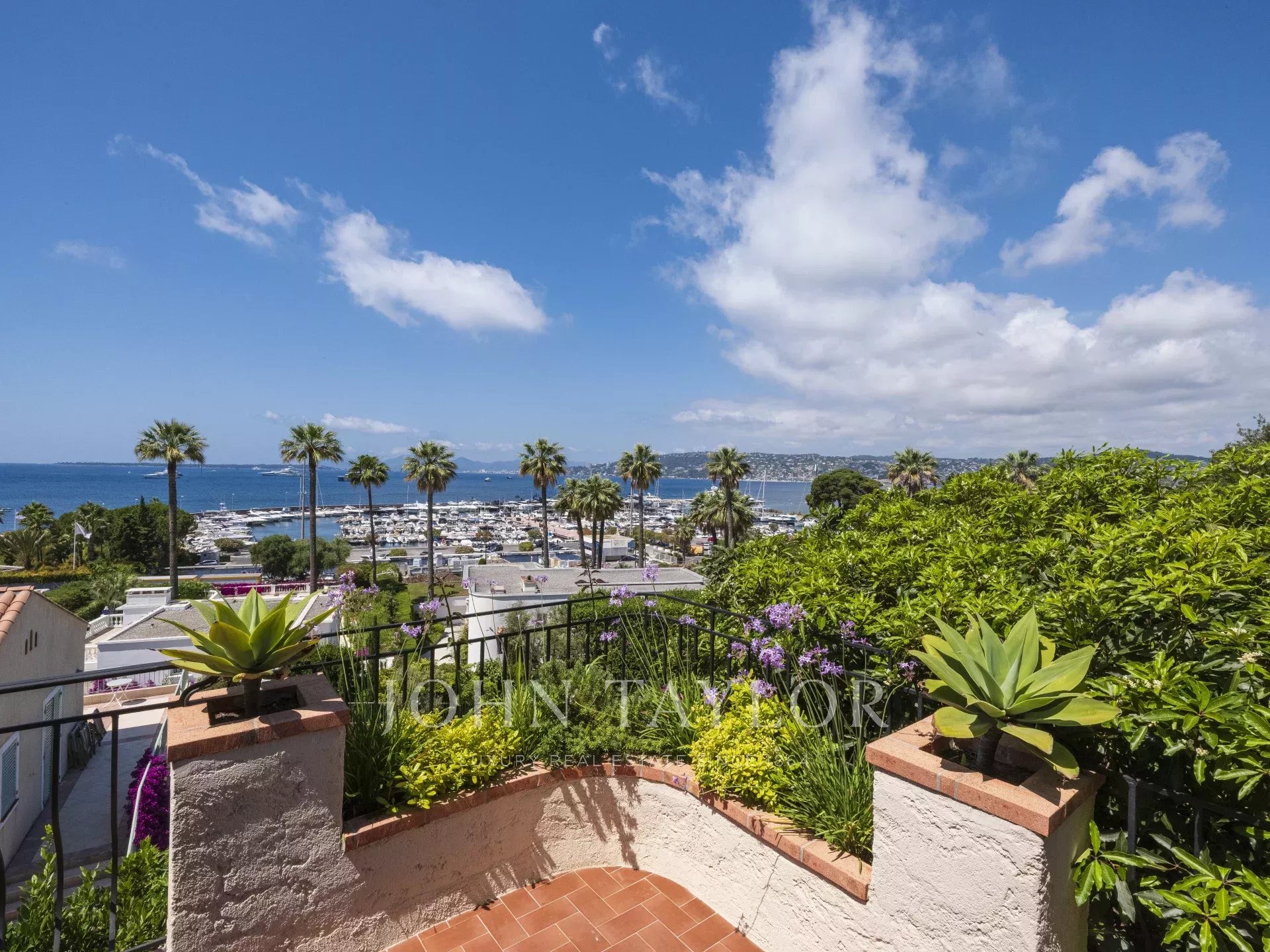 Vue mer panoramique sur la mer, la baie de Juan les Pins et les Iles de Lérins.