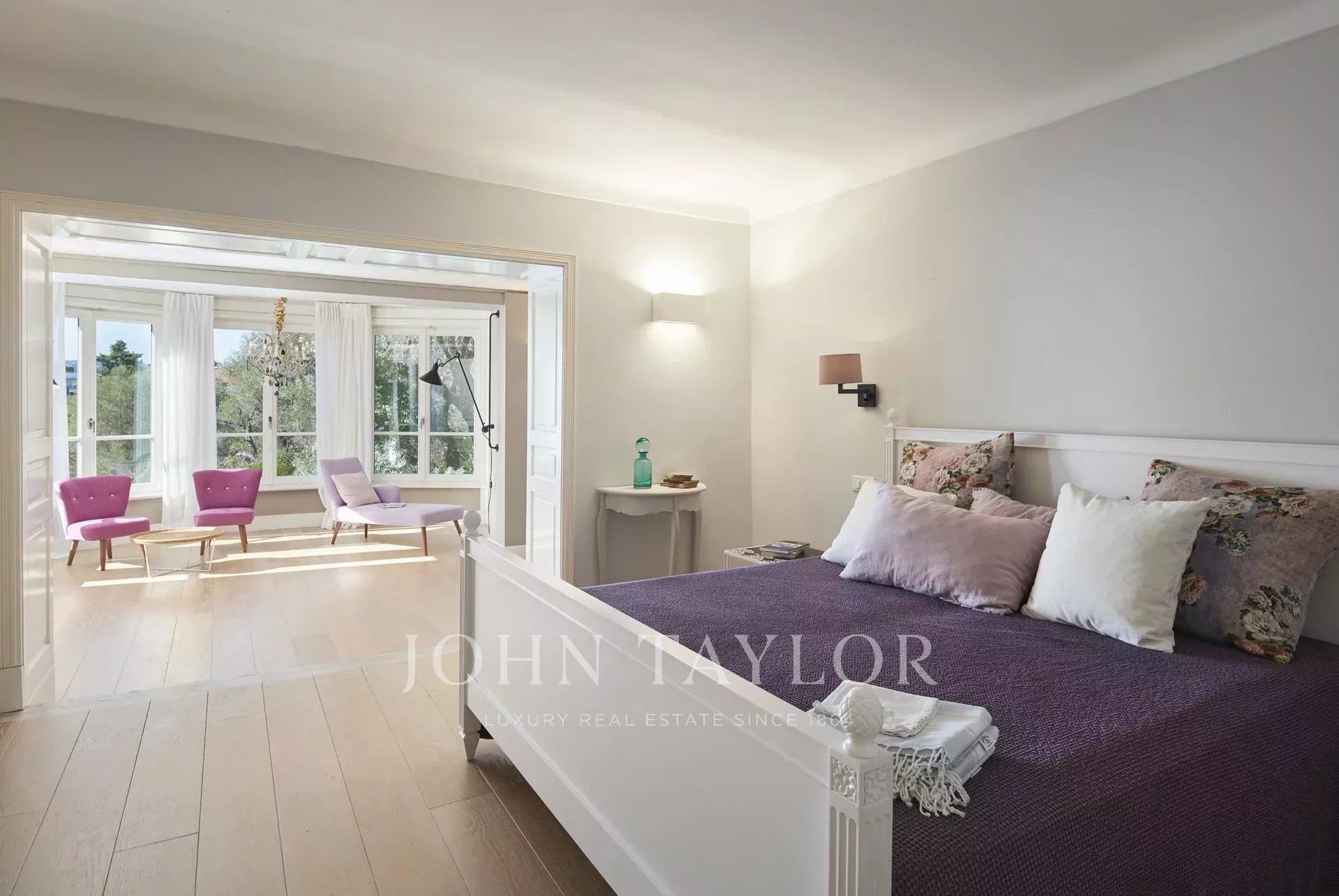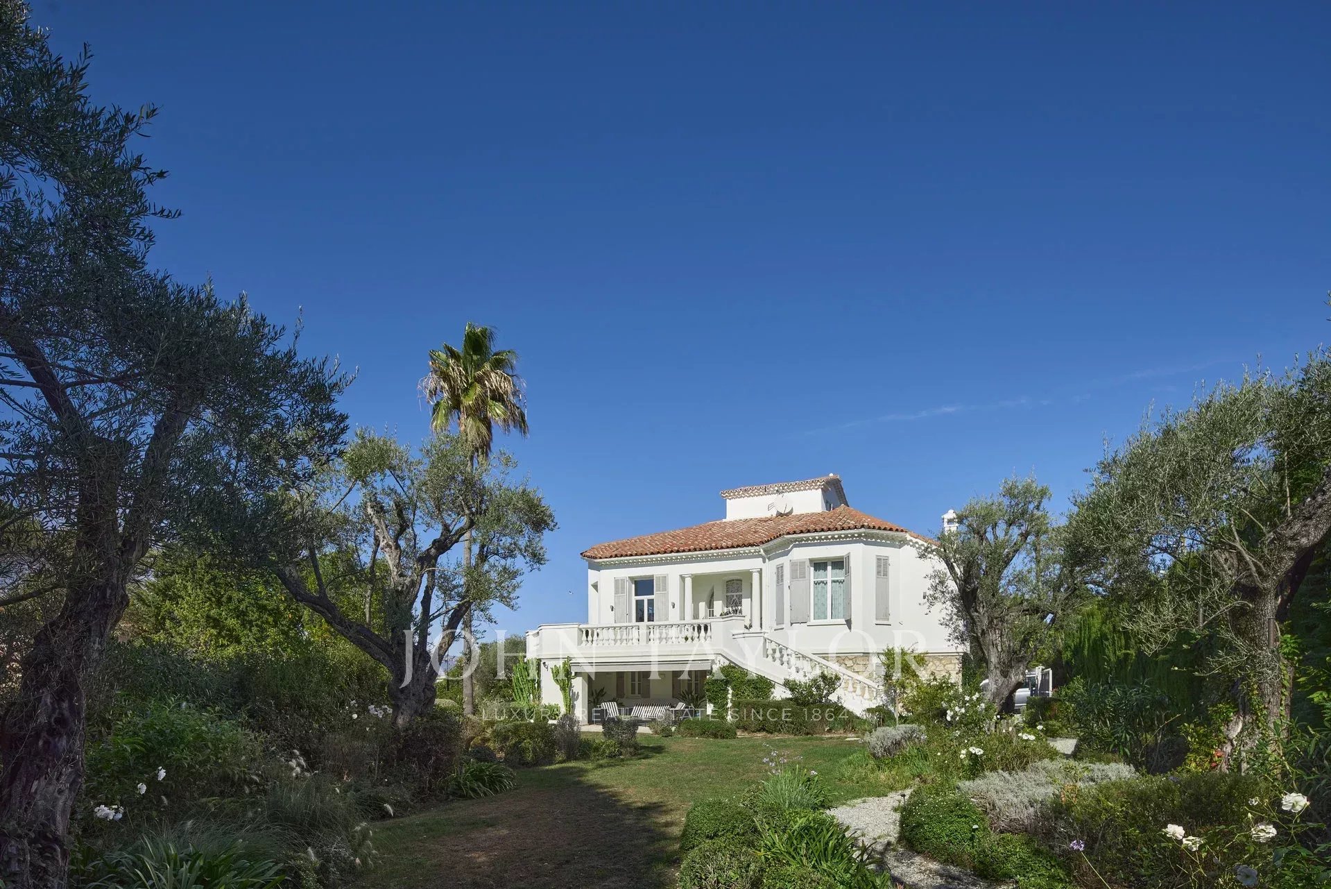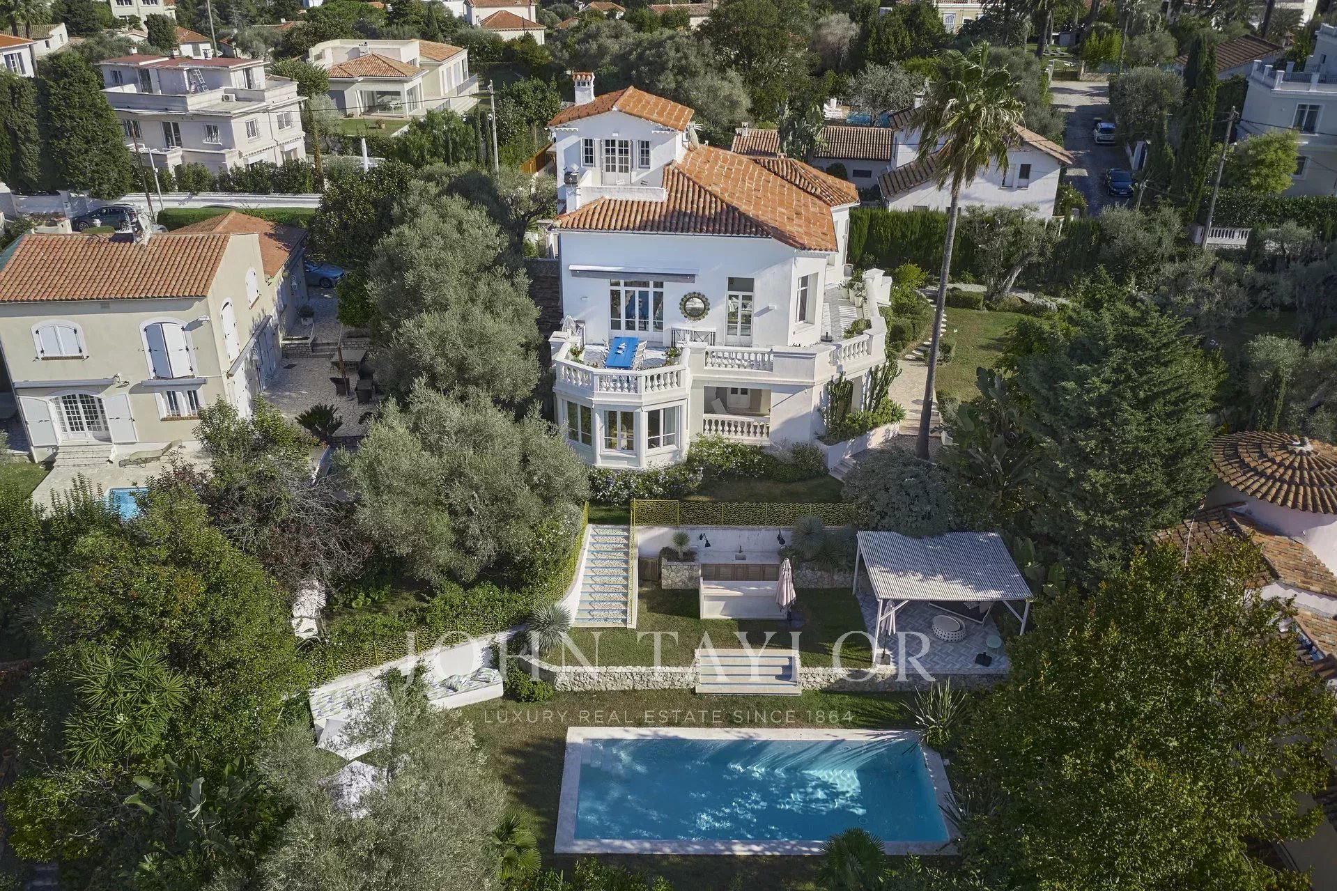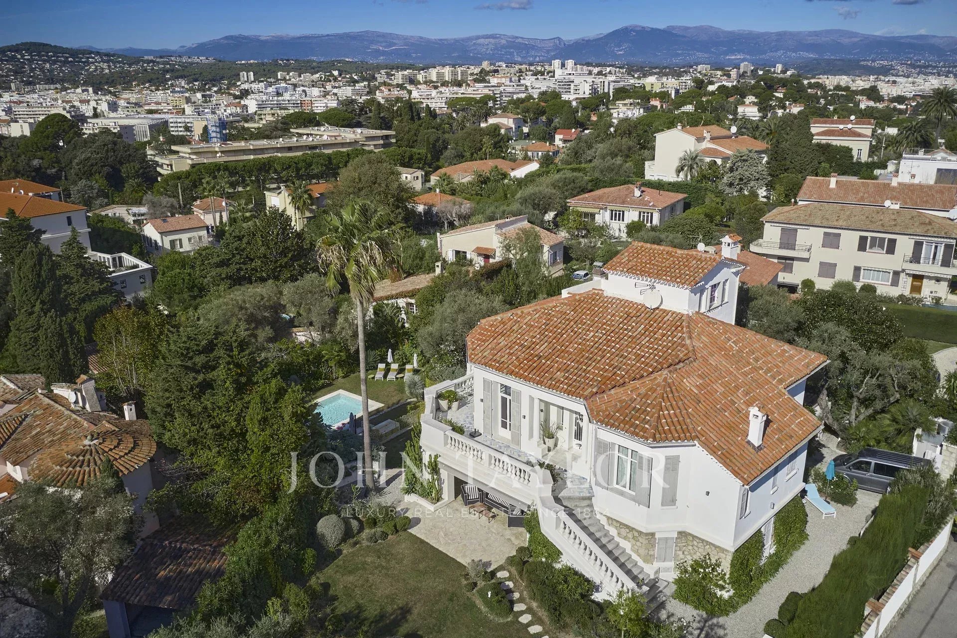 Datant de 1925, belle villa "Art Déco" récemment rénovée offrant de belles prestations dont la climatisation, de 350 m2 habitables au coeur d'un terrain de 1 600 m2, située à pied de Juan-les-Pins et d'Antibes. Quartier calme car au fond d'une impasse.