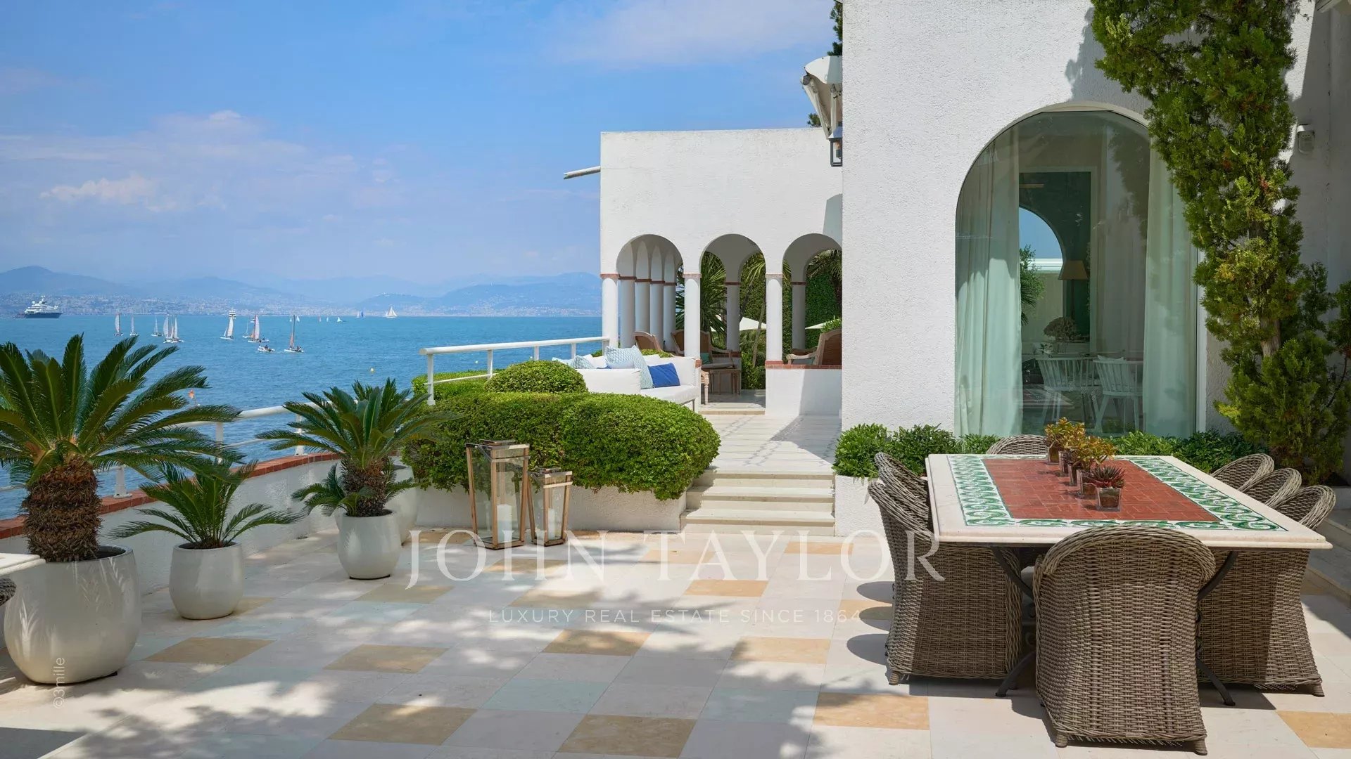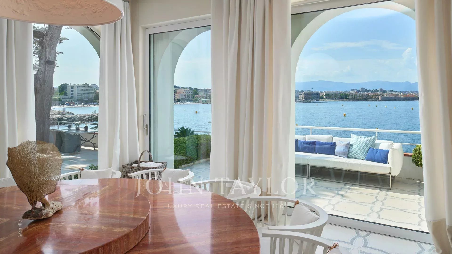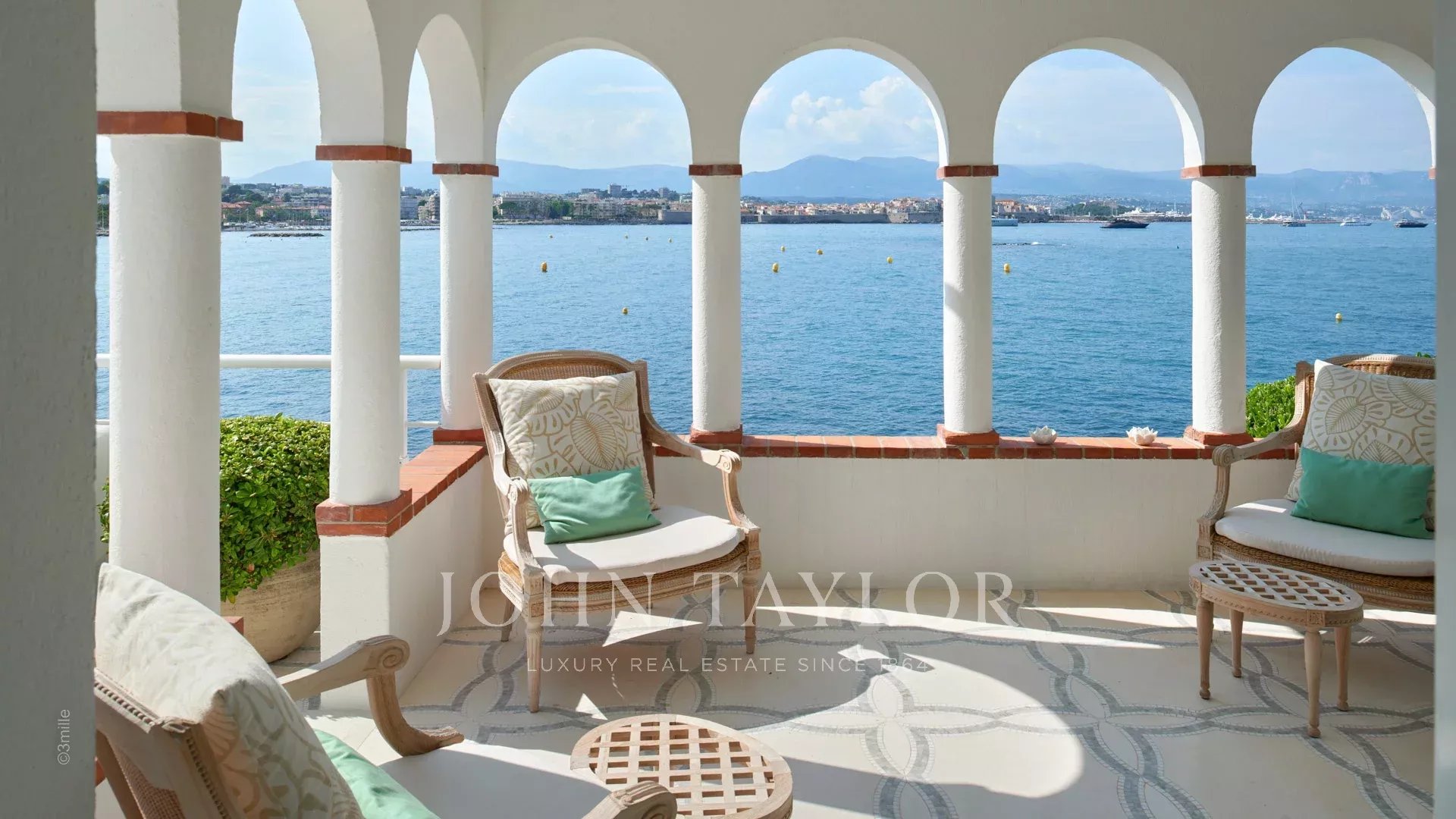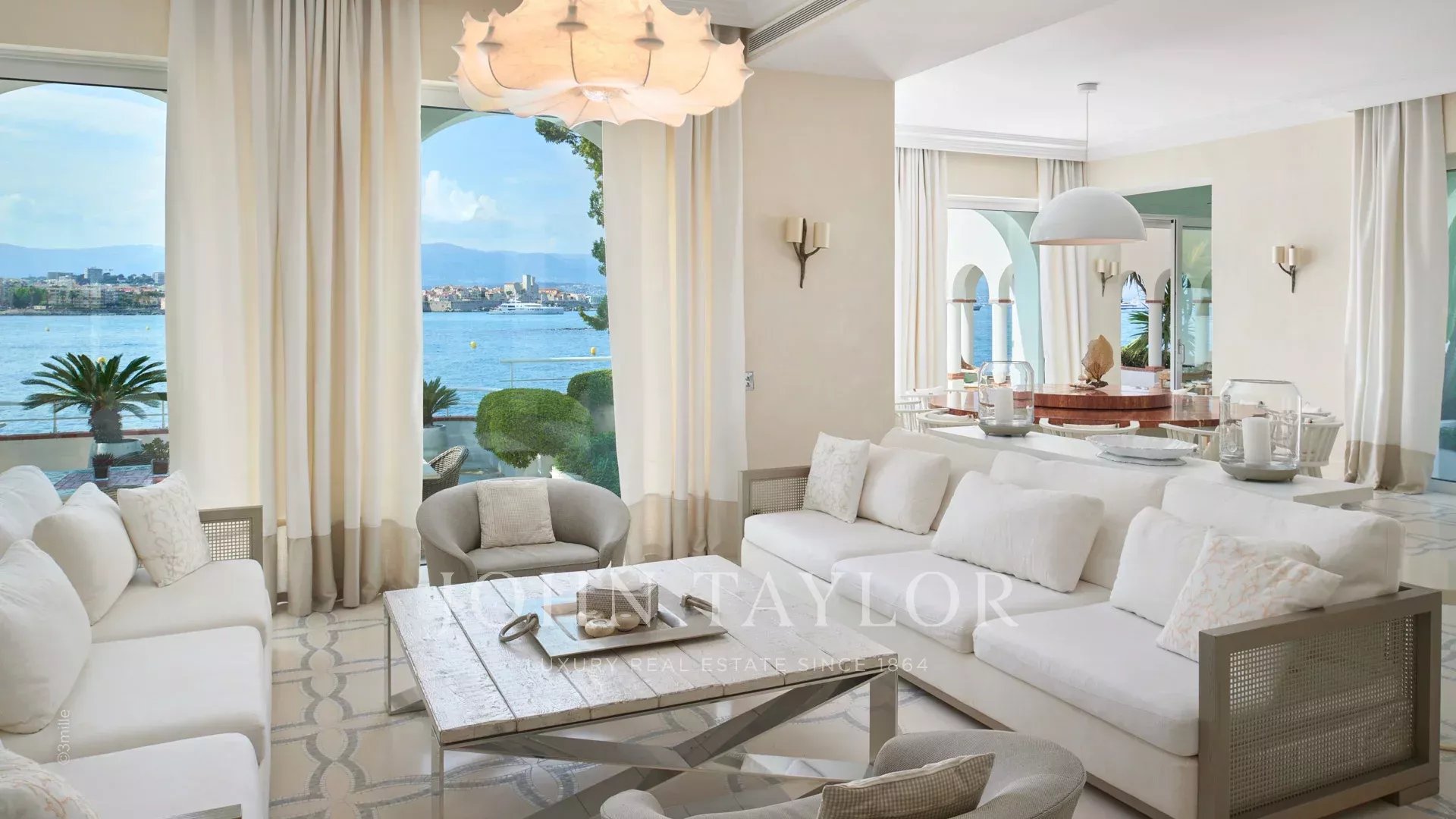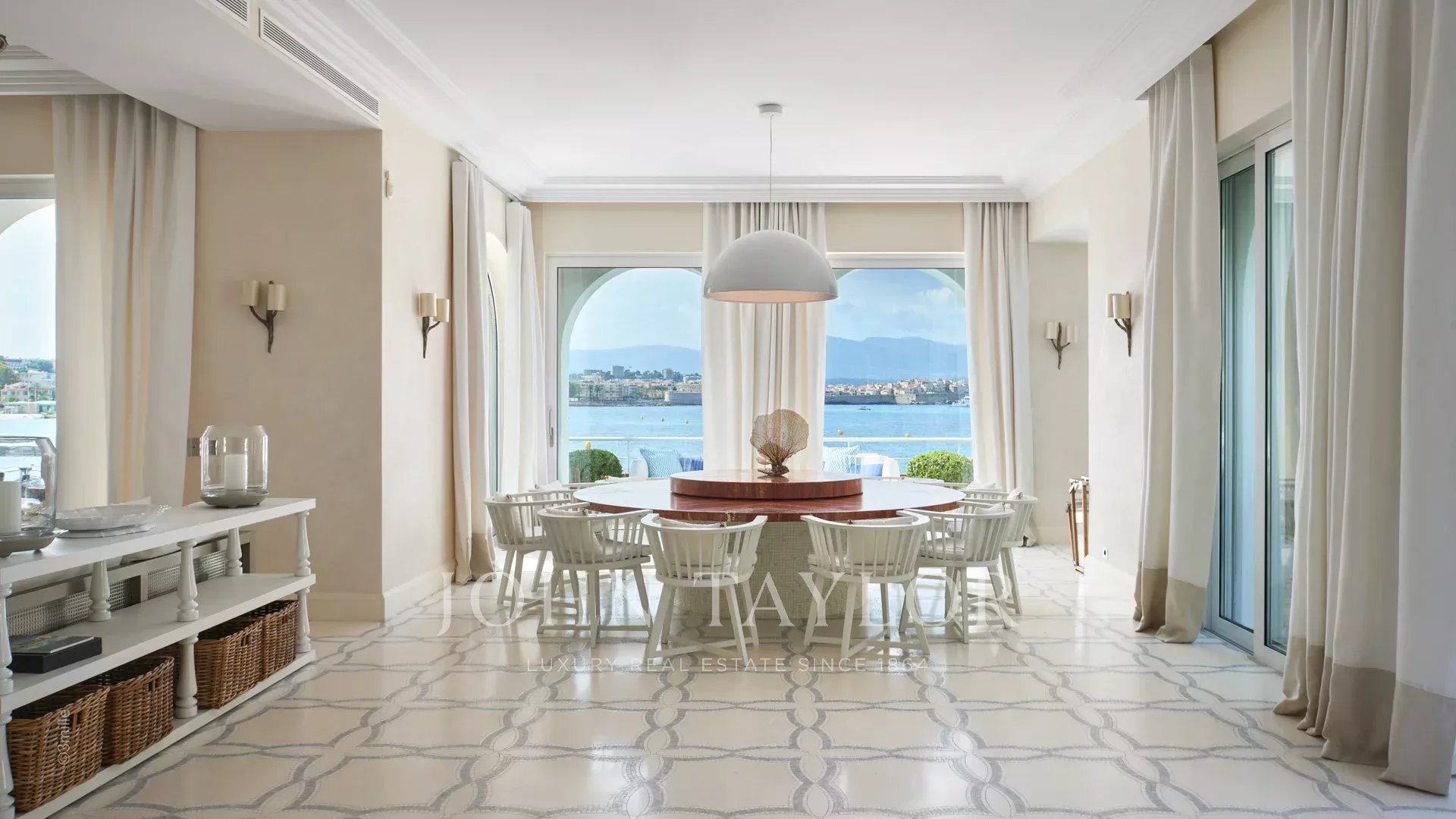 L'entrée vous guide vers une vaste réception ouvrant sur une magnifique terrasse avec vue sur la mer et le vieil Antibes, comprenant un salon et une salle à manger pouvant accueillir 12 personnes.