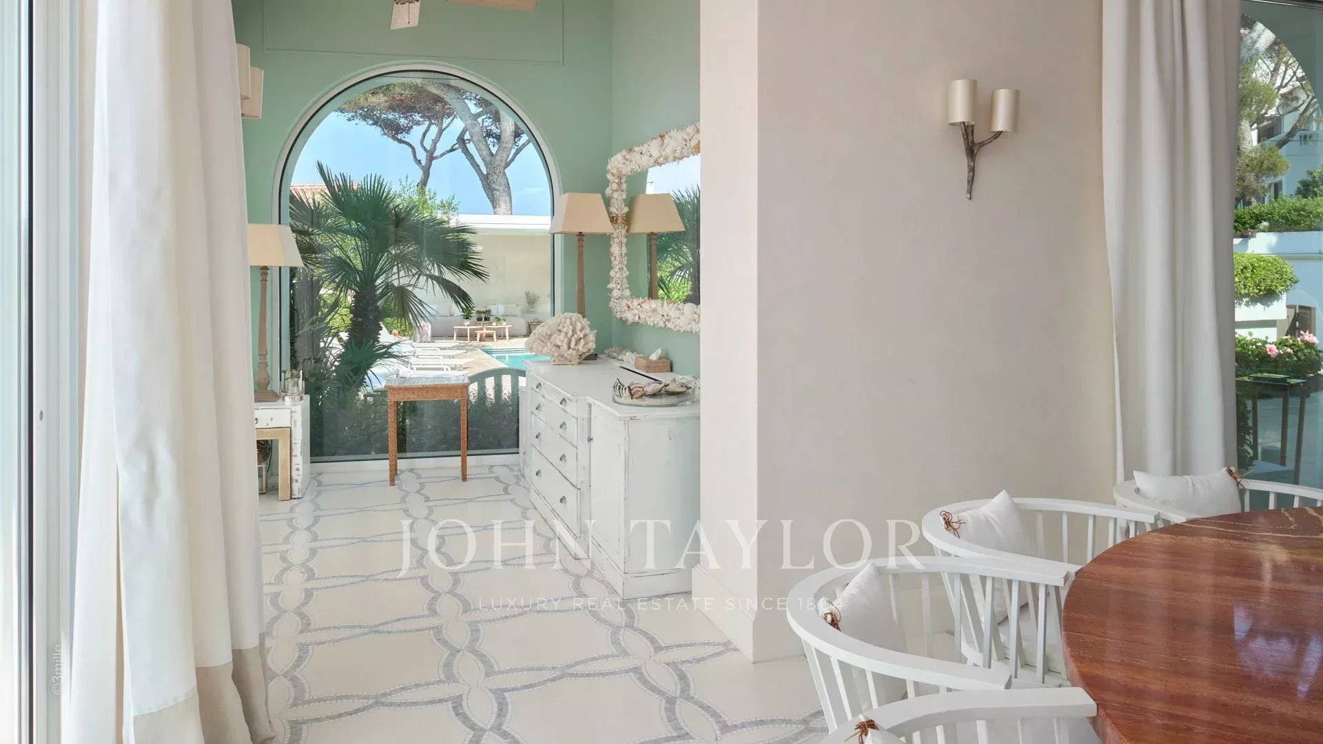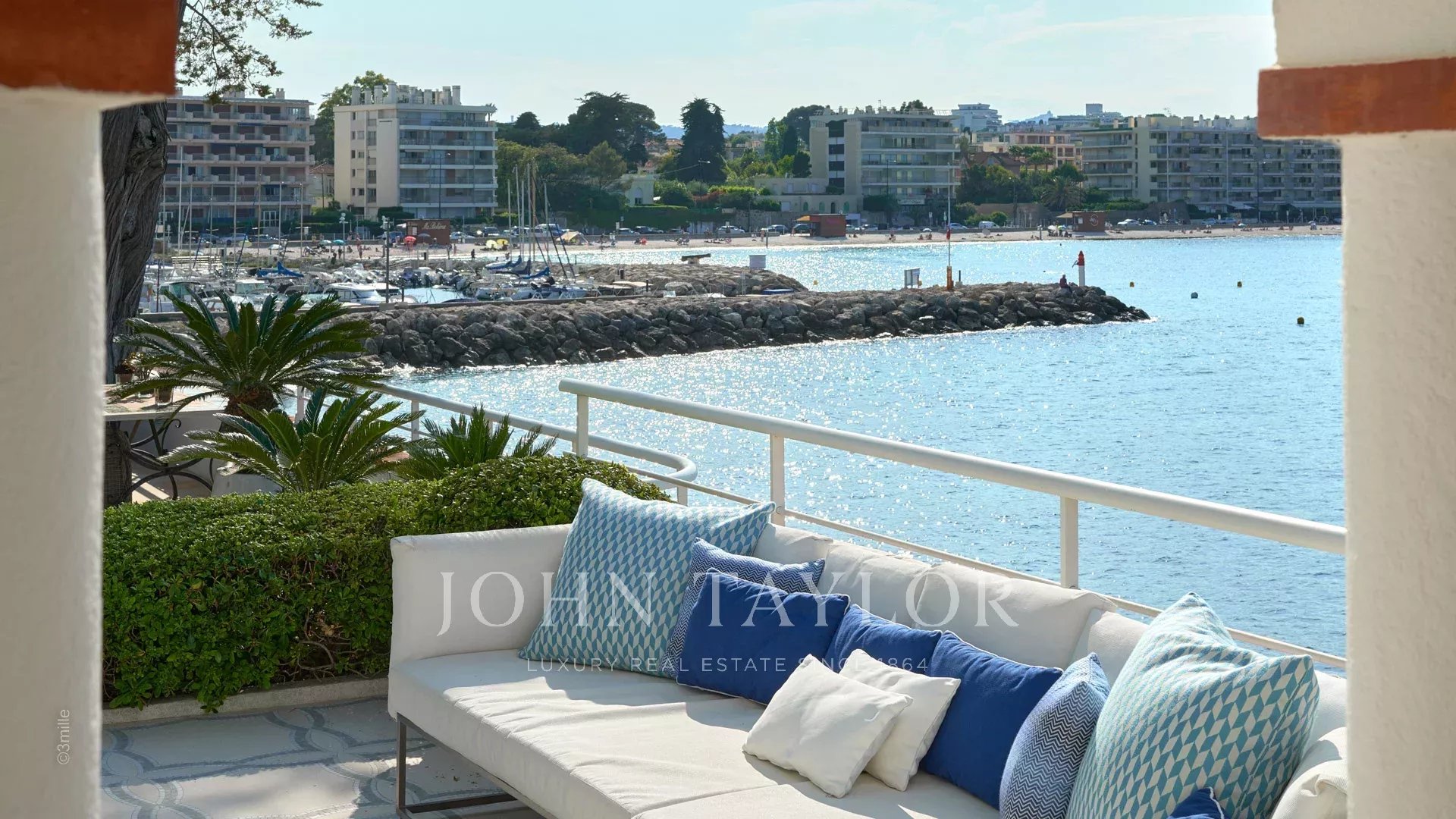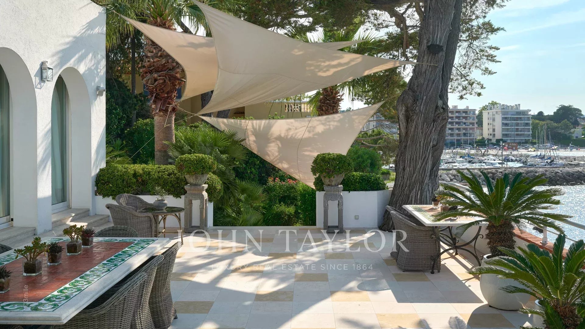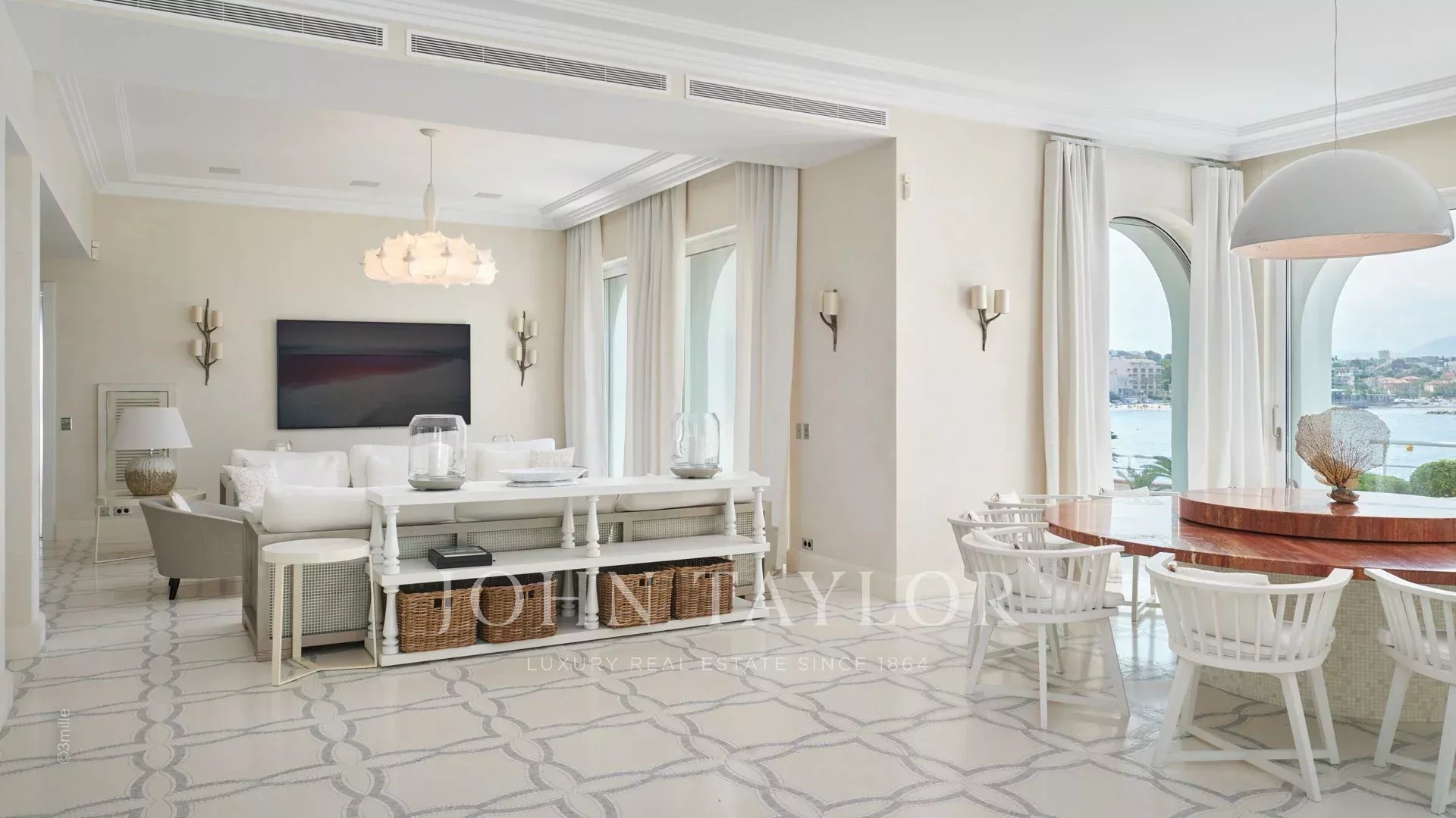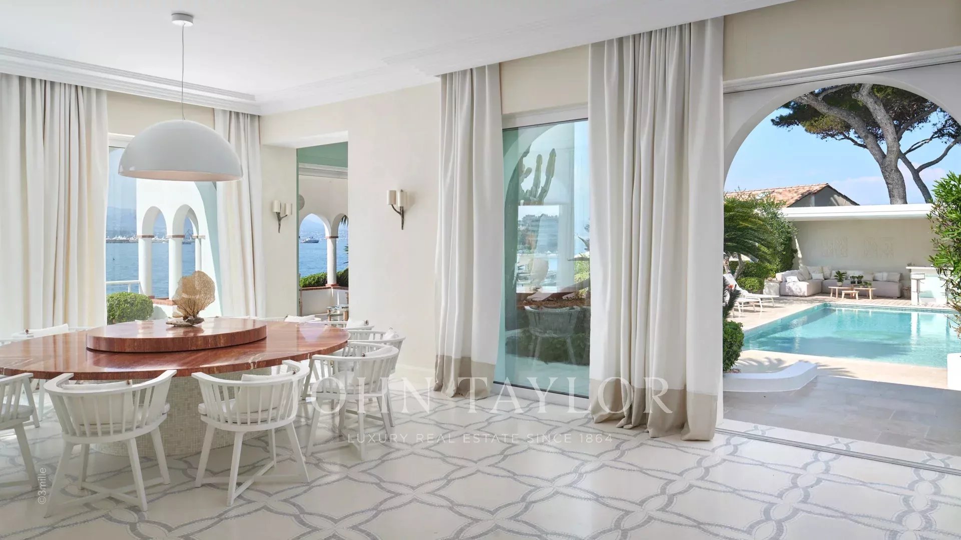 L'entrée vous guide vers une vaste réception ouvrant sur une magnifique terrasse avec vue sur la mer et le vieil Antibes, comprenant un salon et une salle à manger pouvant accueillir 12 personnes.