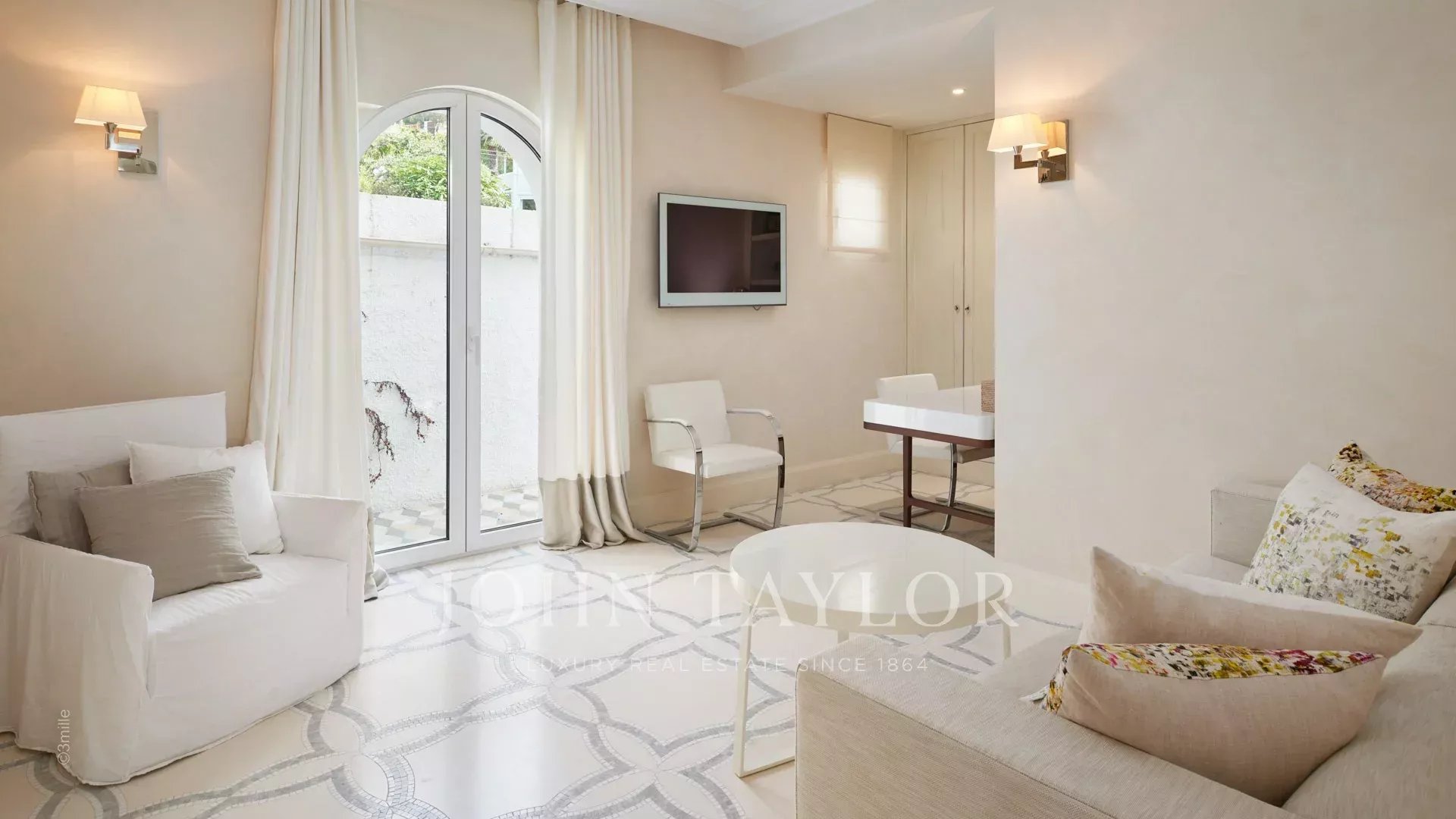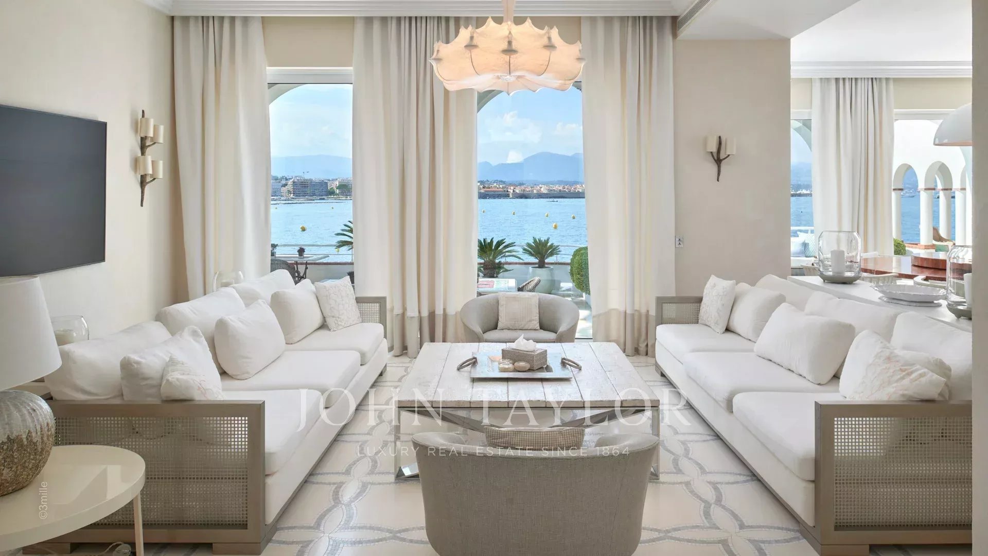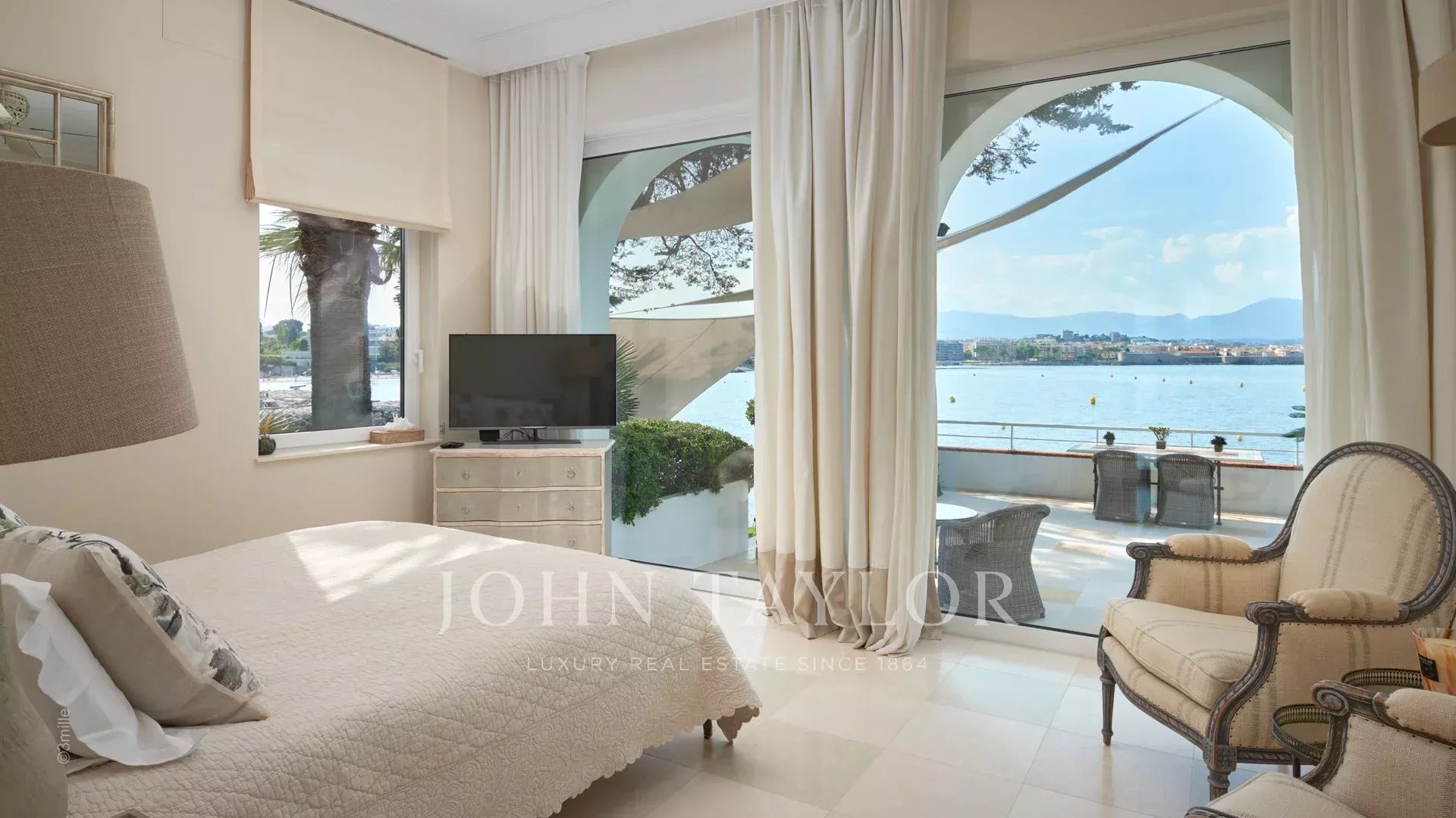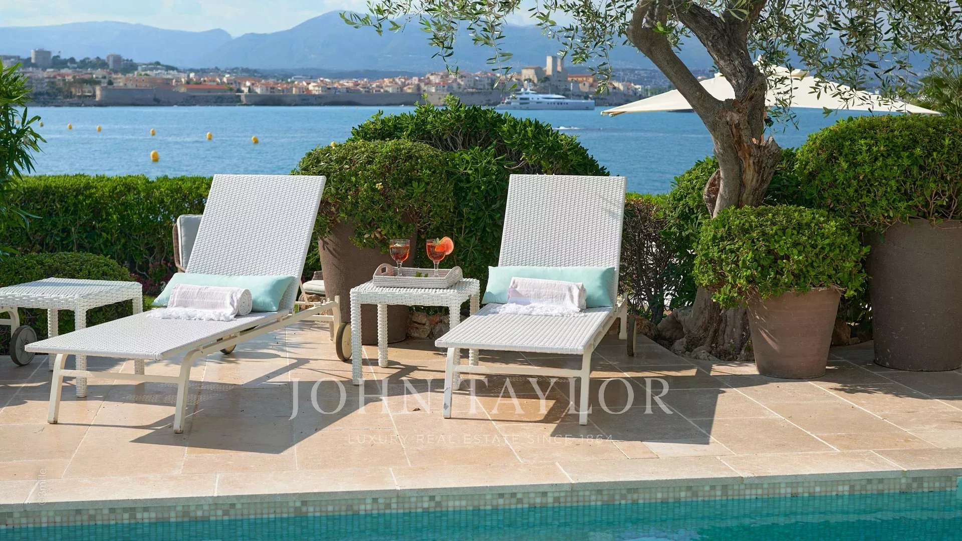 L'entrée vous guide vers une vaste réception ouvrant sur une magnifique terrasse avec vue sur la mer et le vieil Antibes, comprenant un salon et une salle à manger pouvant accueillir 12 personnes.