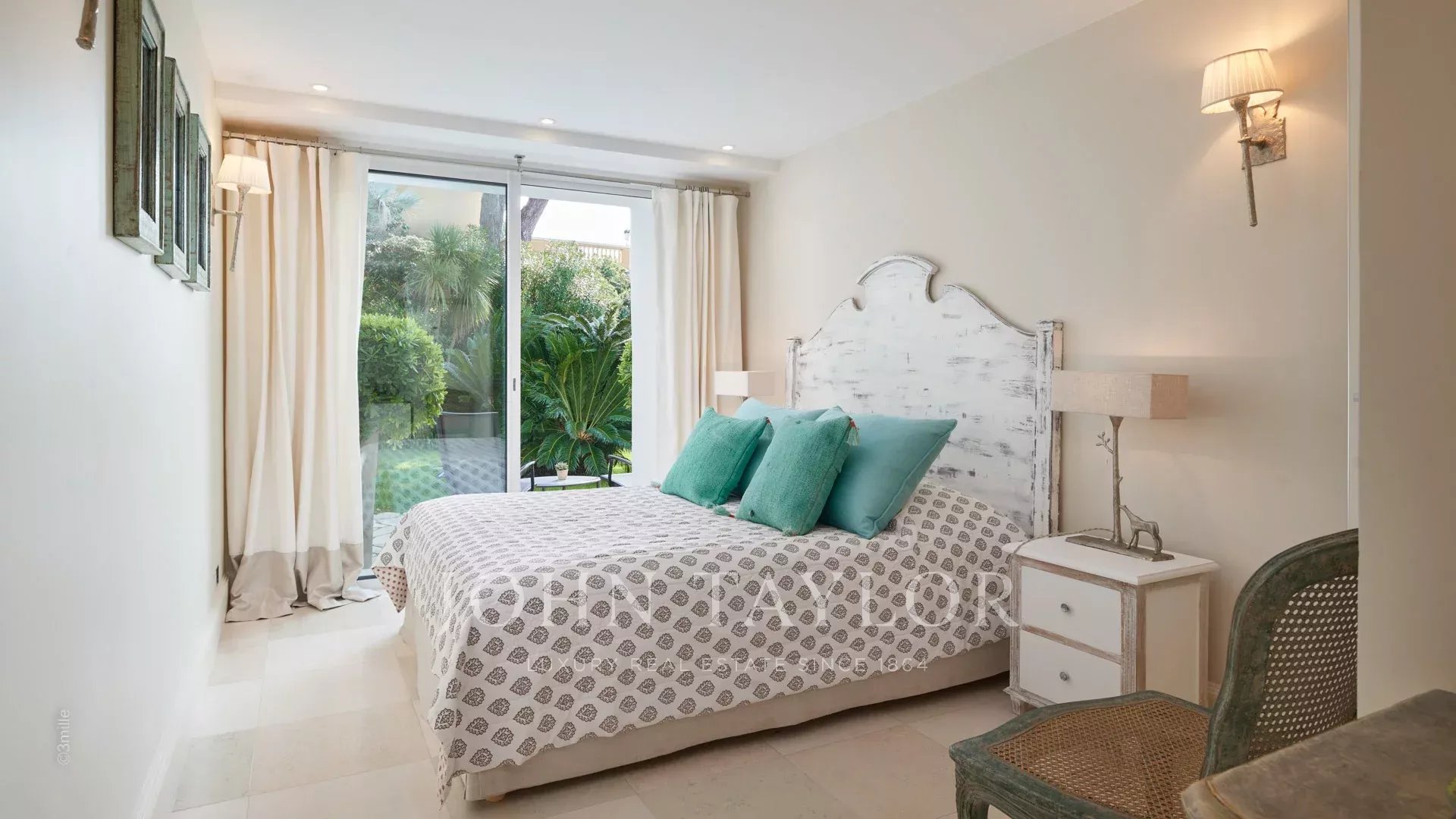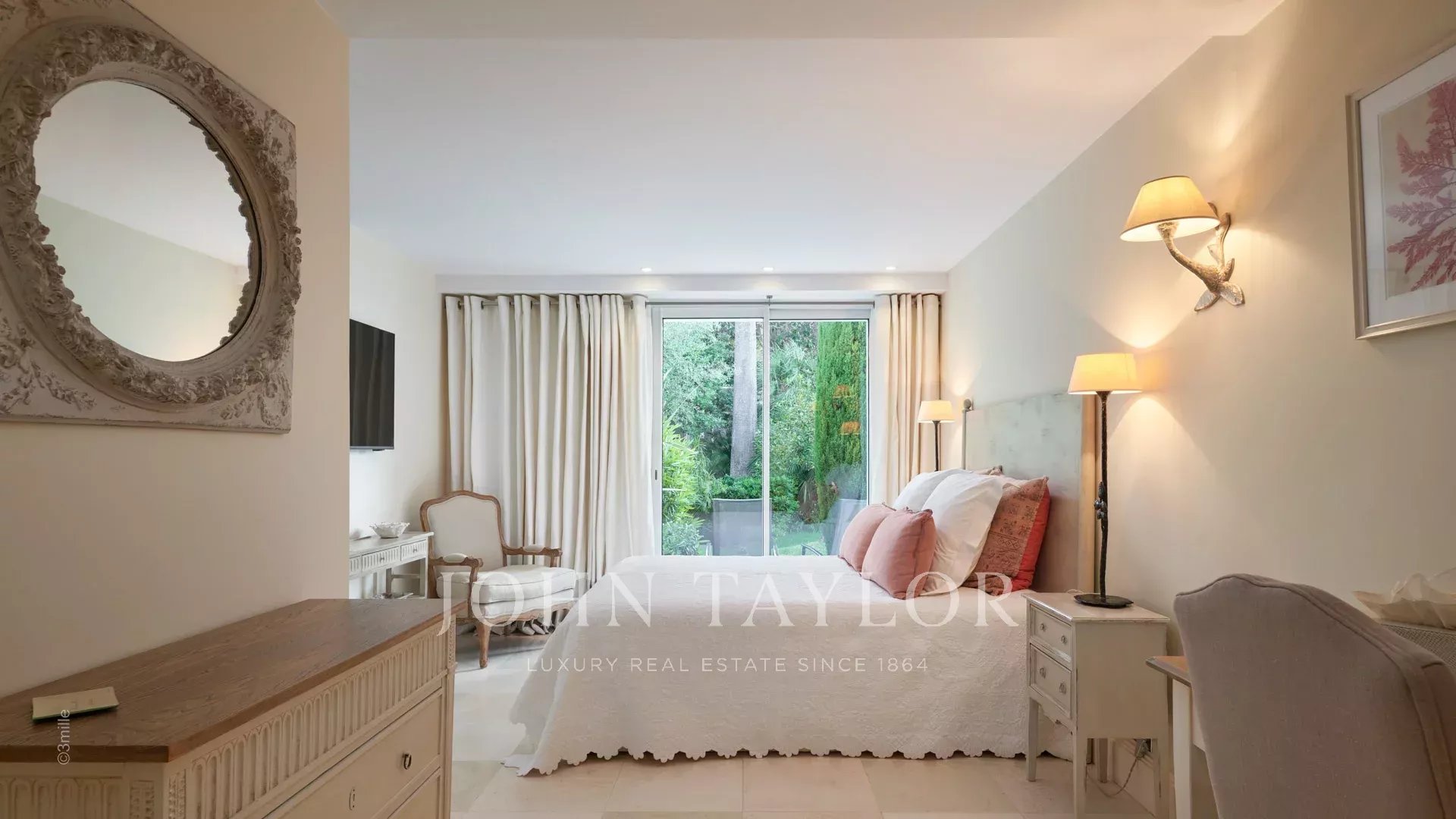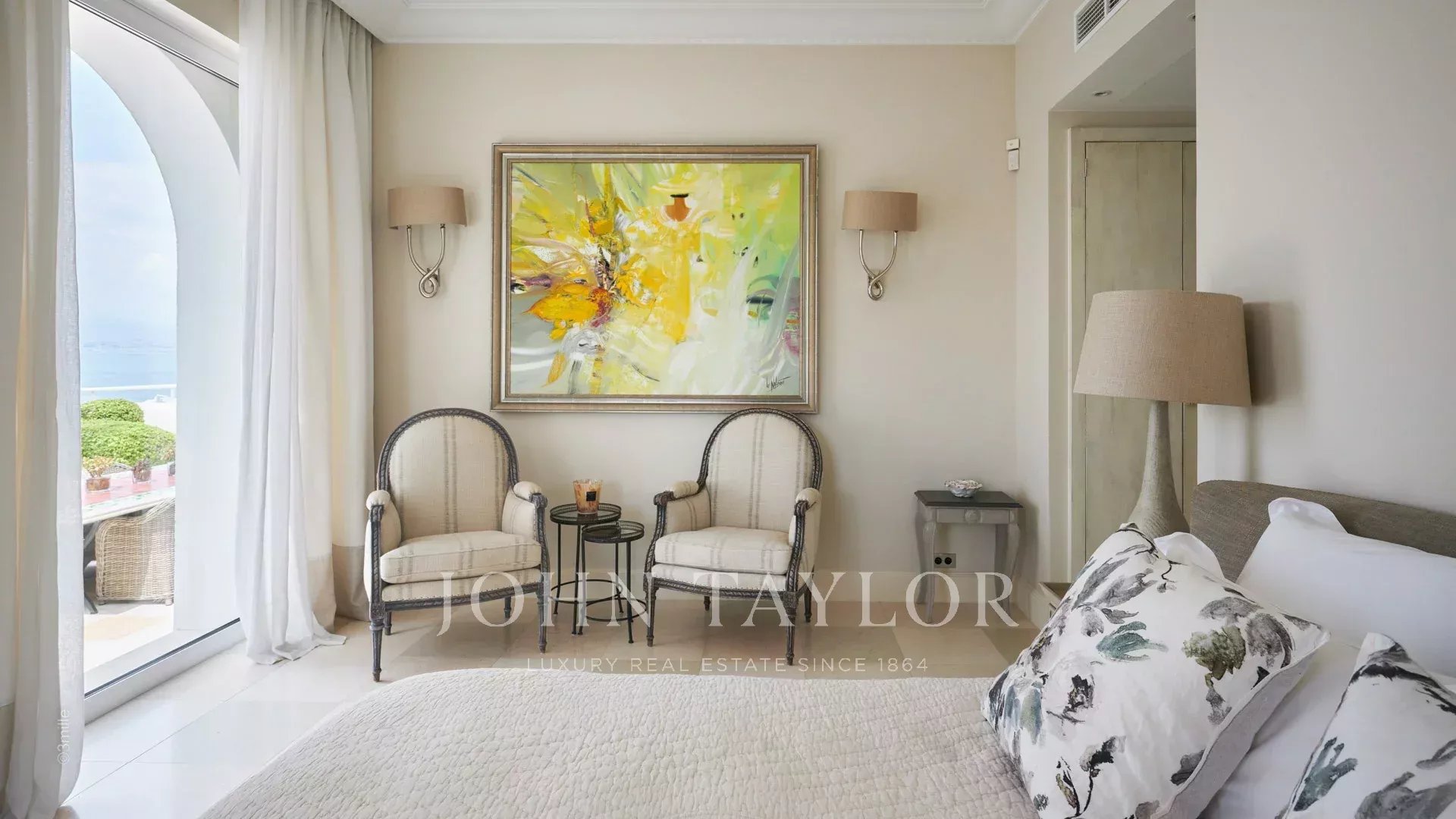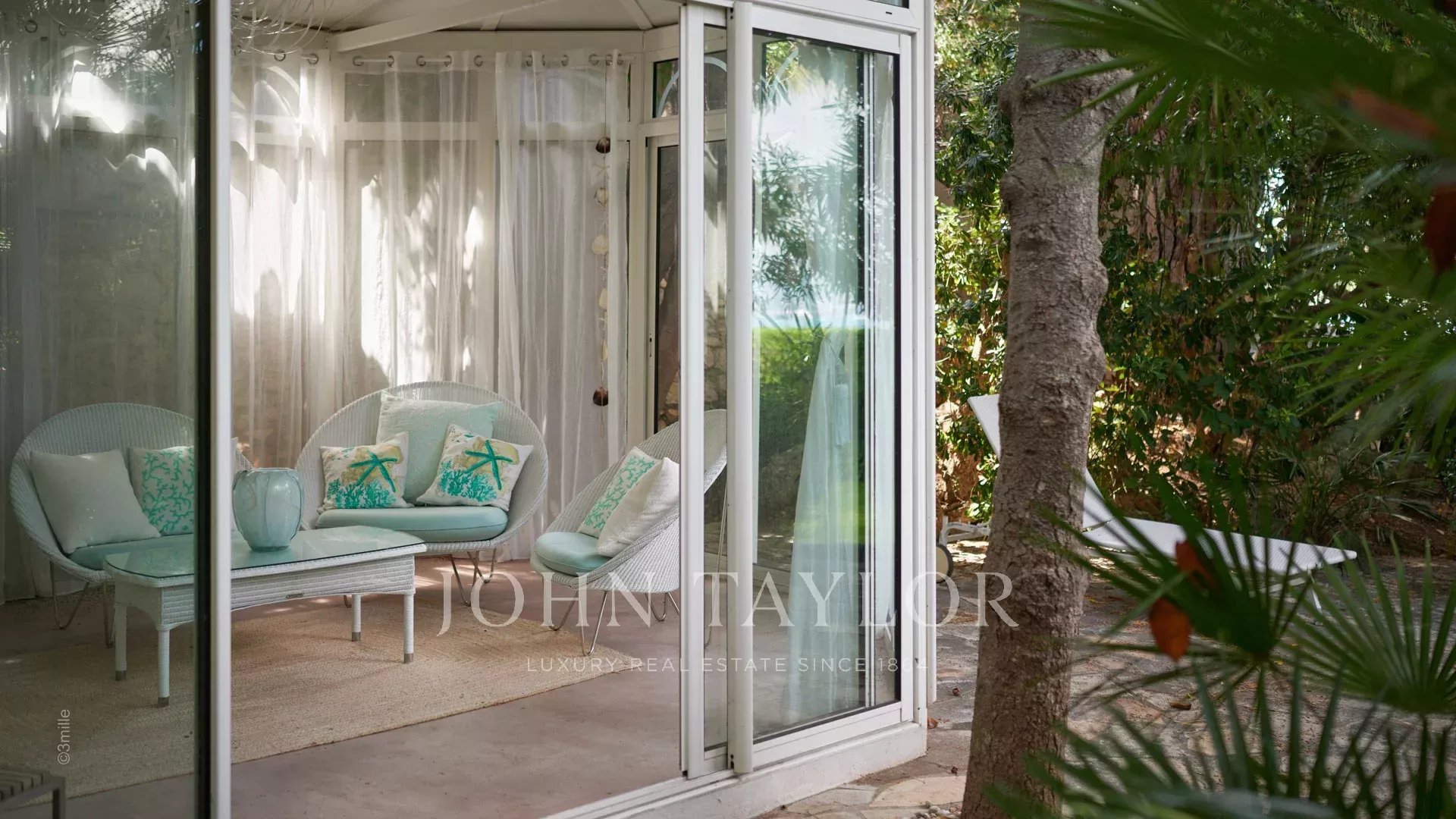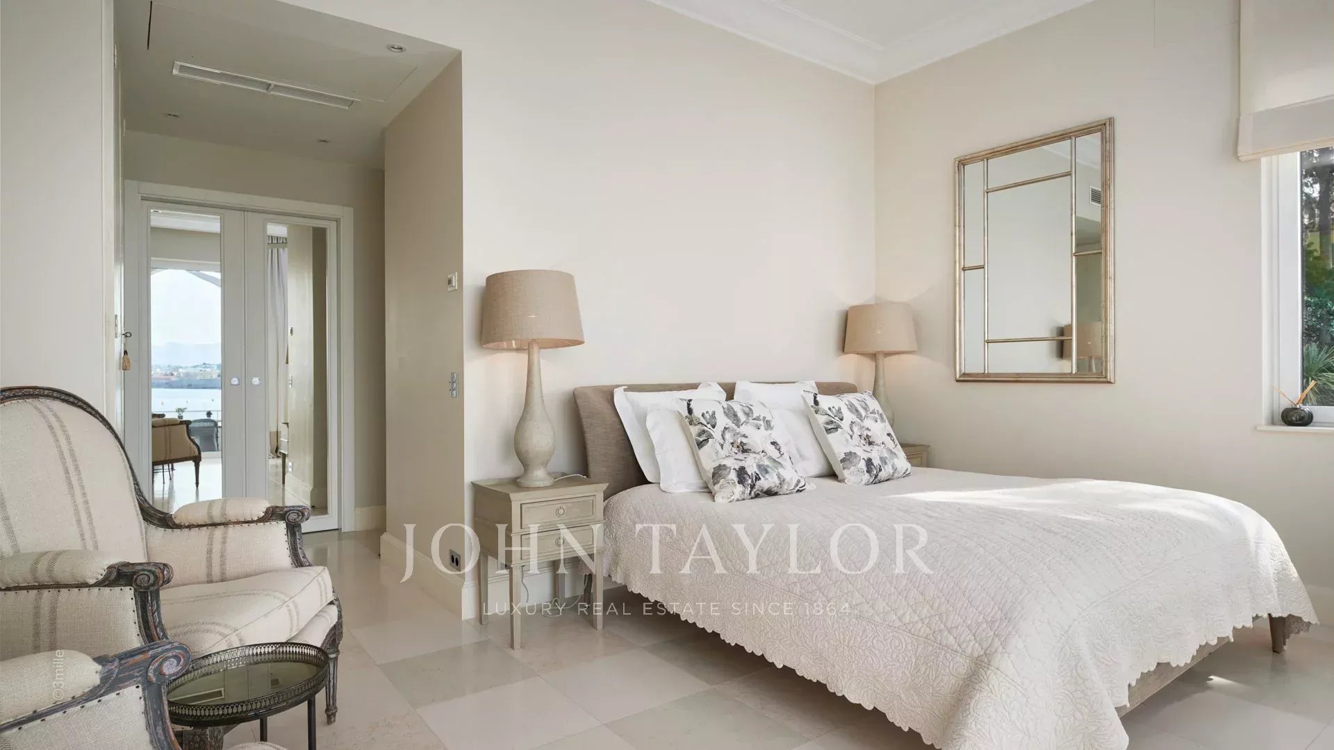 L'entrée vous guide vers une vaste réception ouvrant sur une magnifique terrasse avec vue sur la mer et le vieil Antibes, comprenant un salon et une salle à manger pouvant accueillir 12 personnes.