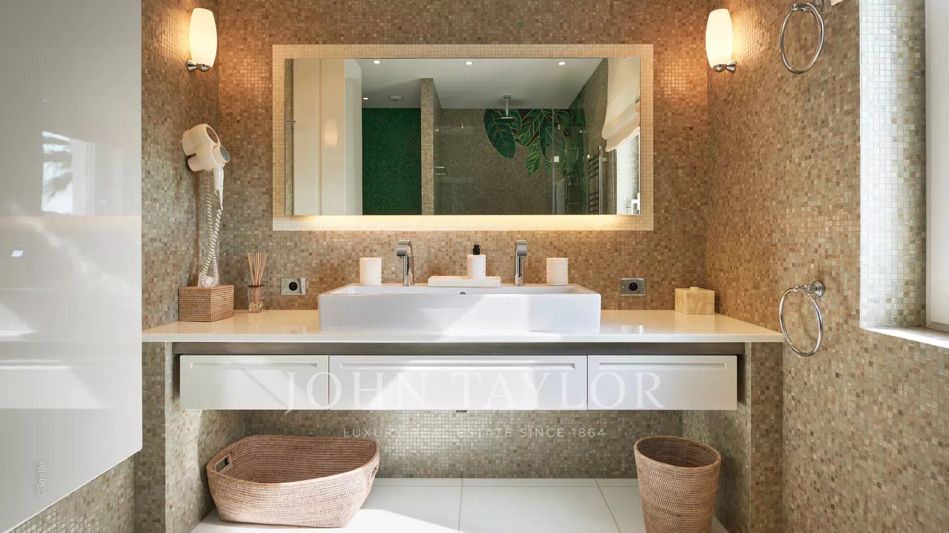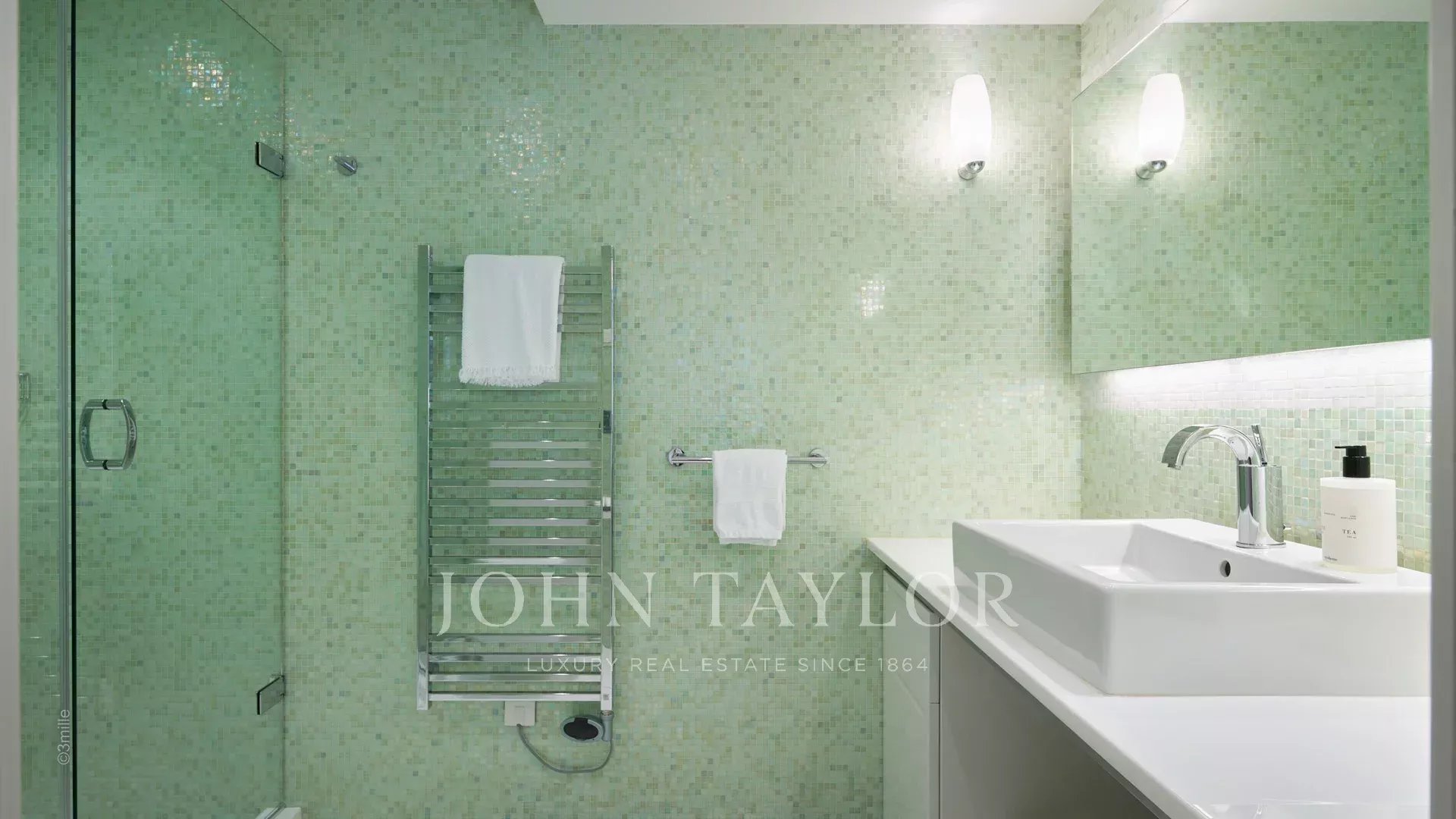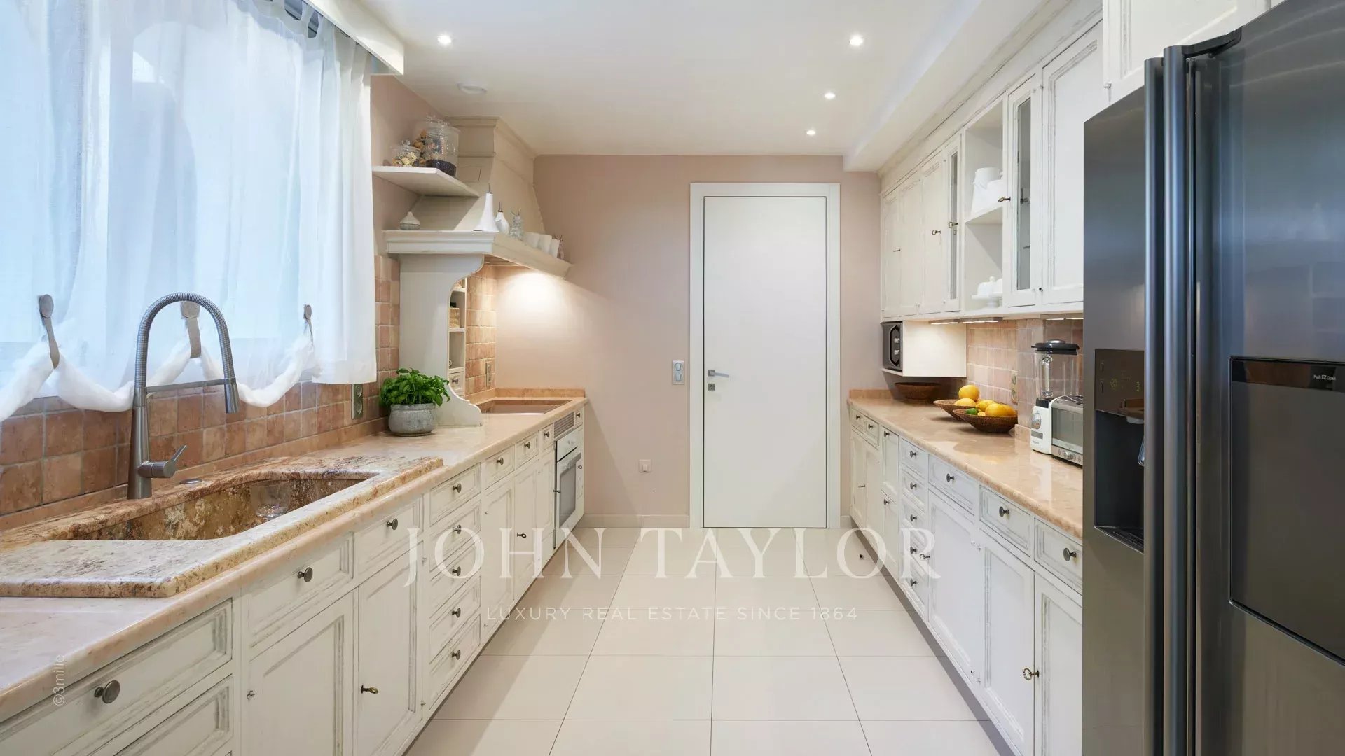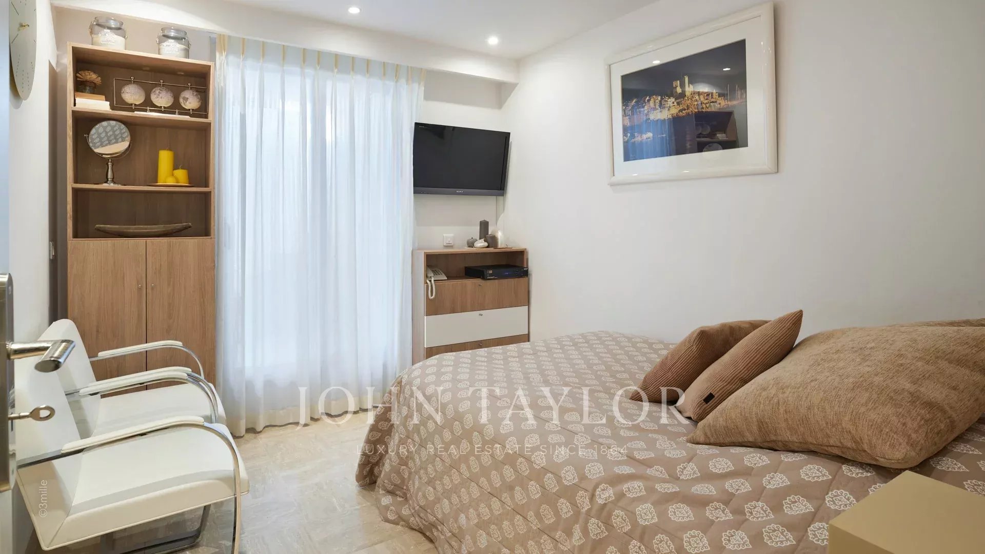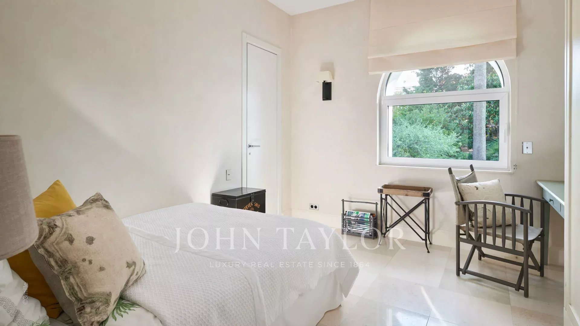L'entrée vous guide vers une vaste réception ouvrant sur une magnifique terrasse avec vue sur la mer et le vieil Antibes, comprenant un salon et une salle à manger pouvant accueillir 12 personnes.
