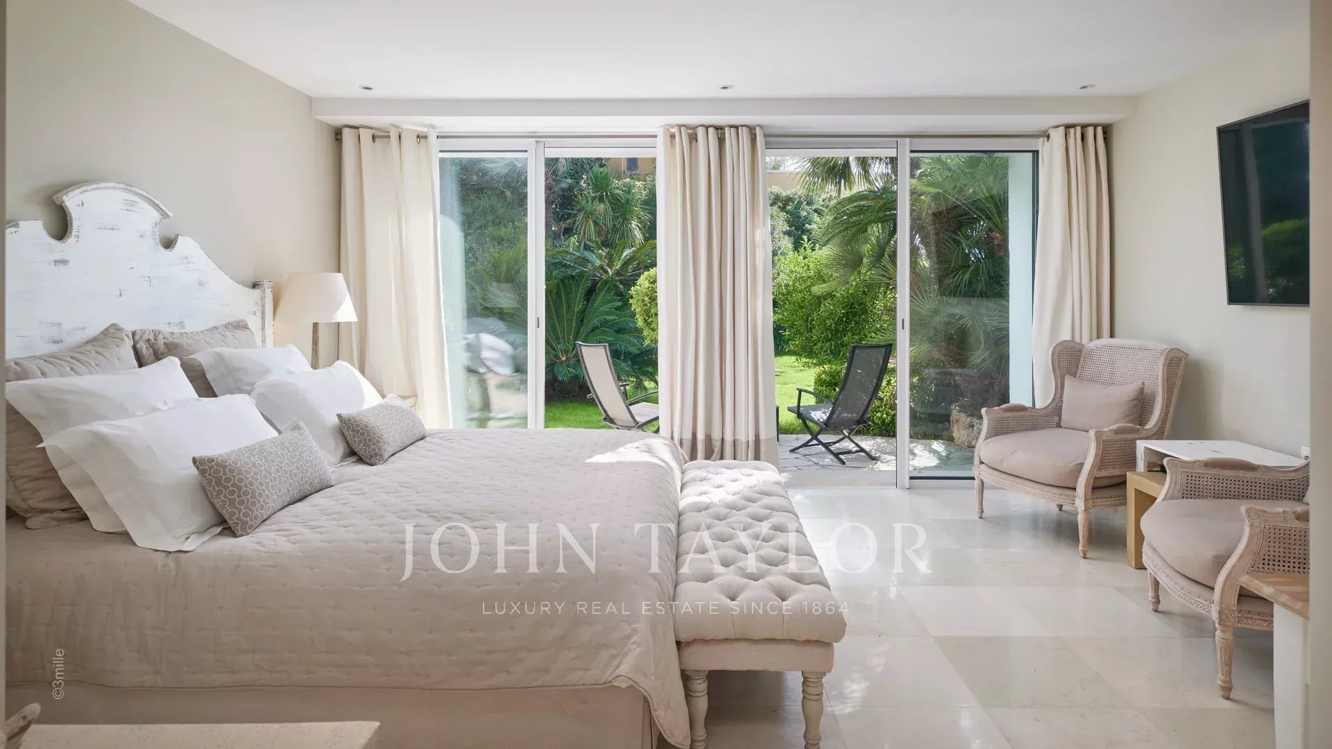 La Chambre de Maître, avec un lit double, une télévision, s'ouvre sur une terrasse, incluant un dressing et une salle de douches/WC.