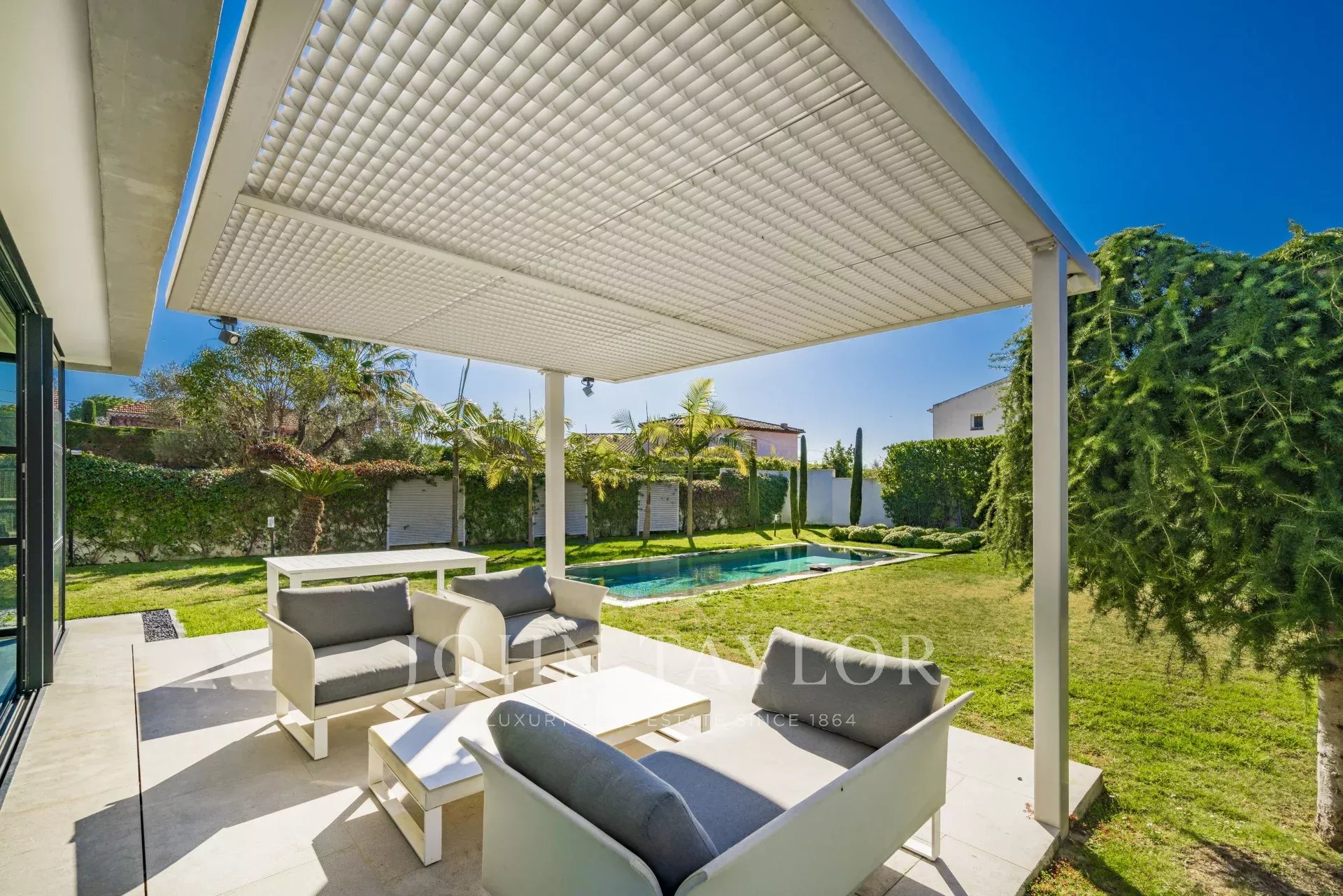 Belle villa contemporaine terminée à l'été 2020, offrant 320 m² de surface habitable au coeur d'un terrain plat de 940 m² et bénéficiant de belles vues sur la mer (la baie de Juan les Pins et les Iles de Lerins) depuis sa terrasse sur le toit.