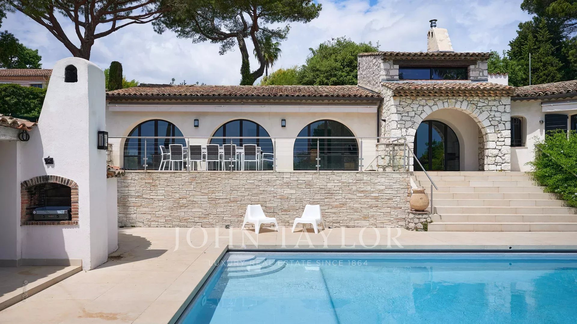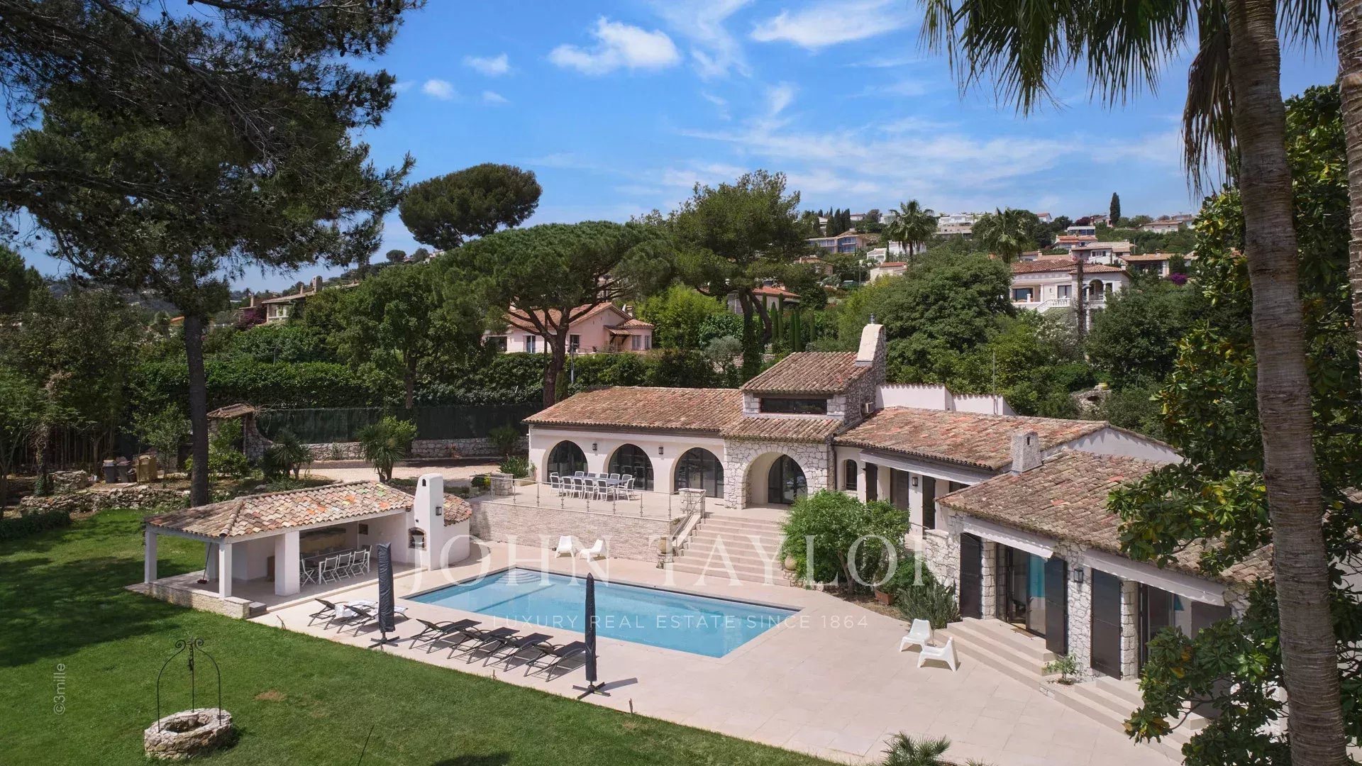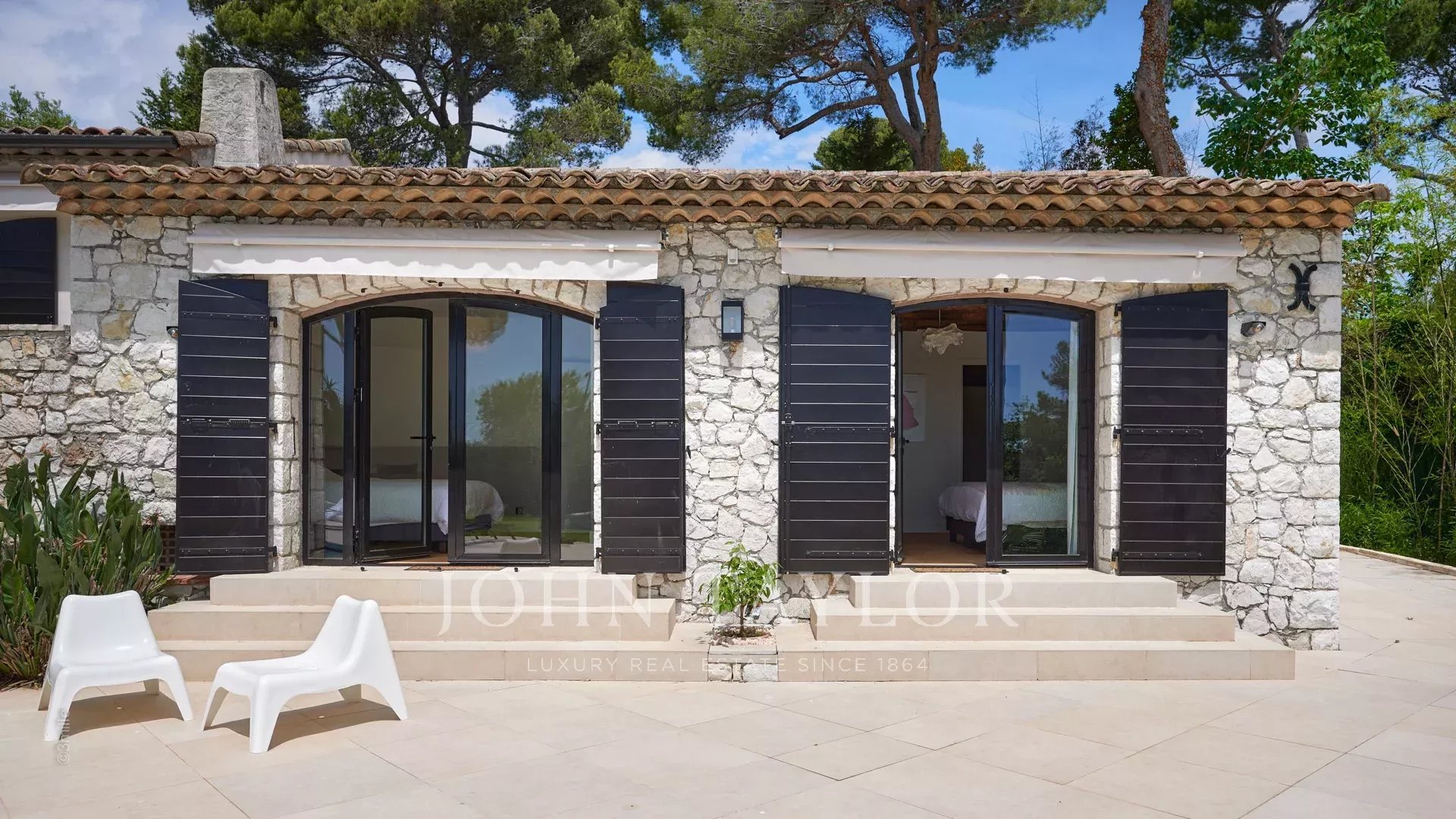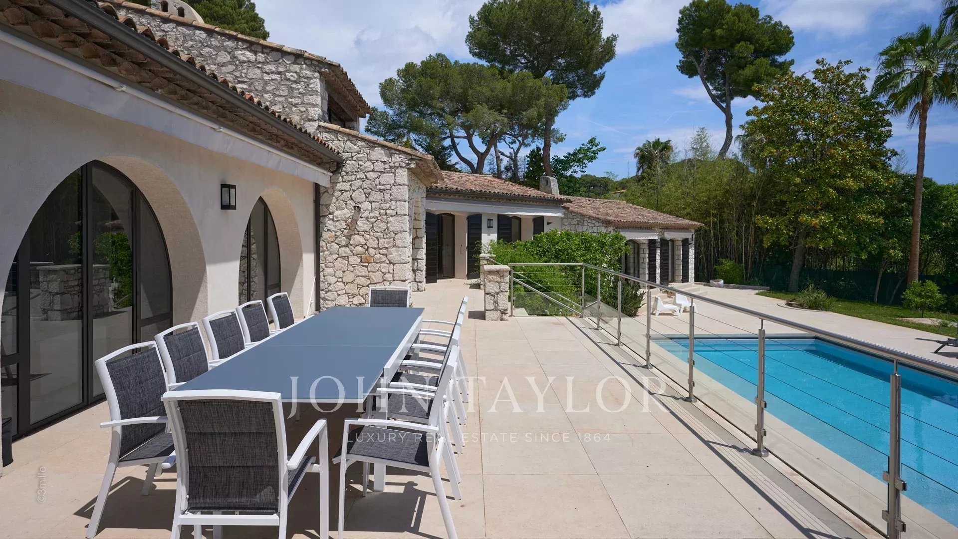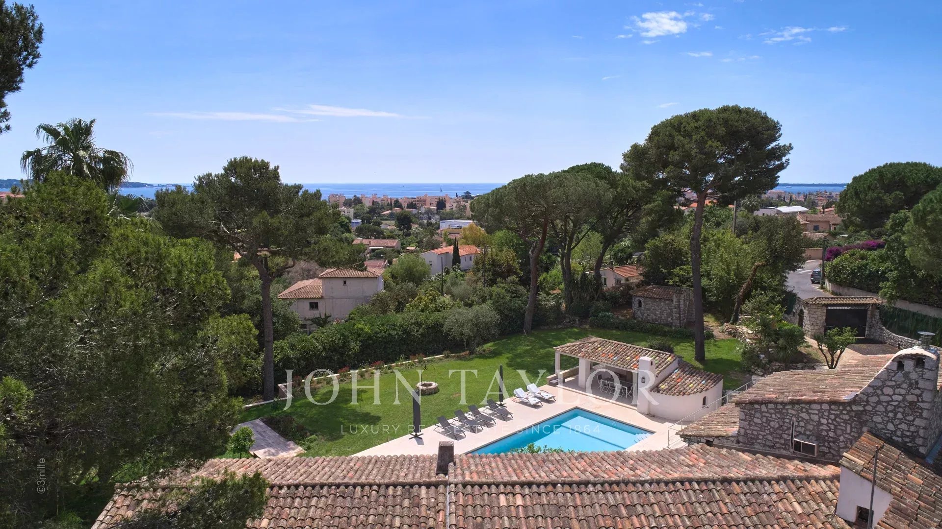 Sur les hauteurs de Golfe-Juan, à 10 minutes en voiture de ses plages et restaurants, dans un quartier résidentiel, belle villa provençale entièrement rénovée et climatisée offrant 300 m2 habitables, sur trois niveaux, au cœur d’un terrain plat de 3 000 m2. Petite vue mer.