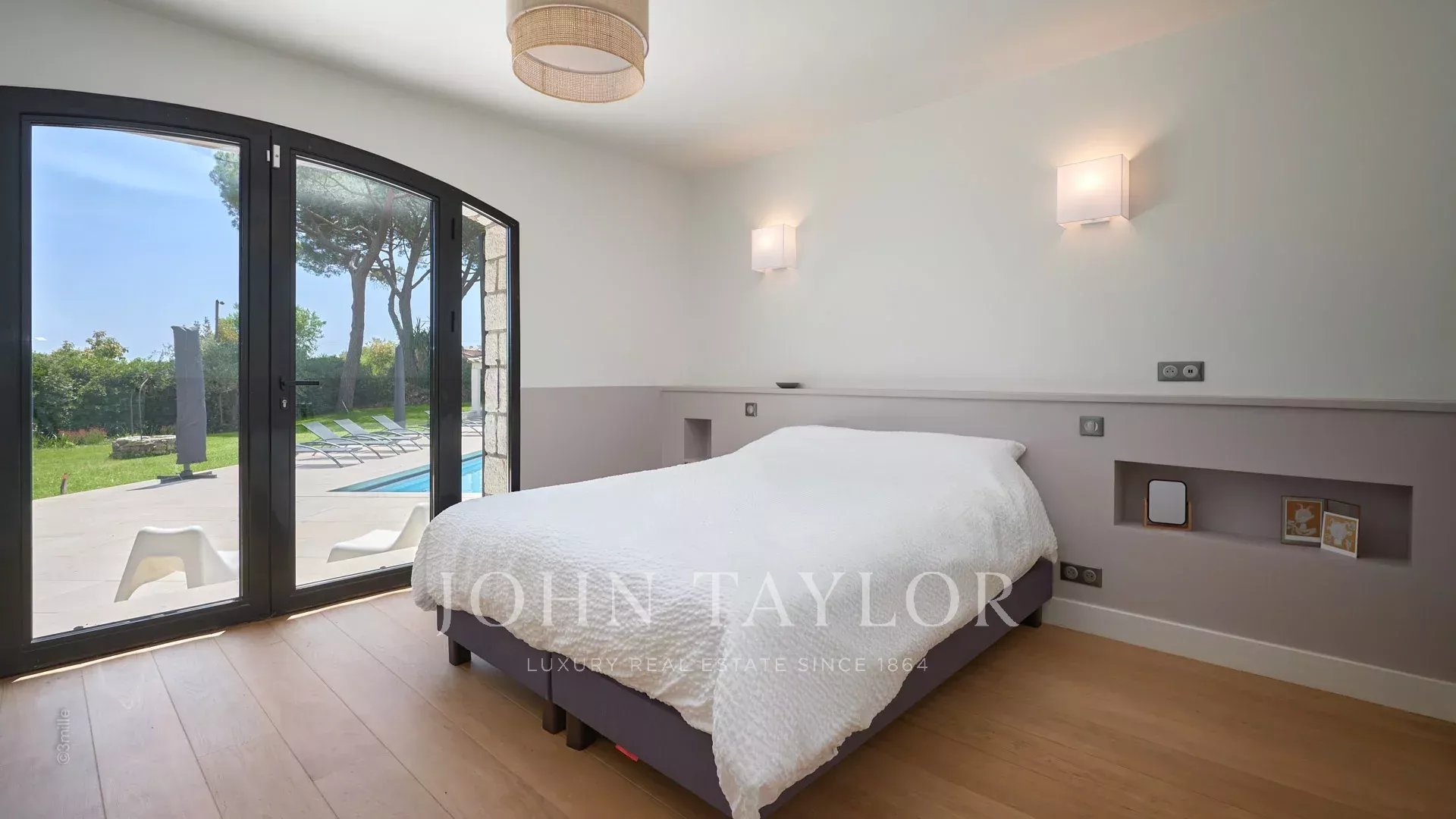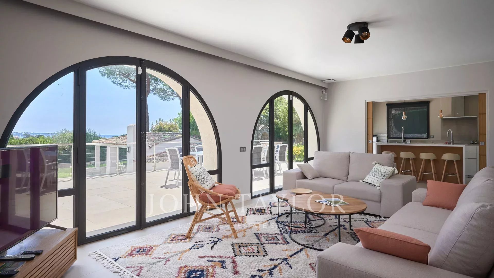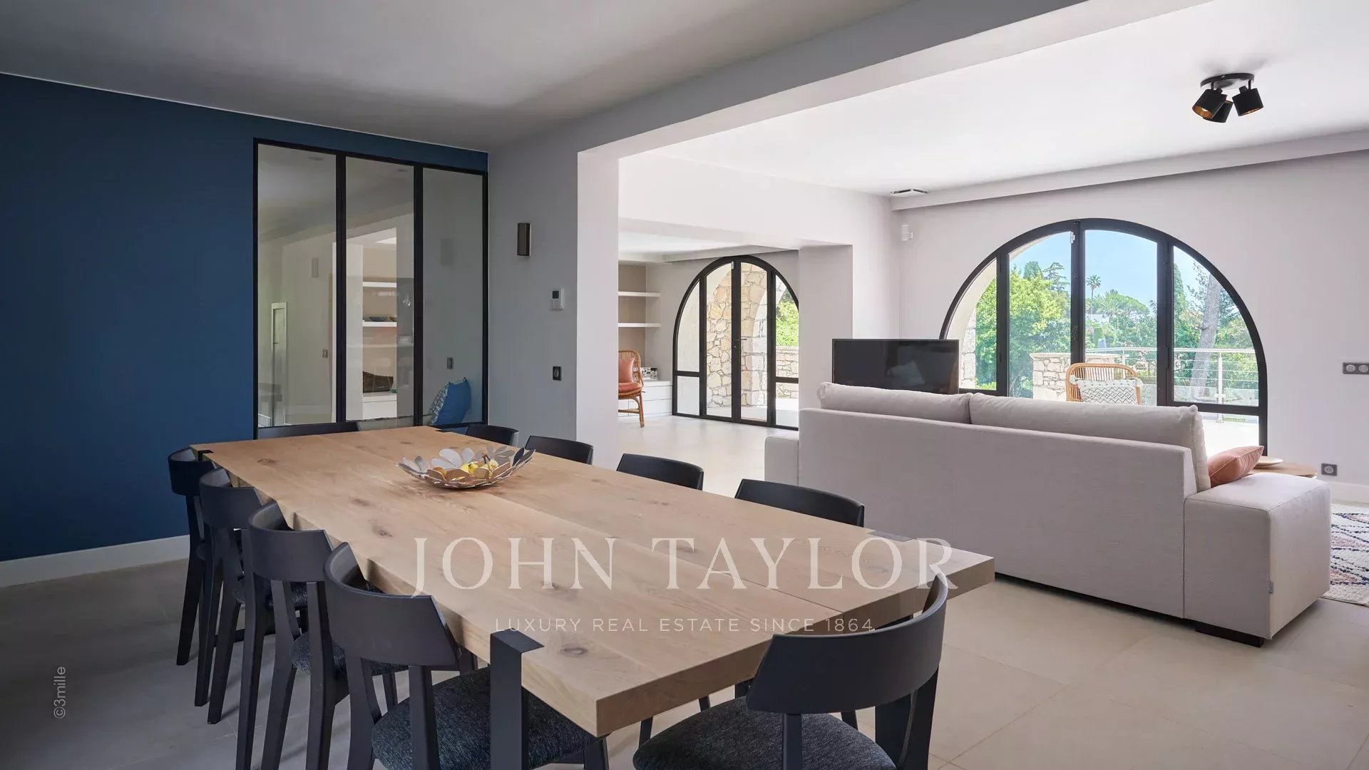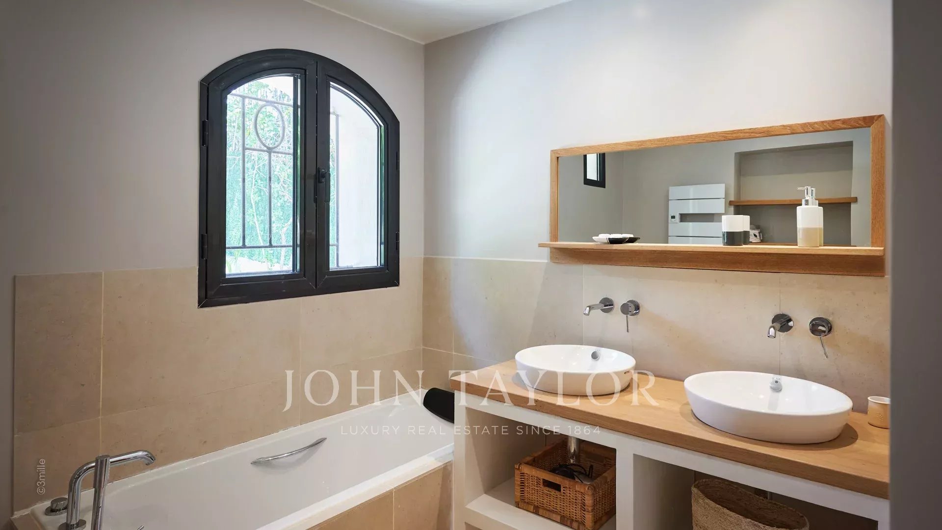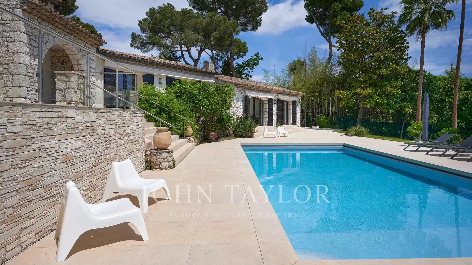 Sur les hauteurs de Golfe-Juan, à 10 minutes en voiture de ses plages et restaurants, dans un quartier résidentiel, belle villa provençale entièrement rénovée et climatisée offrant 300 m2 habitables, sur trois niveaux, au cœur d’un terrain plat de 3 000 m2. Petite vue mer.
