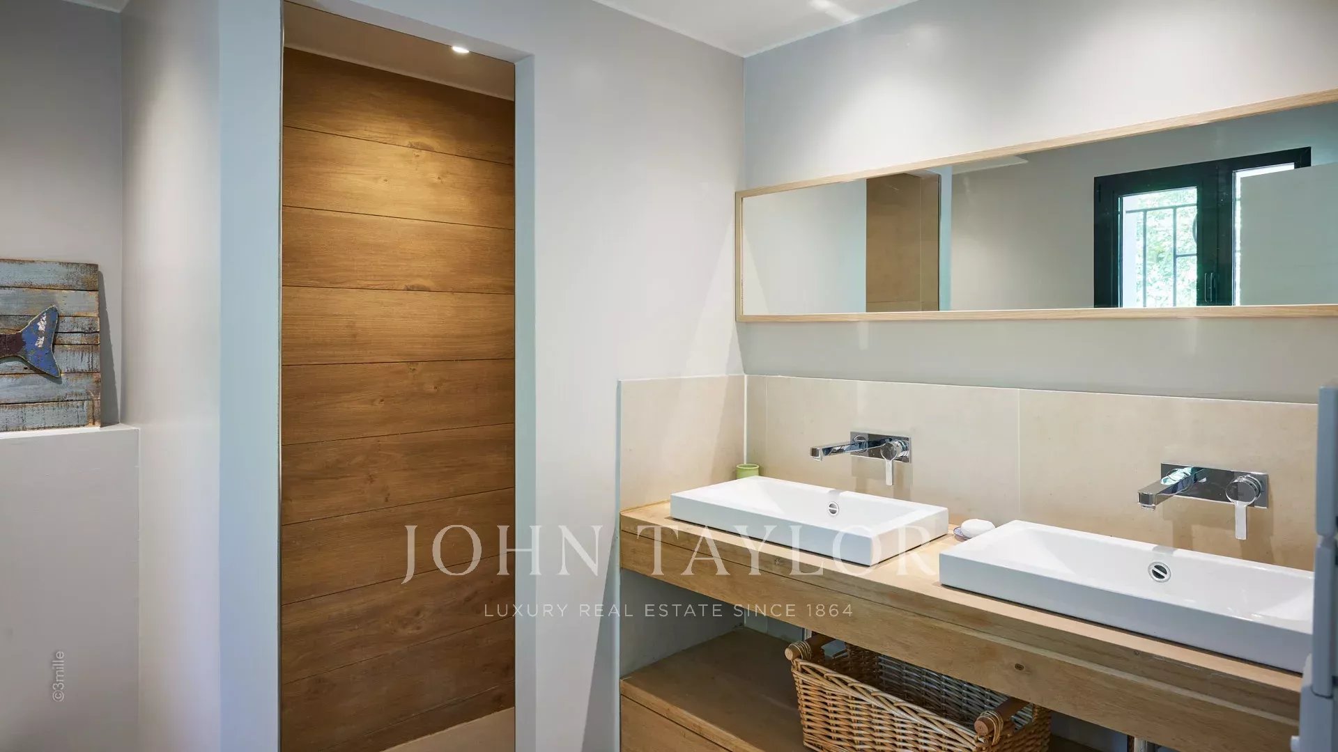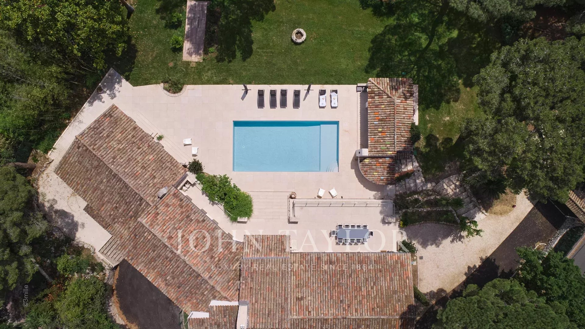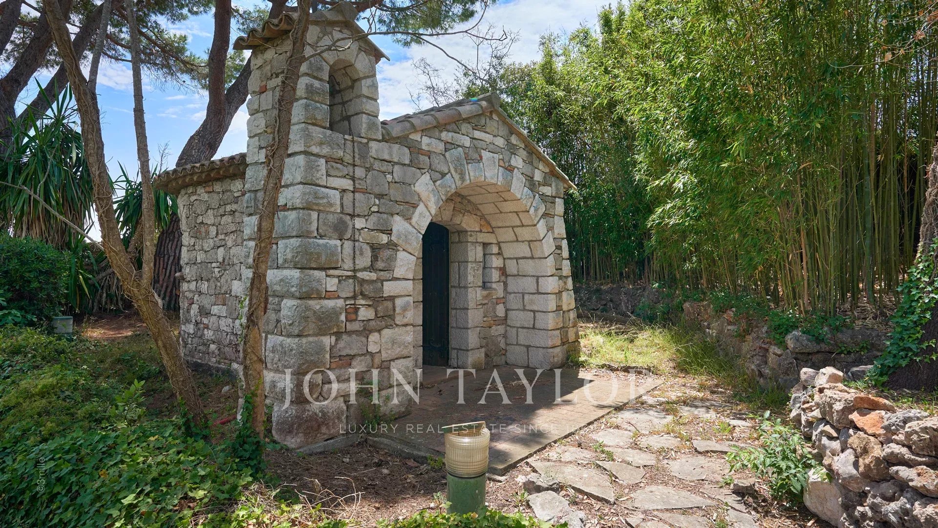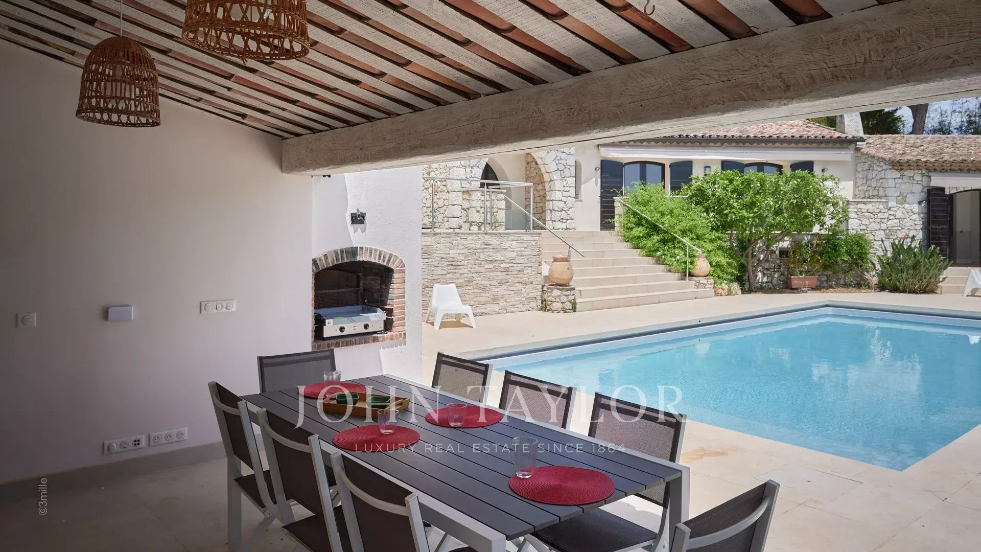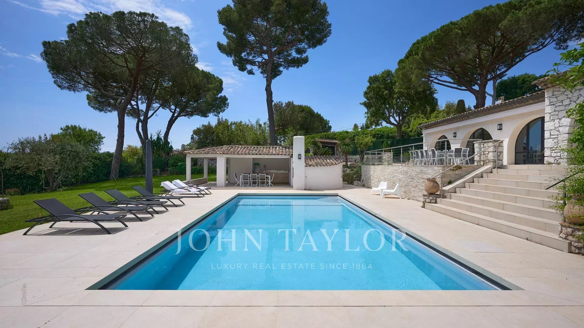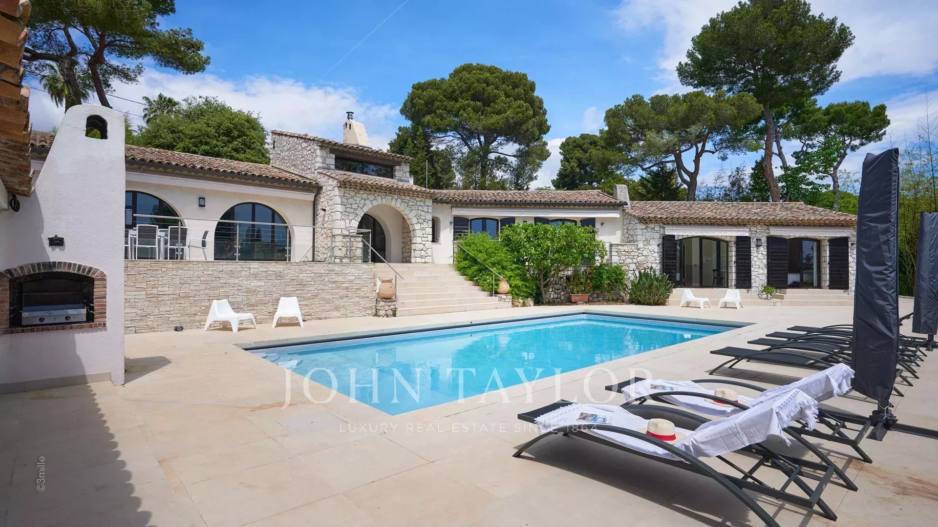 Sur les hauteurs de Golfe-Juan, à 10 minutes en voiture de ses plages et restaurants, dans un quartier résidentiel, belle villa provençale entièrement rénovée et climatisée offrant 300 m2 habitables, sur trois niveaux, au cœur d’un terrain plat de 3 000 m2. Petite vue mer.